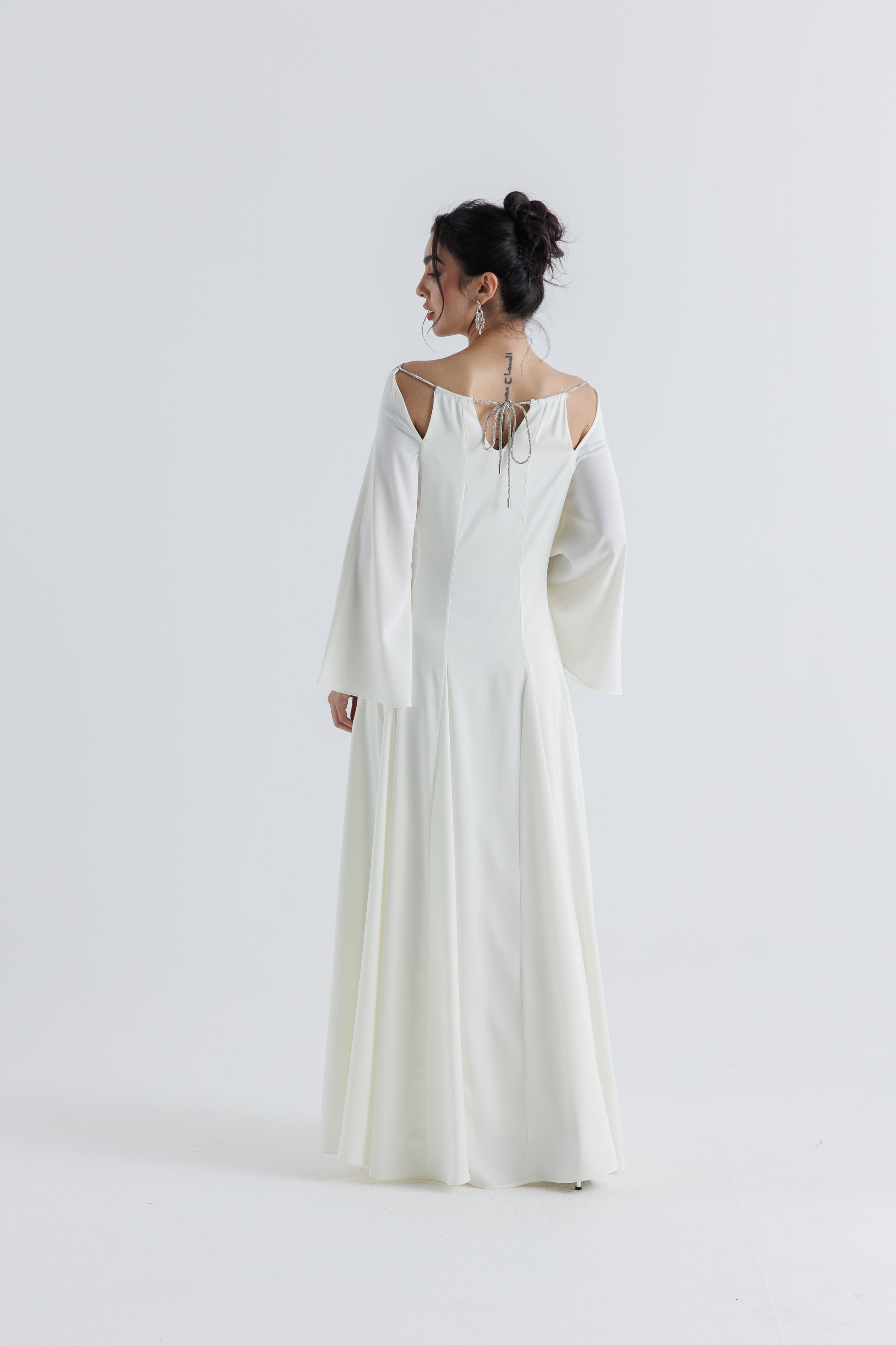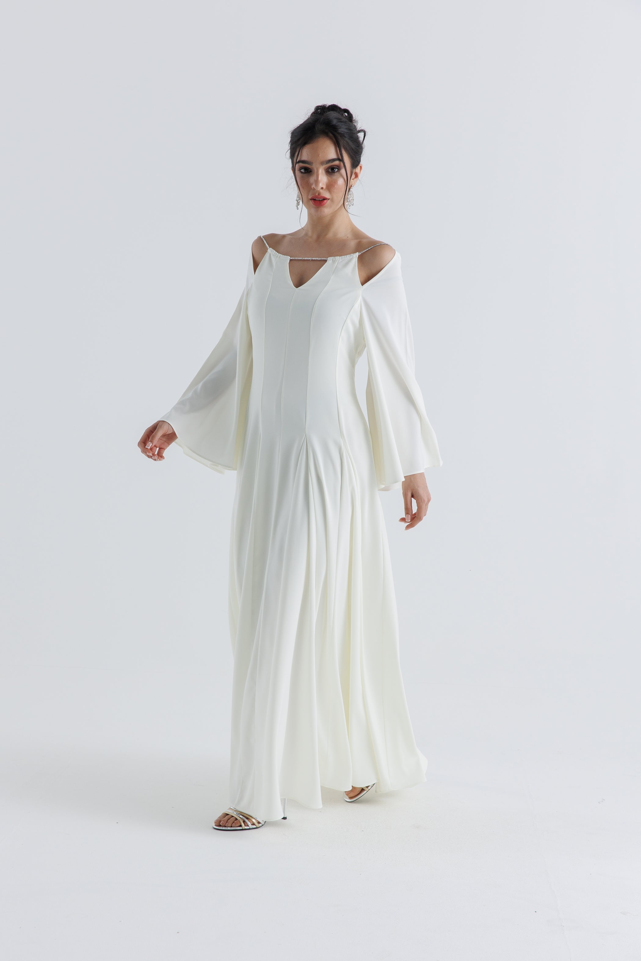Design: A-line gown with cold shoulder cut and flared sleeves