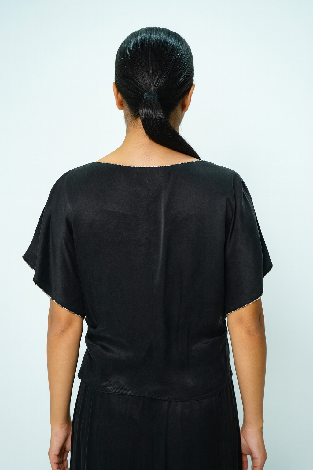 بلوزة أنثوية أنيقة تتميز بياقة دائرية ناعمة وأكمام قصيرة مزينة بخط دانتيل فاخر. صُممت بتجاعيد خفيفة عند...