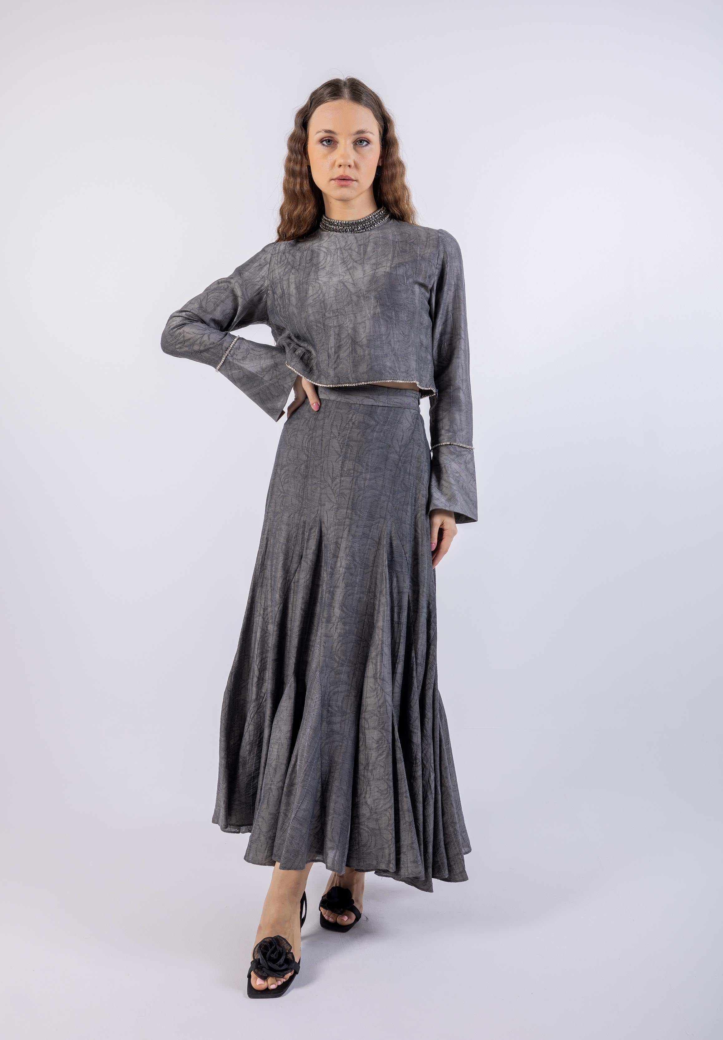 أبرزي أناقتك الراقية مع هذا التوب القصير المصمم بنقشة فنية ناعمة ولمسات كريستالية لامعة تزين الياقة، الأكمام، والحافة السفلية. يتميز بقصة هيكلية أنيقة وياقة مستديرة محافظة، بينما تضيف الأكمام الواسعة قليلاً لمسة أنثوية ناعمة. يمكن ارتداؤه مع التنورة المطابقة لإطلالة متناسقة أو تنسيقه بشكل منفصل لإطلالة عصرية فريدة. يُمكن تنسيقه مع التنورة كود 2501007 للحصول على مظهر متكامل.