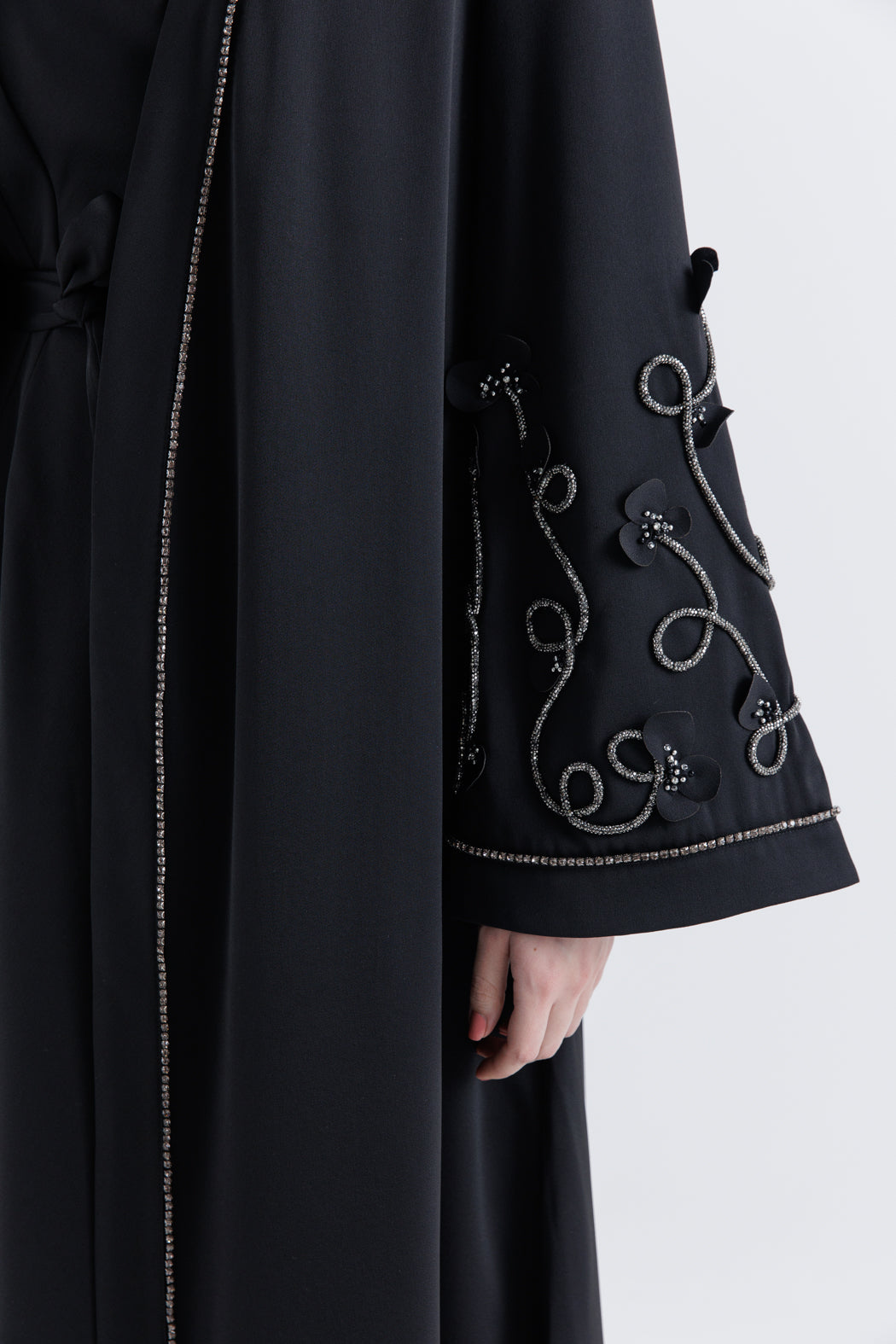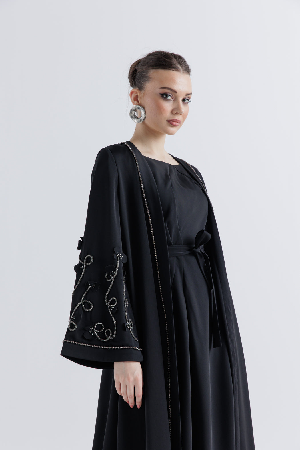 ✔️ الأكمام: أكمام واسعة ومميزة مزينة بـ تطريزات خرزية يدوية وزخارف زهرية، تضيف لمسة فاخرة لا تُضاهى.