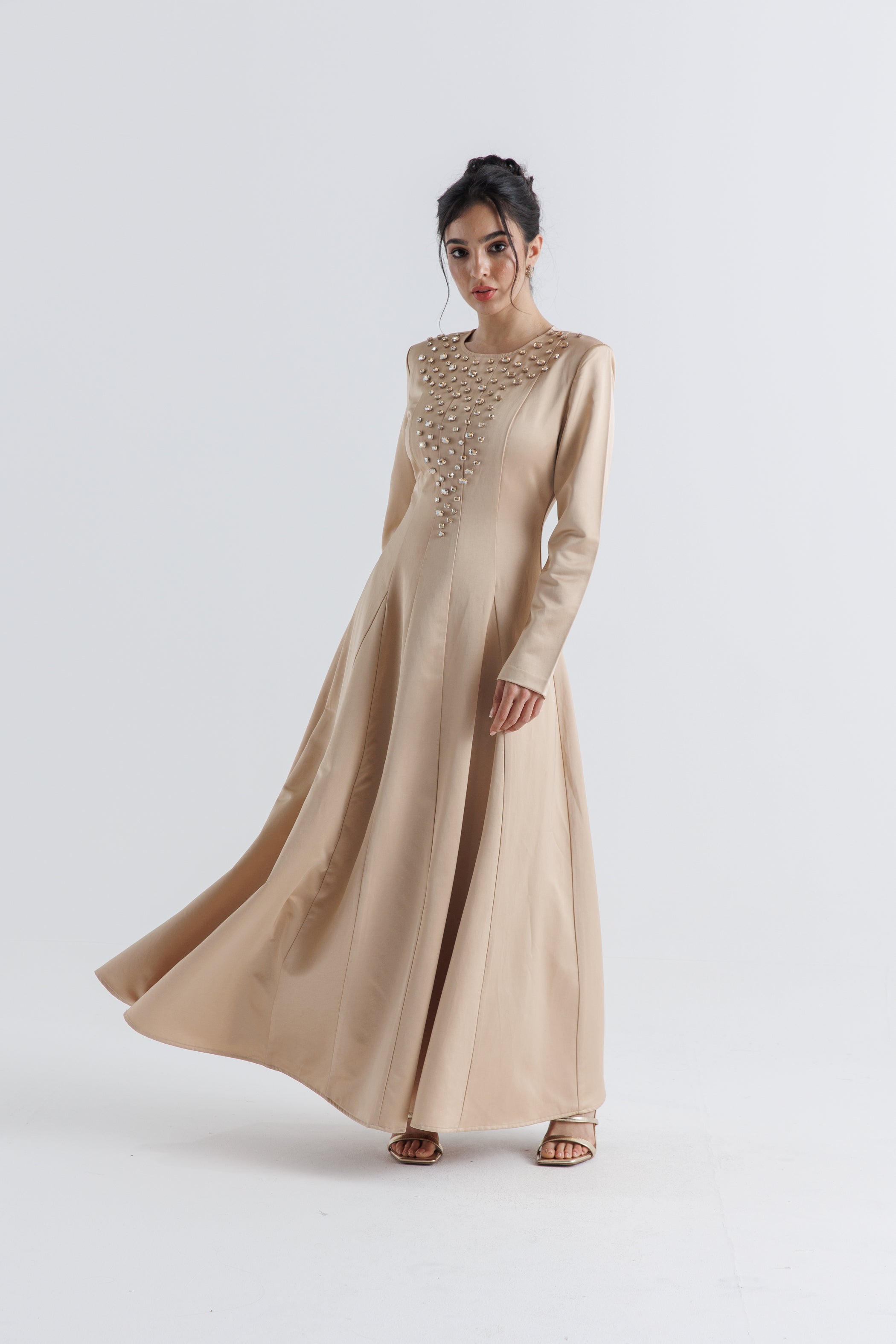 تألقي بإطلالة راقية مع هذا الفستان الطويل المصمم بقصة A-line، والمزين بتفاصيل كريستالية لامعة على منطقة الصدر. يتميز بياقة دائرية ناعمة وأكمام طويلة لإطلالة أنيقة محافظة، بينما تضيف الخطوط الانسيابية واللمعة الحريرية لمسة فاخرة مثالية للمناسبات الخاصة.