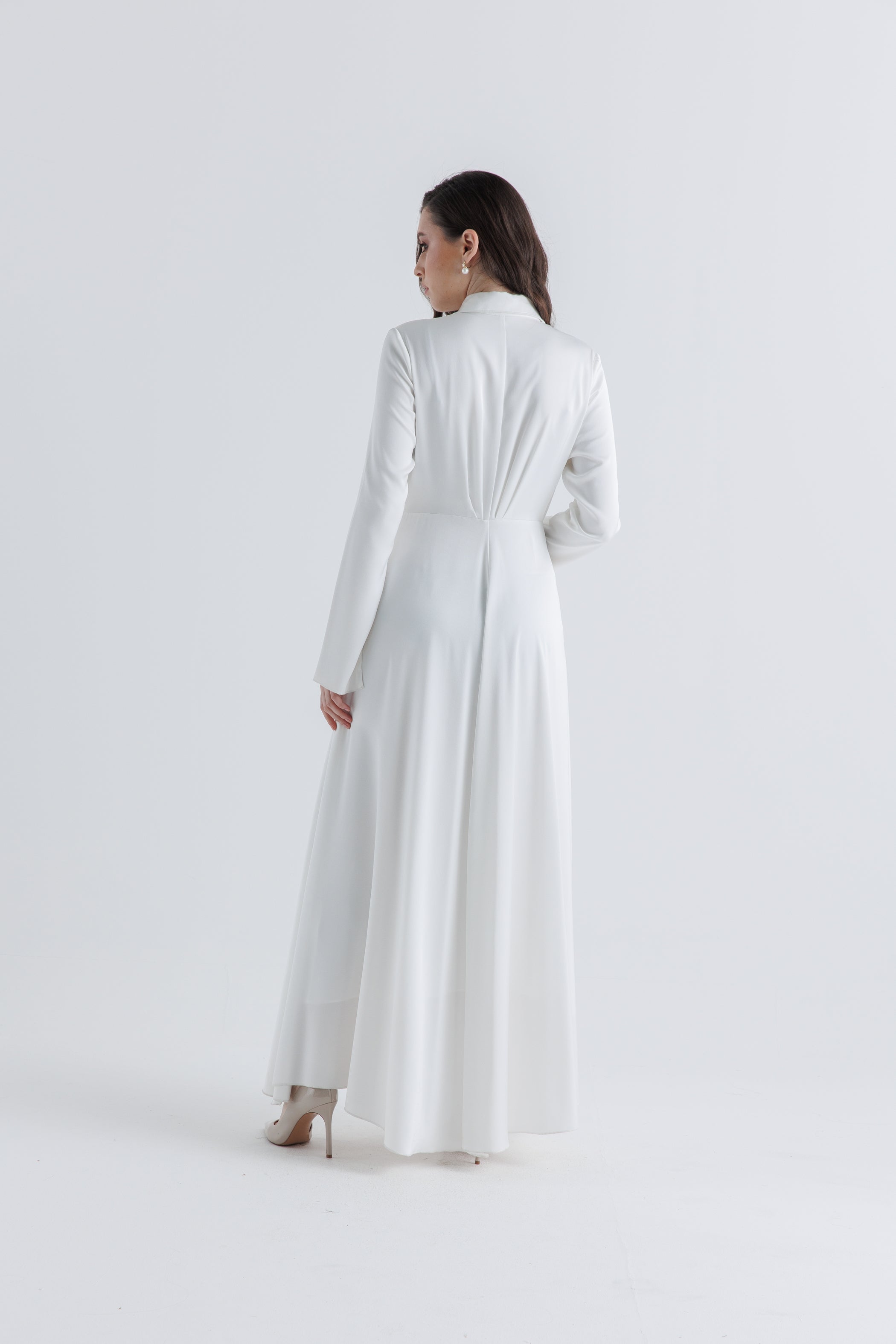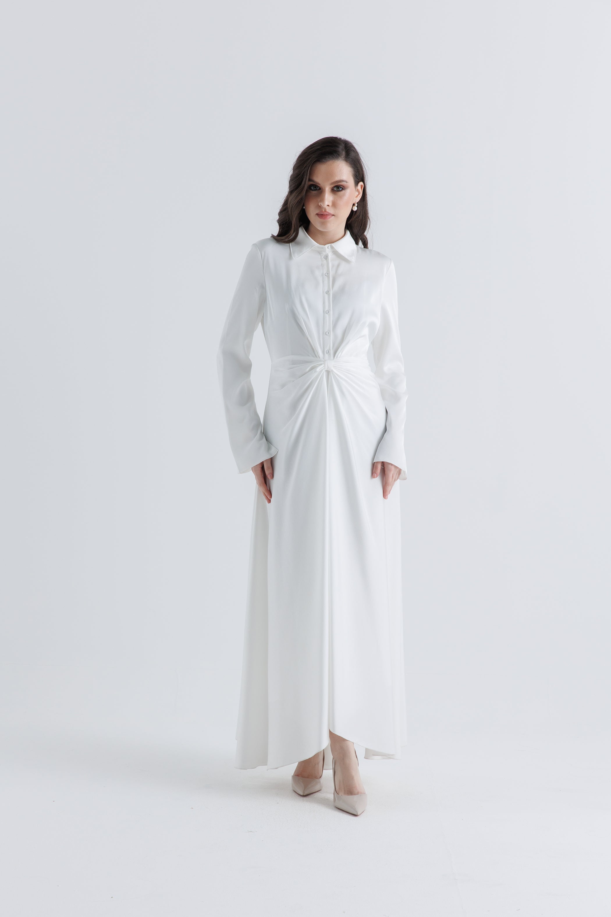 أضيفي لمسة من الرقي إلى خزانتك مع هذا الفستان الماكسي العصري بتصميم الكسرات الأمامية الأنيقة عند الخصر، والتي تضيف انسيابية وجاذبية للتصميم. يتميز الفستان بجزء علوي مصمم بدقة مع ياقة مدببة وصف أزرار أمامي، بينما يمنح الذيل الطويل والقصير لمسة عصرية أنثوية. الفستان مبطن بالكامل لضمان الراحة والتغطية، مما يجعله خياراً مثالياً للمناسبات الرسمية أو الإطلالات الراقية المحتشمة.