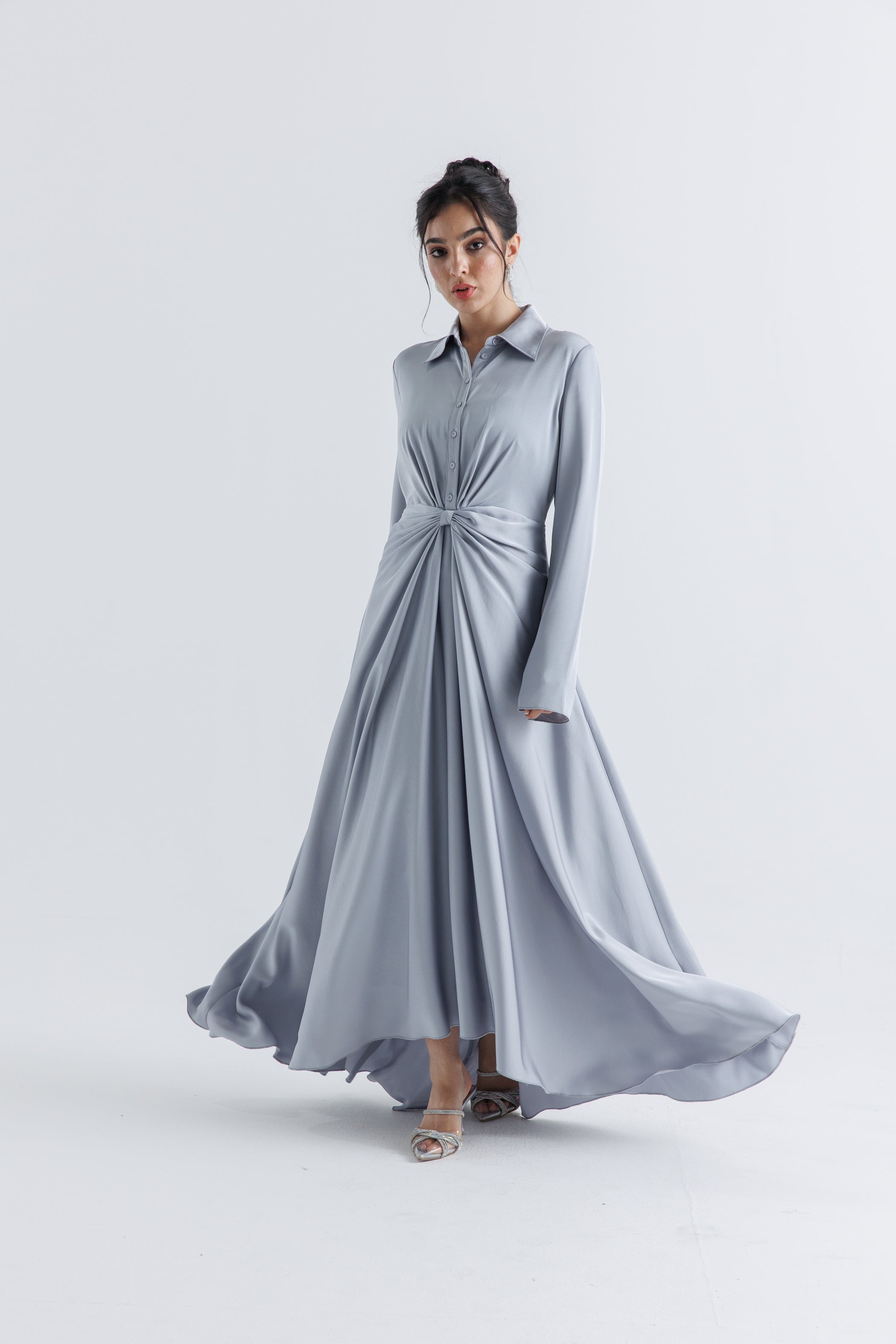 • التصميم: فستان طويل بكسرات أمامية وانسدال ناعم