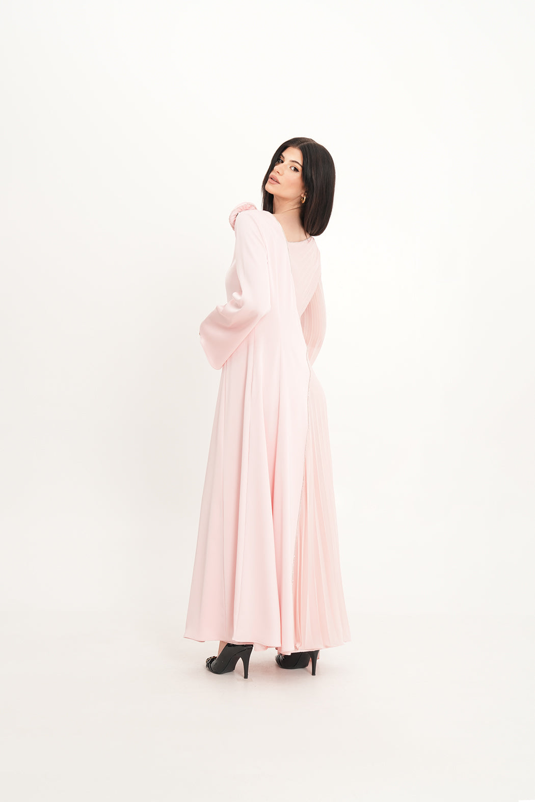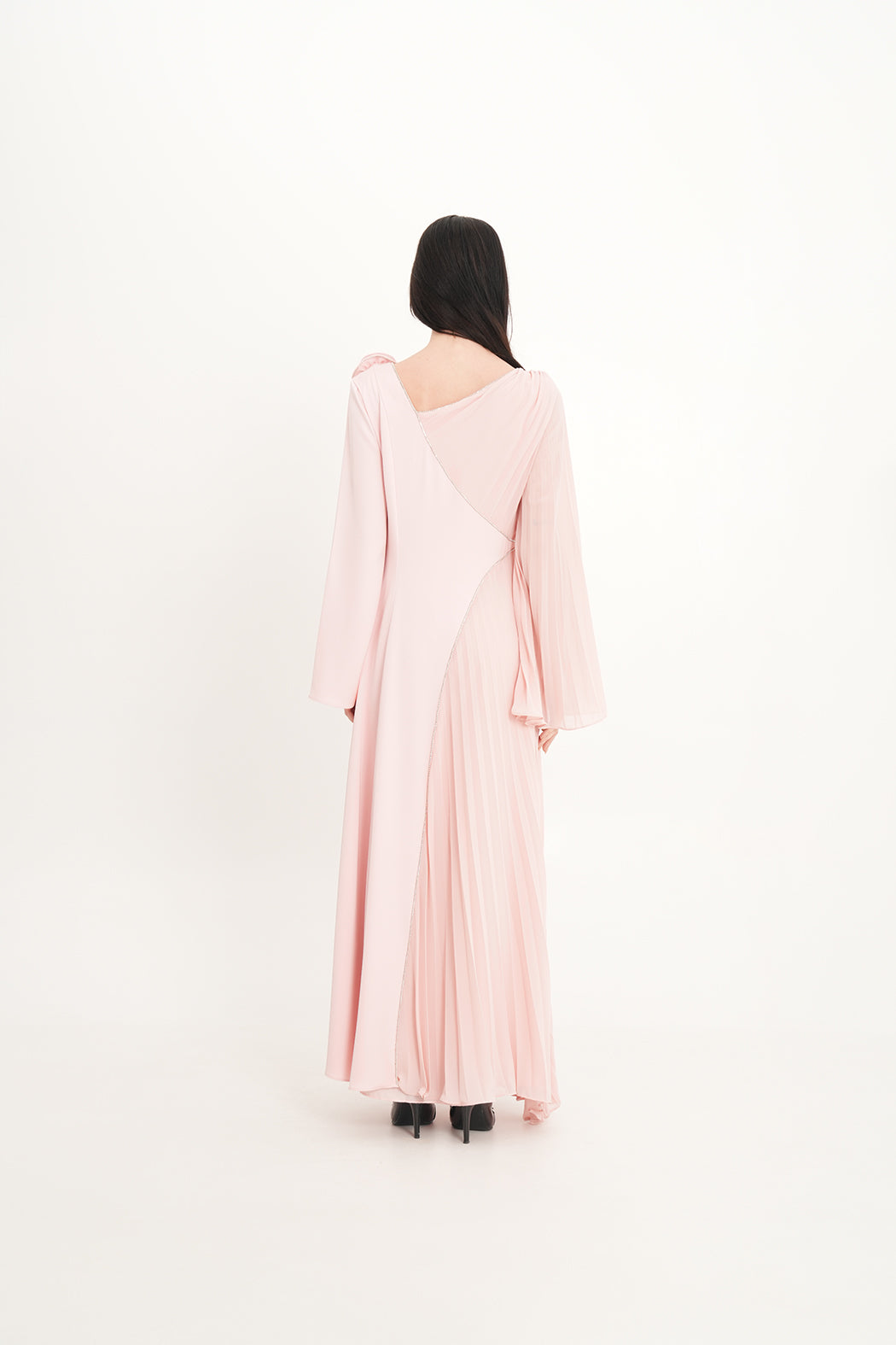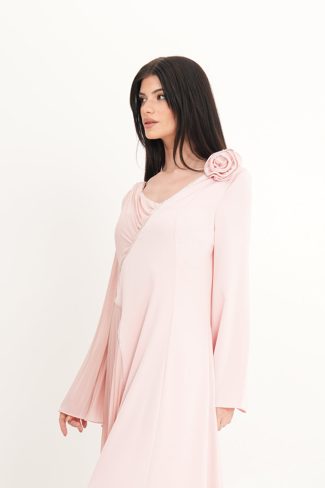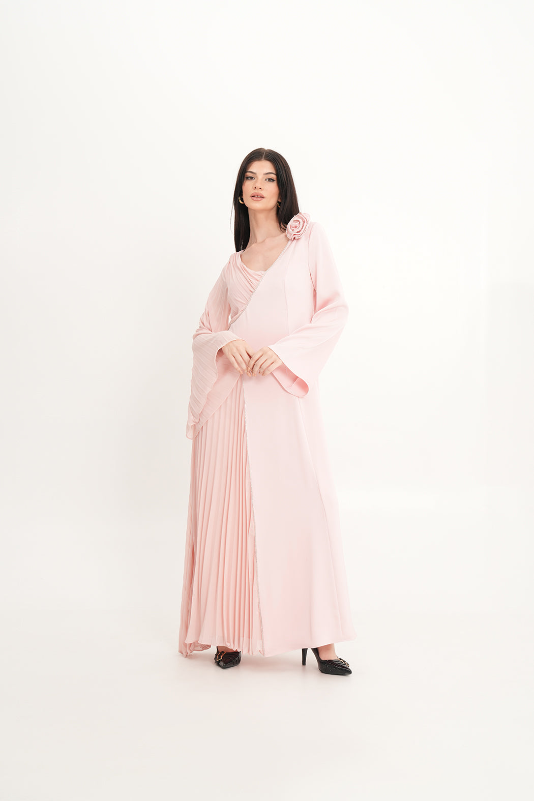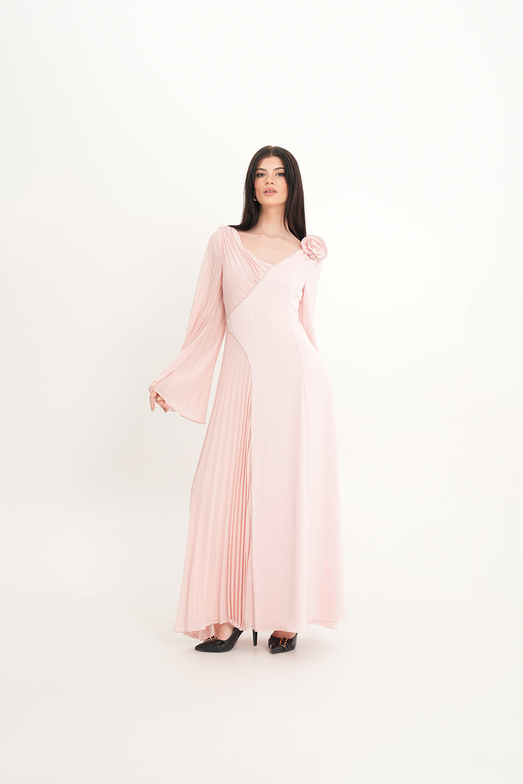 فستان أنيق بطول كامل مصنوع من مزيج ناعم من الشيفون والساتان، يتميز بتصميم غير متماثل يضفي لمسة انسيابية أنثوية مع كسرات جانبية تضيف حركة راقية. يأتي بياقة على شكل V بطيات ناعمة تضفي لمسة فاخرة، وتكتمل أناقته بوردة مزينة على الكتف تضيف لمسة رومانسية. كما تبرز خطوط التصميم بزخارف كريستالية ناعمة تضيف بريقًا رقيقًا. مثالي للمناسبات الرسمية والسهرات الراقية. الطول التقريبي: 145 سم.