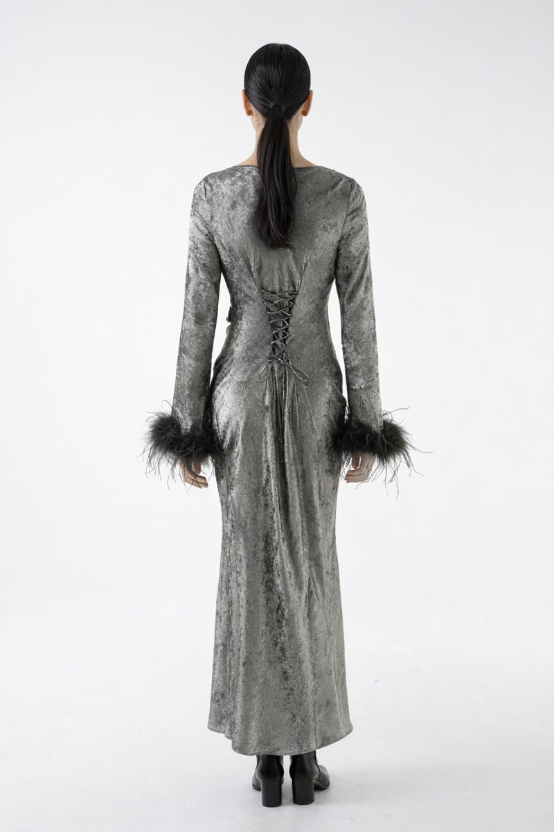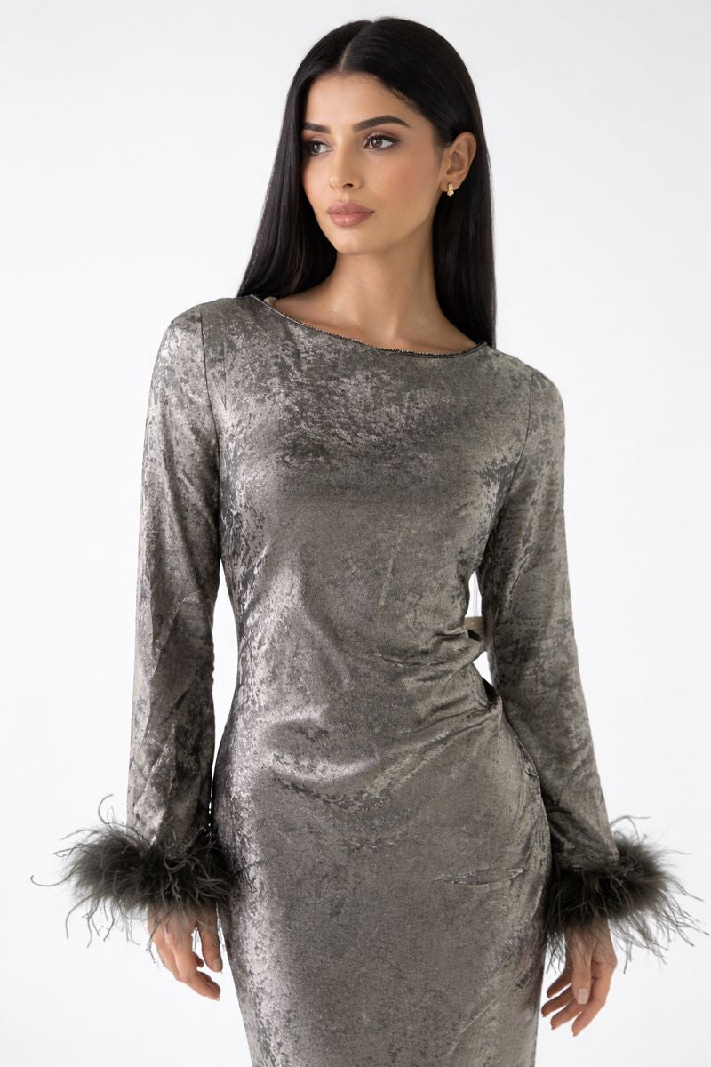 فستان ماكسي بقصّة غير متماثلة مع ياقة مزينة وأساور ريشية