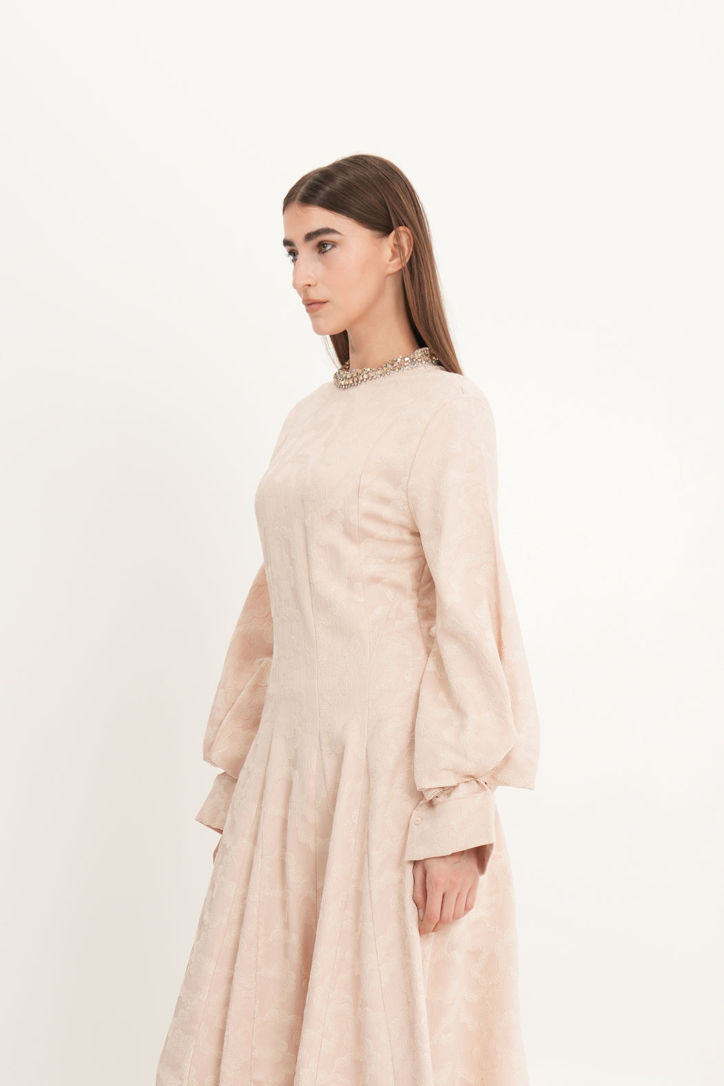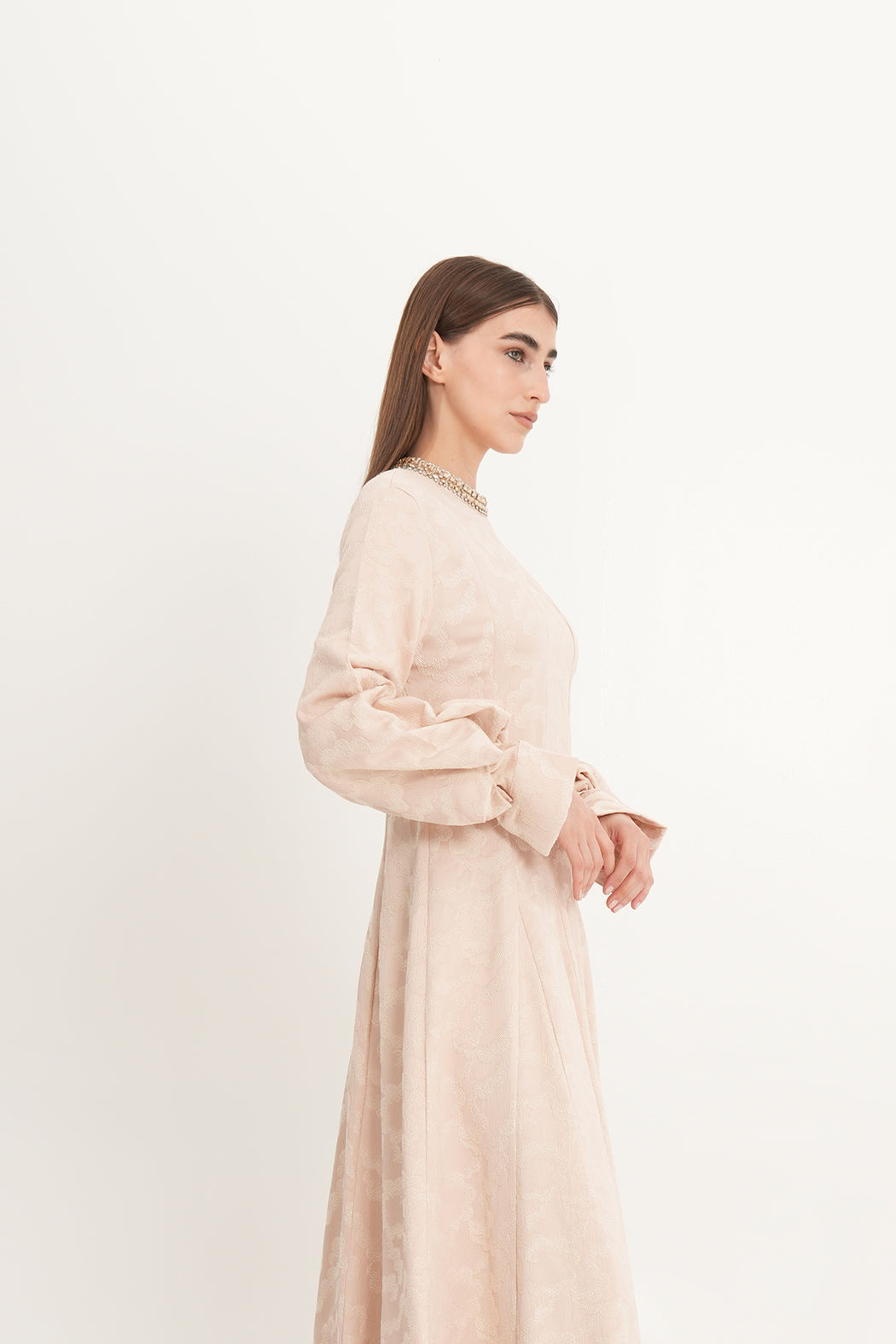 يلتقي الفخامة بالتفصيل في هذا الفستان الأنيق المصنوع من قماش الجاكار الفاخر، والمصمم خصيصًا للمناسبات الراقية. يتميز بقصة A واسعة تنسدل بانسيابية بطول تقريبي 135 سم، مع نقشات بارزة تضيف عمقًا ولمعانًا ناعمًا. أما الرقبة العالية فهي مزينة بتفاصيل براقة تضفي لمسة فاخرة. الأكمام الطويلة والمنفوخة مع الأساور الهيكلية تضيف طابعًا ملكيًا عصريًا لتصميم خالد.