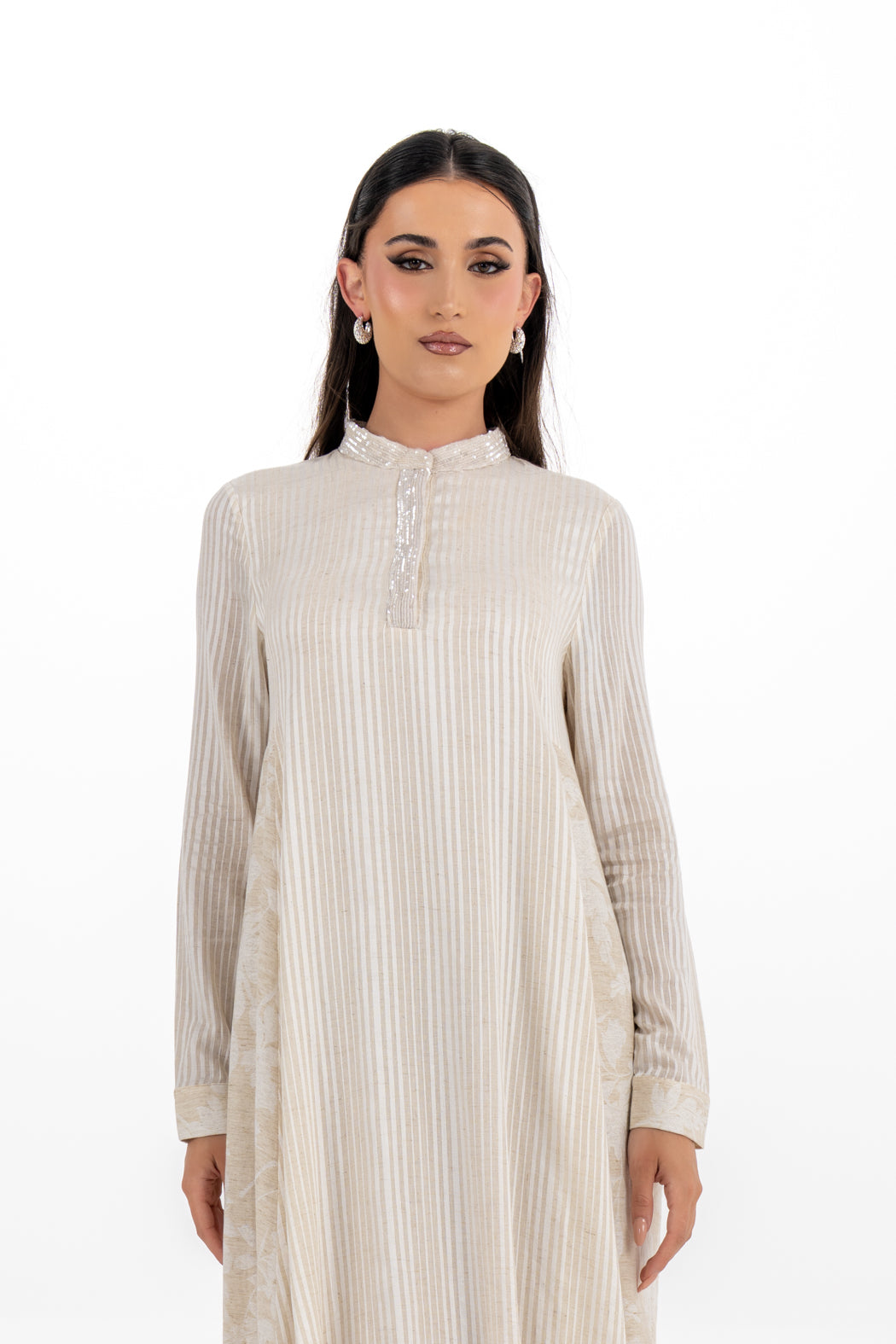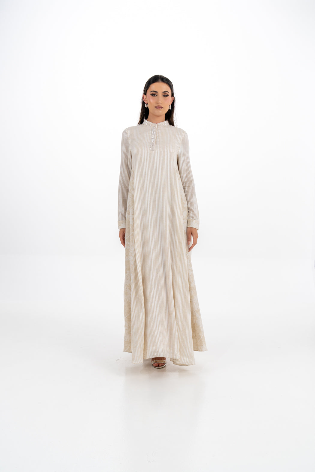 تألقي بأناقة كلاسيكية مع هذا الفستان الماكسي المصمم بعناية، والذي يجمع بين الخطوط الطولية الرقيقة في الأمام ونقشة الزهور الهادئة في الجوانب والخلف. مصنوع من مزيج القطن والفيسكوز الناعم، وينساب بسلاسة ليمنحك مظهراً أنثوياً ومريحاً. تضيف ياقة الماندرين المزينة بالترتر لمسة من الرقي، مما يجعل هذا الفستان مثالياً للمناسبات غير الرسمية أو اللقاءات الخاصة. قصّته الواسعة تناسب مختلف أشكال الجسم وتمنحك شعوراً بالراحة طوال اليوم.