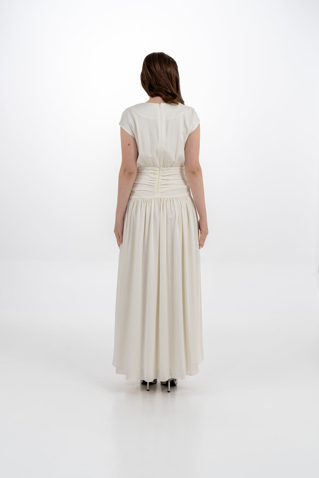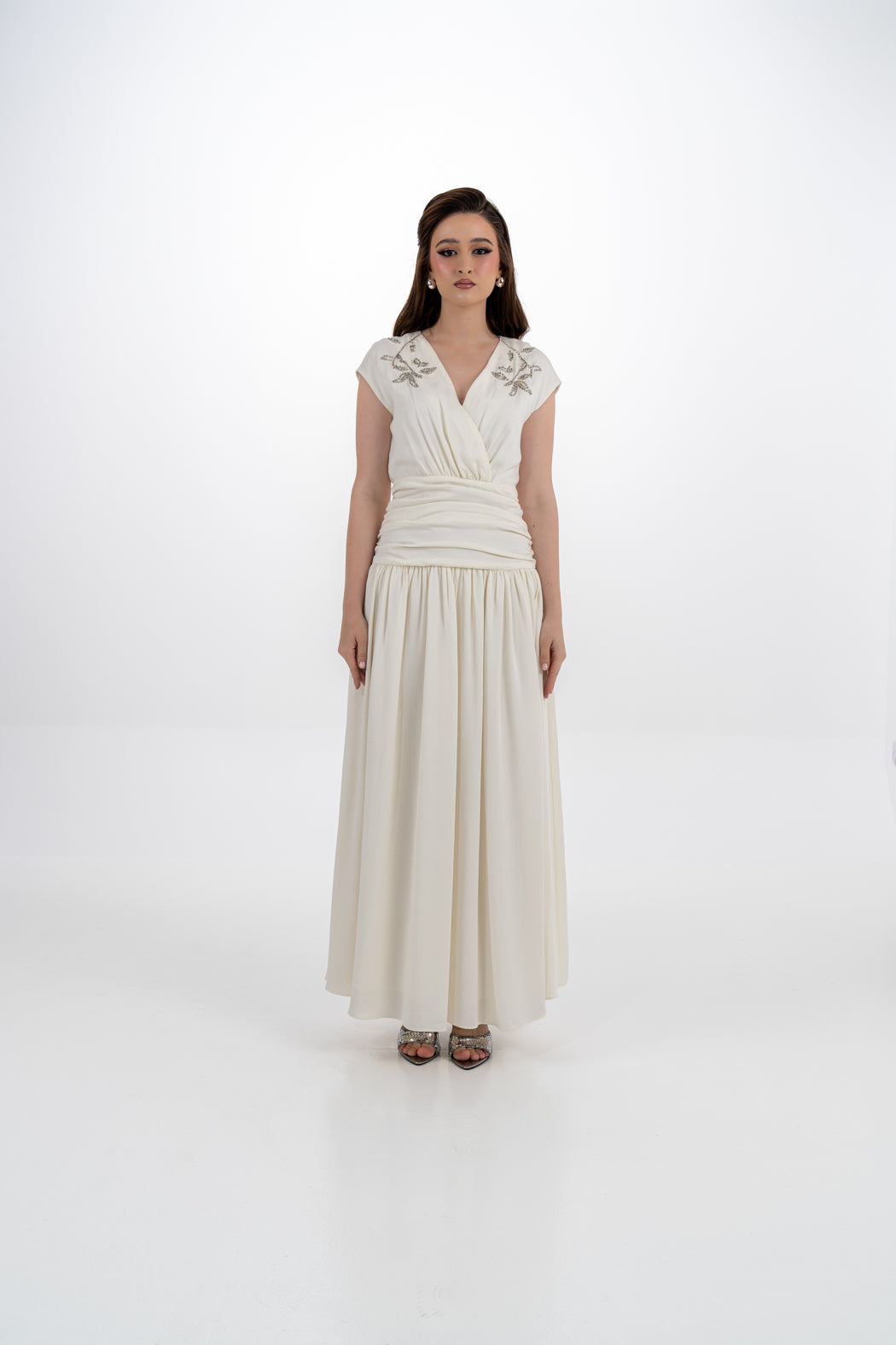 تألقي بإطلالة ناعمة وأنثوية مع هذا الفستان الطويل الأنيق والمطرز يدويًا عند الأكتاف. يتميز بياقة متقاطعة على شكل V وأكمام قصيرة تضفي لمسة رقيقة، مع خصر مكشكش يبرز جمال القوام. ينزل القماش بخفة إلى الأسفل ليصل إلى طول 144 سم، مما يمنحك مظهرًا ملكيًا في المناسبات الرسمية والحفلات الراقية.
