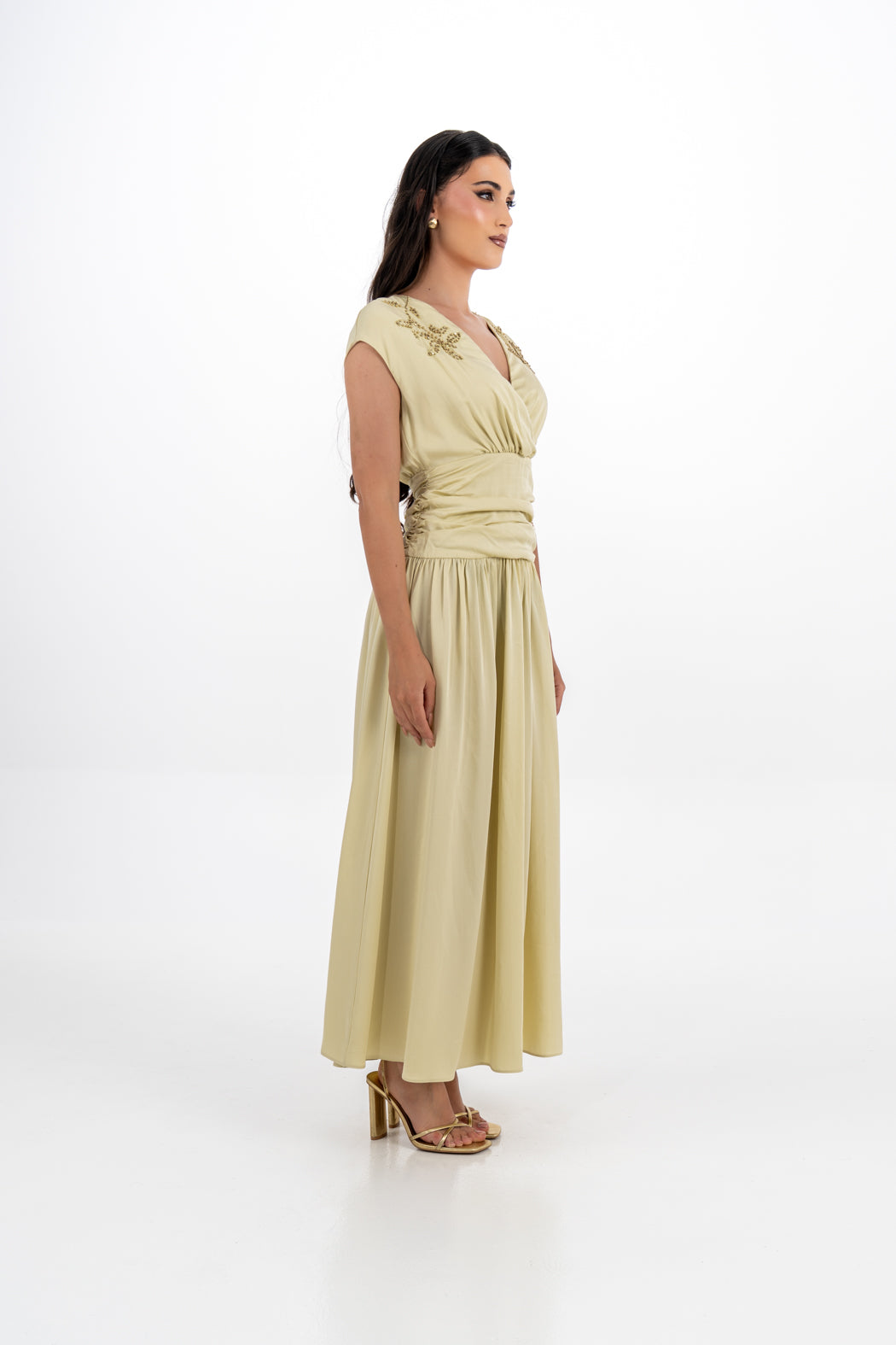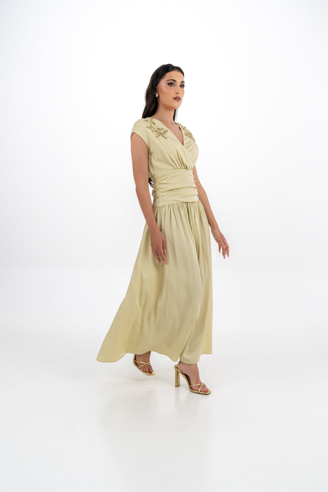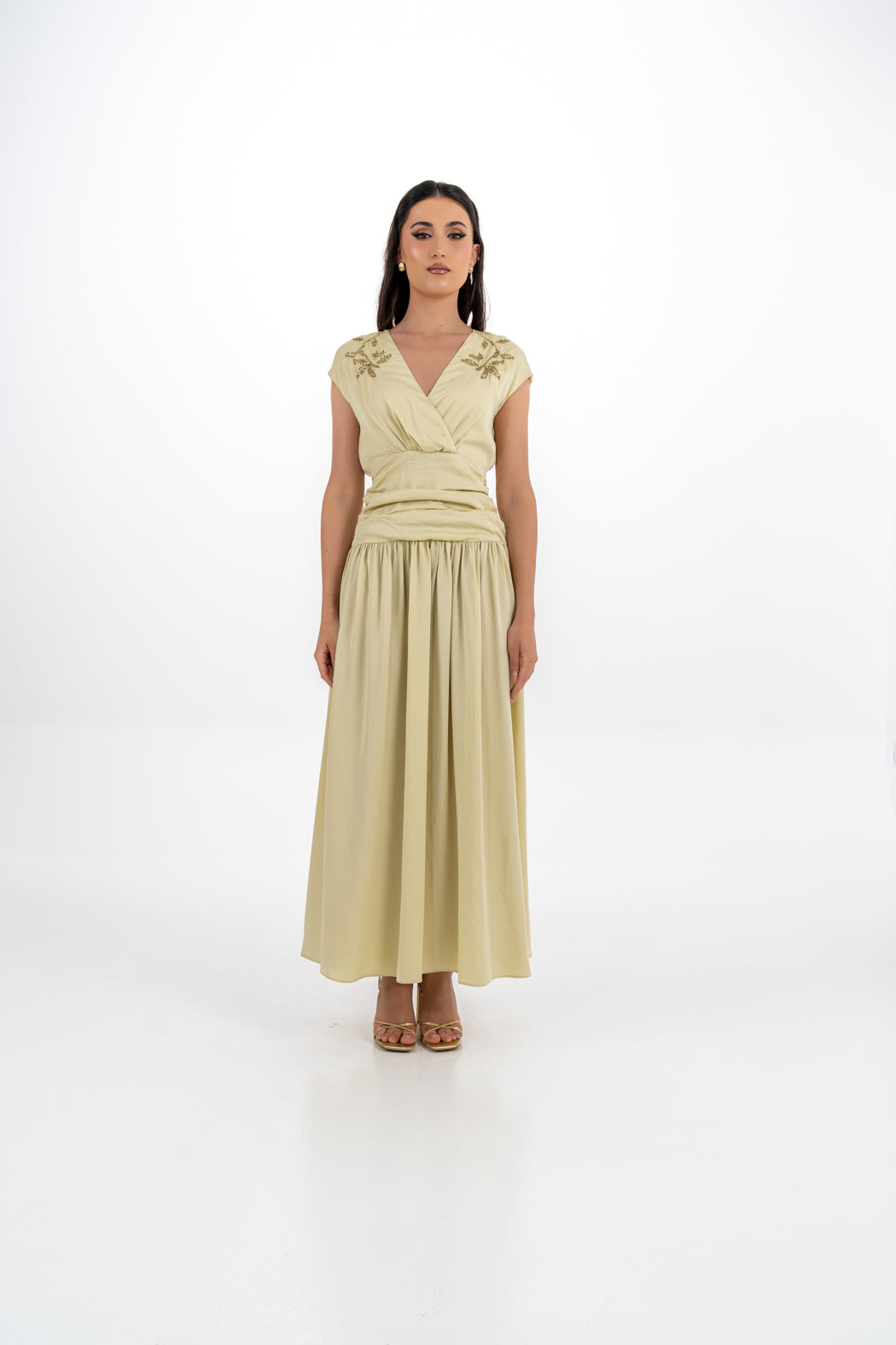 تألقي بإطلالة ناعمة وأنثوية مع هذا الفستان الطويل الأنيق والمطرز يدويًا عند الأكتاف. يتميز بياقة متقاطعة على شكل V وأكمام قصيرة تضفي لمسة رقيقة، مع خصر مكشكش يبرز جمال القوام. ينزل القماش بخفة إلى الأسفل ليصل إلى طول 144 سم، مما يمنحك مظهرًا ملكيًا في المناسبات الرسمية والحفلات الراقية.