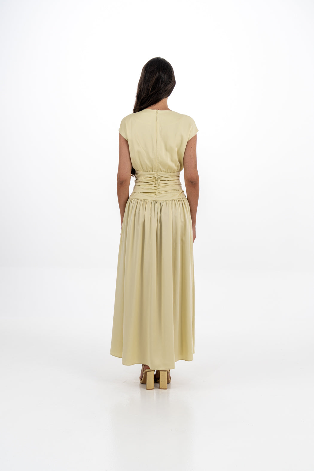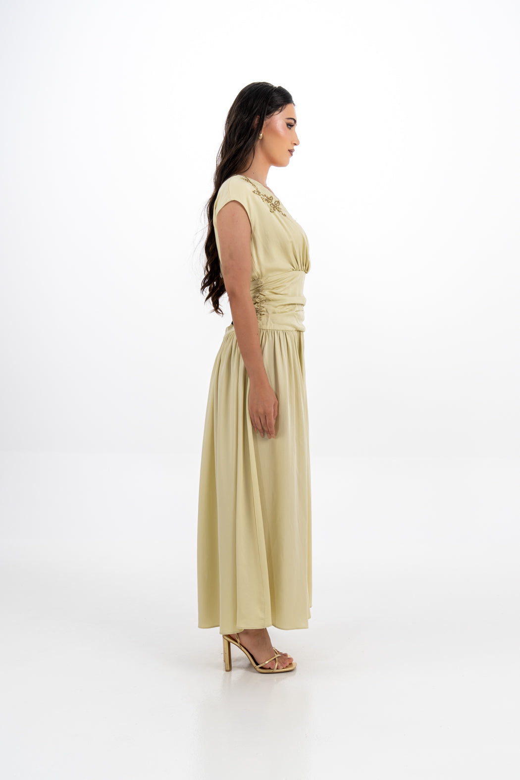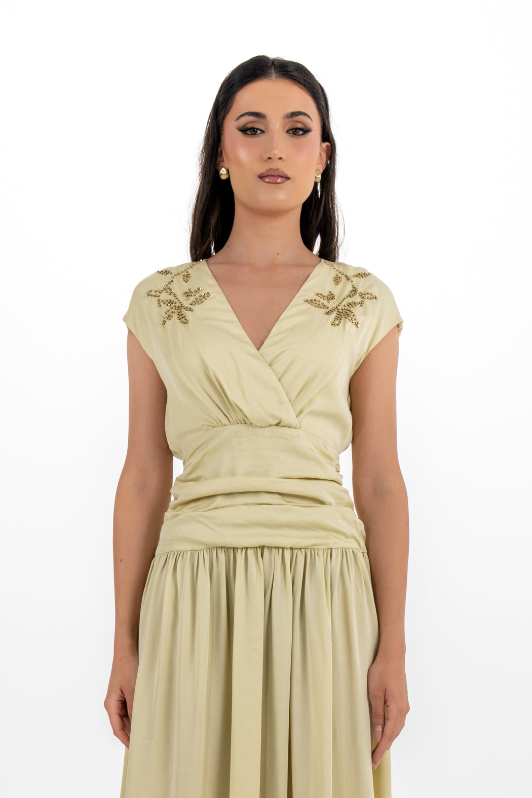 تألقي بإطلالة ناعمة وأنثوية مع هذا الفستان الطويل الأنيق والمطرز يدويًا عند الأكتاف. يتميز بياقة متقاطعة على شكل V وأكمام قصيرة تضفي لمسة رقيقة، مع خصر مكشكش يبرز جمال القوام. ينزل القماش بخفة إلى الأسفل ليصل إلى طول 144 سم، مما يمنحك مظهرًا ملكيًا في المناسبات الرسمية والحفلات الراقية.