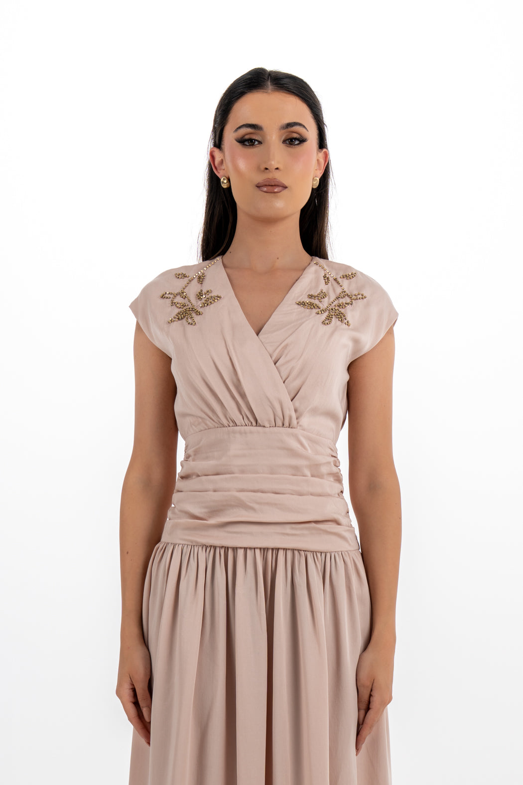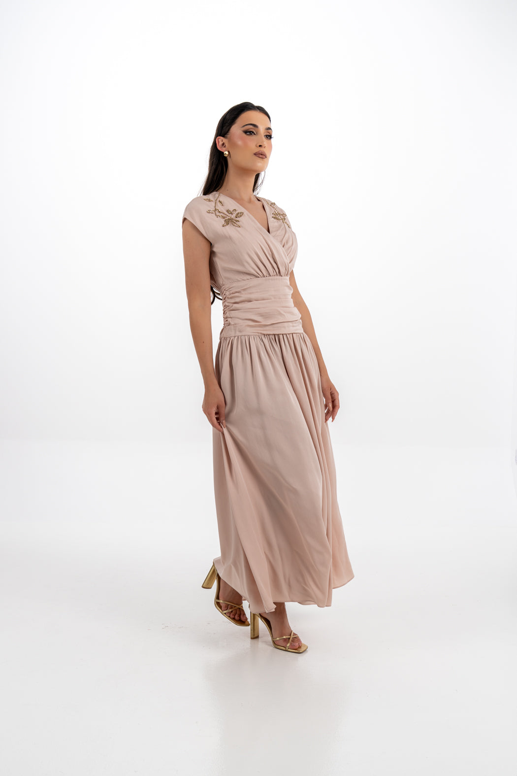 تألقي بإطلالة ناعمة وأنثوية مع هذا الفستان الطويل الأنيق والمطرز يدويًا عند الأكتاف. يتميز بياقة متقاطعة على شكل V وأكمام قصيرة تضفي لمسة رقيقة، مع خصر مكشكش يبرز جمال القوام. ينزل القماش بخفة إلى الأسفل ليصل إلى طول 144 سم، مما يمنحك مظهرًا ملكيًا في المناسبات الرسمية والحفلات الراقية.