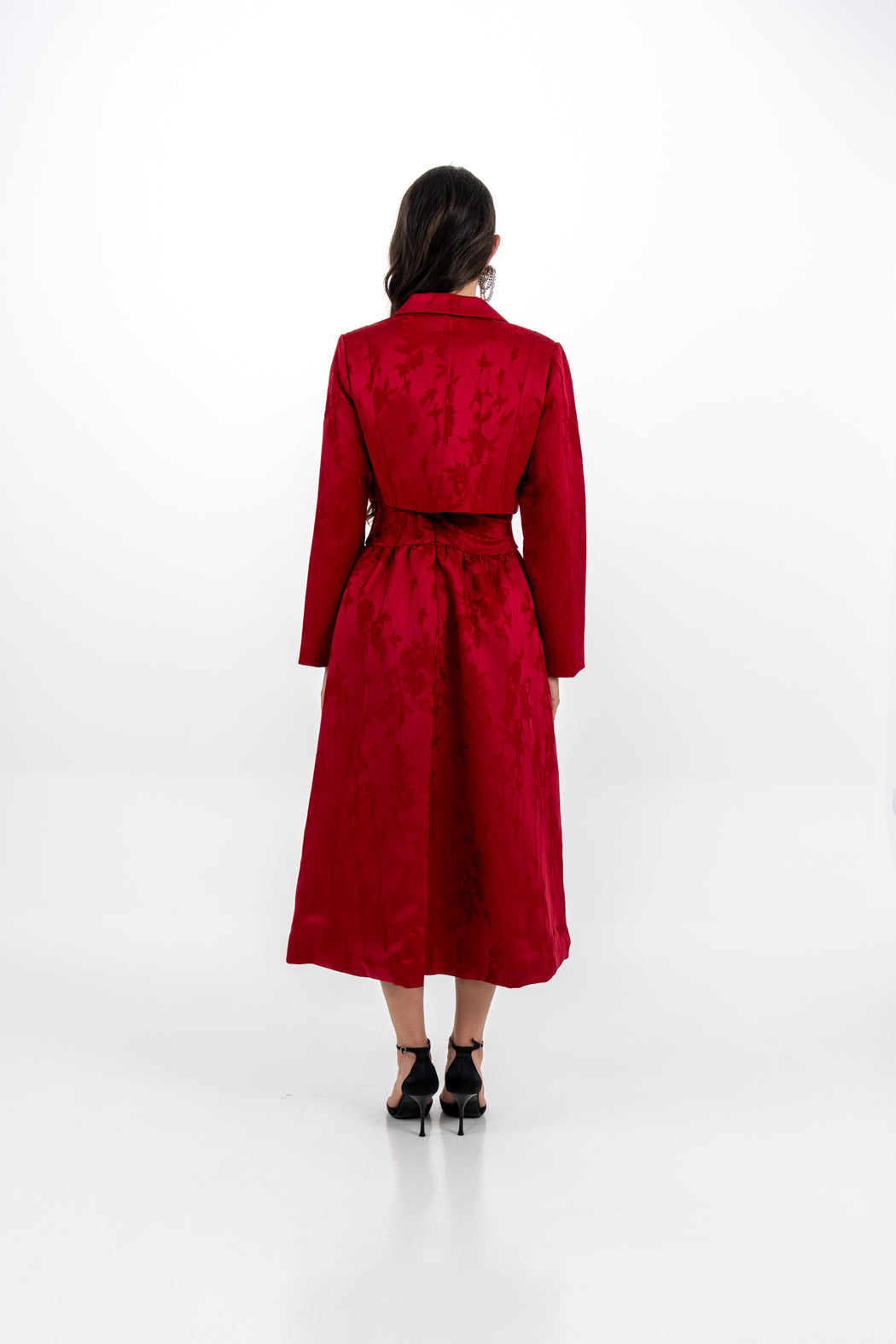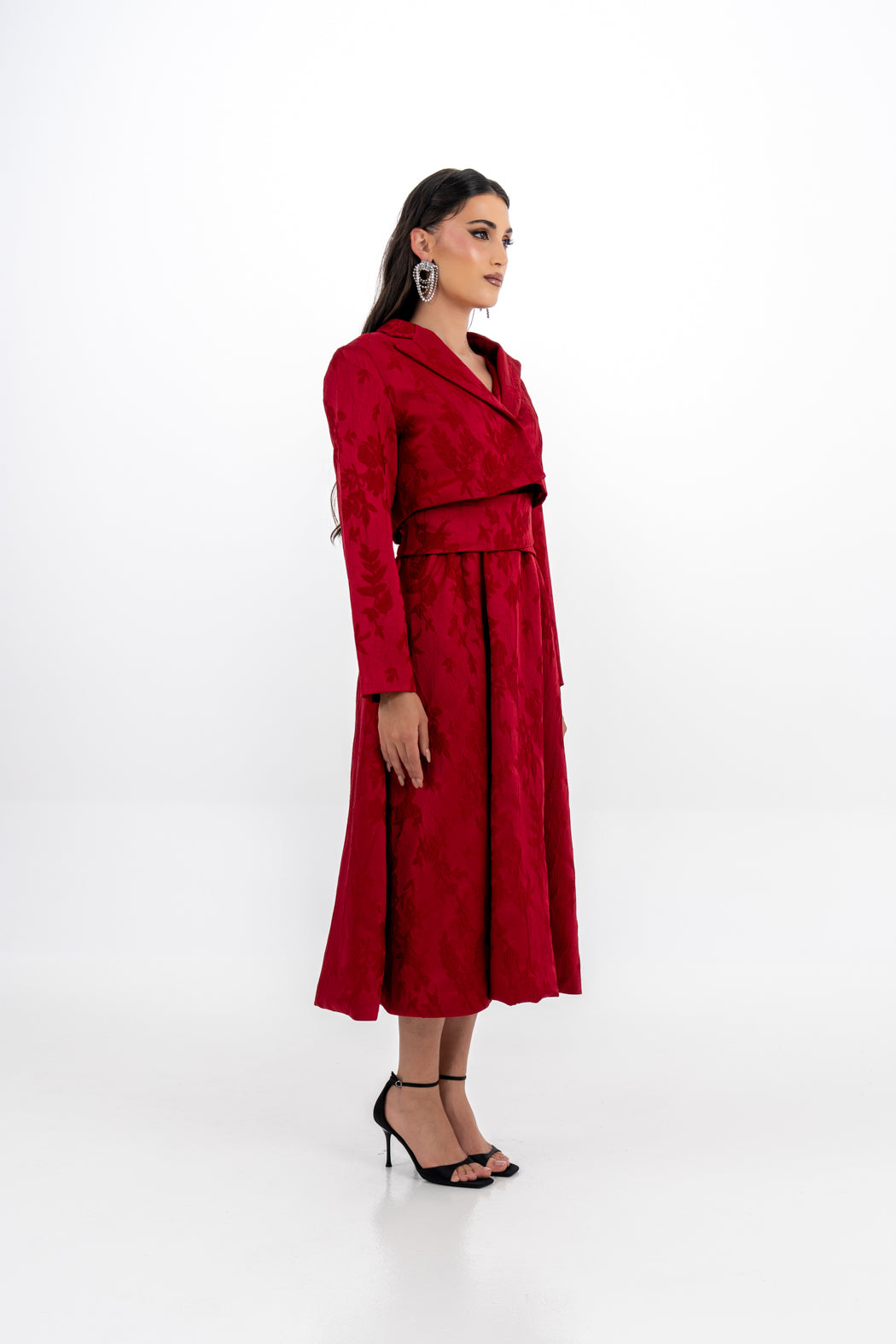 Effortlessly elegant, this sleeveless midi dress is crafted from premium brocade fabric with a delicate floral jacquard pattern. Designed with a flattering wrap-style bodice and wide structured waistband, it creates a refined silhouette that is both feminine and timeless. The A-line skirt flows gracefully to a mid-calf length, offering ease of movement and graceful charm.