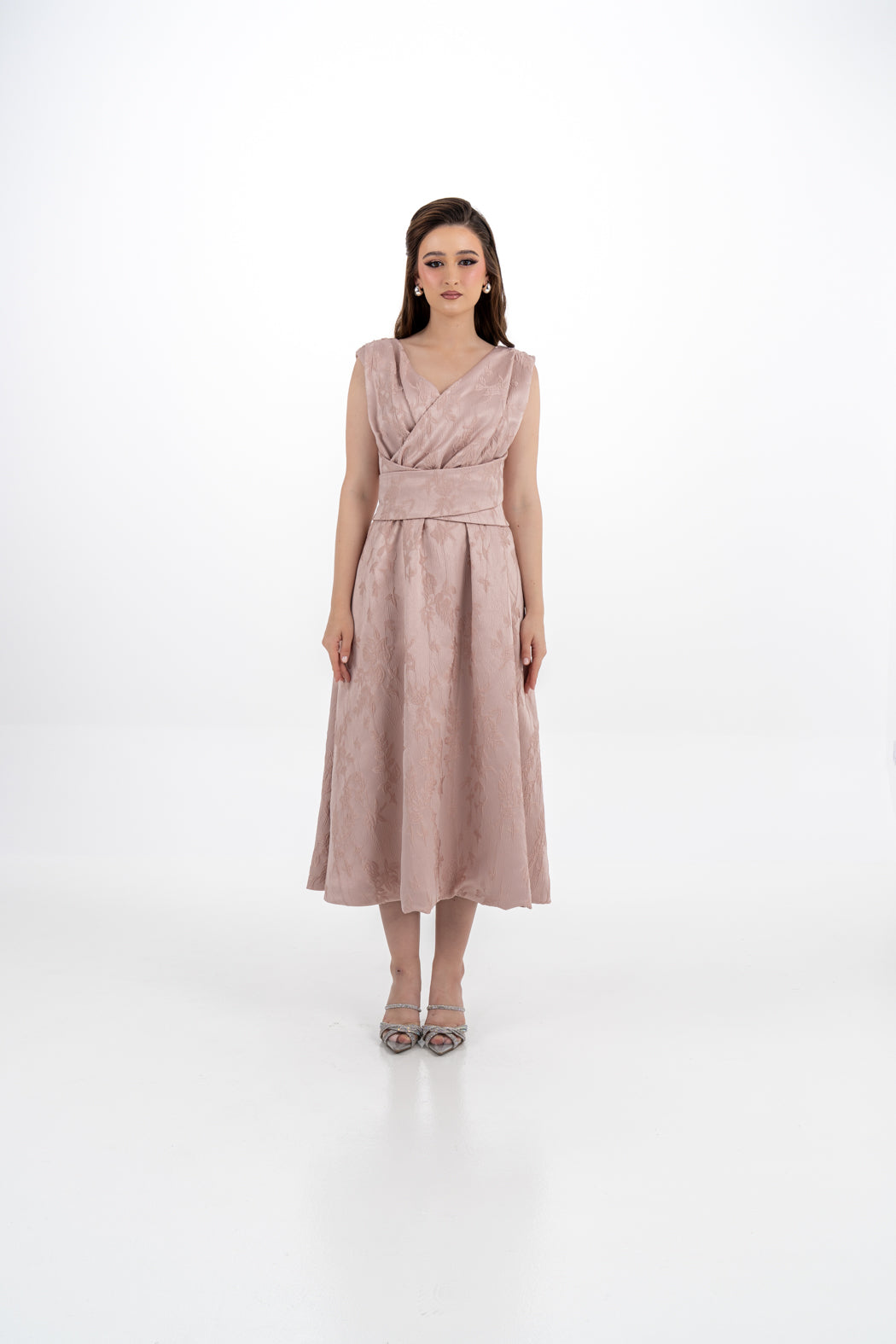 فستان أنيق وناعم التصميم، مصنوع من قماش بروكيد فاخر بنقشة جاكار زهرية ناعمة. يتميز بقصة صدر ملتفّة وياقة على شكل V، مع حزام عريض يحدد الخصر ويضفي لمسة أنثوية راقية. تنسدل التنورة بقصة A لتمنحك إطلالة انسيابية ومفعمة بالأنوثة، بطول يصل إلى منتصف الساق.