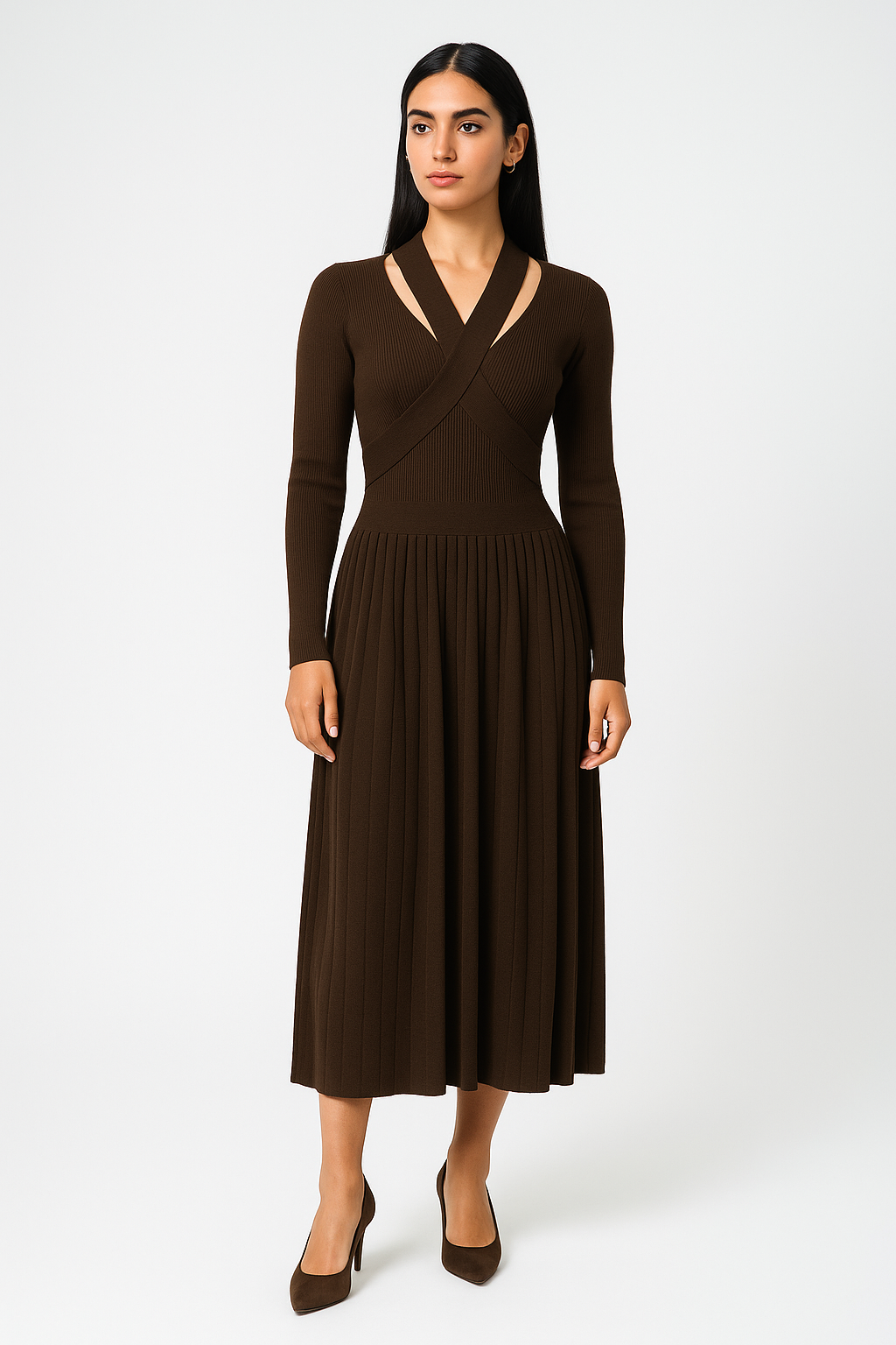 فستان نسائي بفتحة رقبة V وتنورة بليسيه من قماش يشبه الكشمير