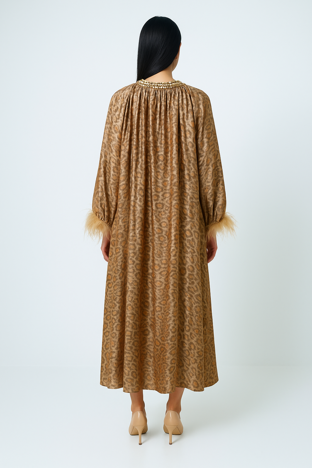 تألقي بإطلالة تجمع بين الجرأة والرقي مع هذا الفستان الماكسي بطبعة حيوانية أنيقة. يتميز بتصميم فضفاض وانسيابي يمنحك راحة وأناقة في آن واحد، مع ياقة دائرية مرصعة بتطريز يدوي فاخر يضفي لمسة بريق راقية. الأكمام الطويلة مزينة بحواف من الريش لإضافة لمسة درامية جذابة، فيما يضفي الحاشية غير المتساوية (asymmetrical hem) حركة مميزة على الإطلالة. خيار مثالي للسهرات والمناسبات الخاصة.