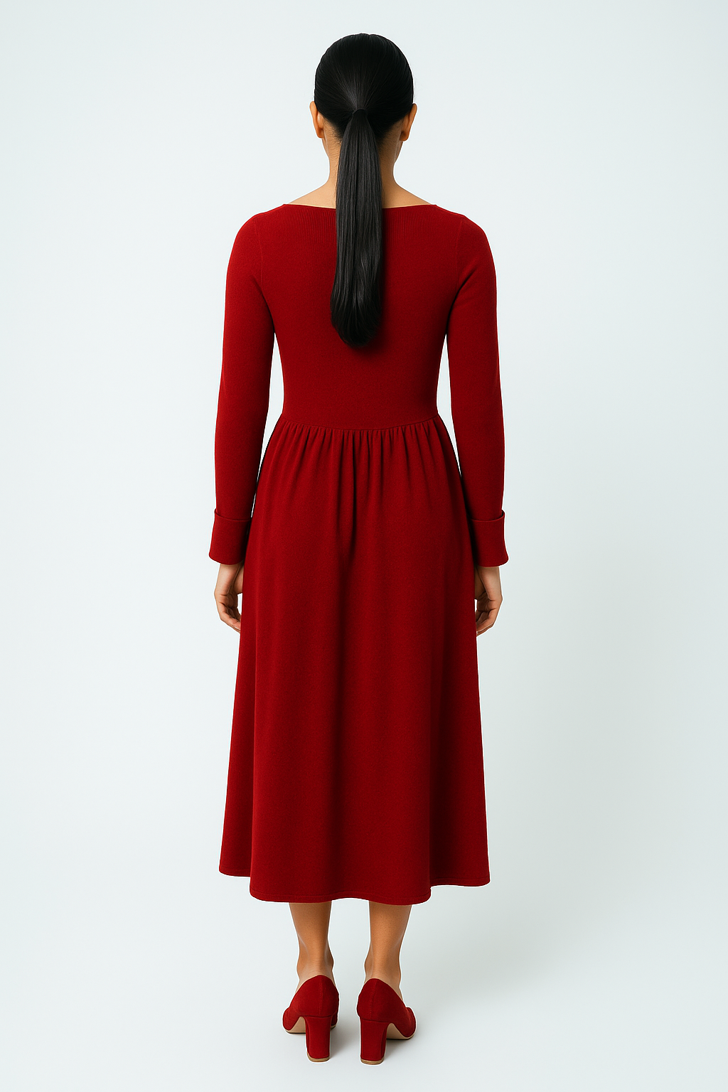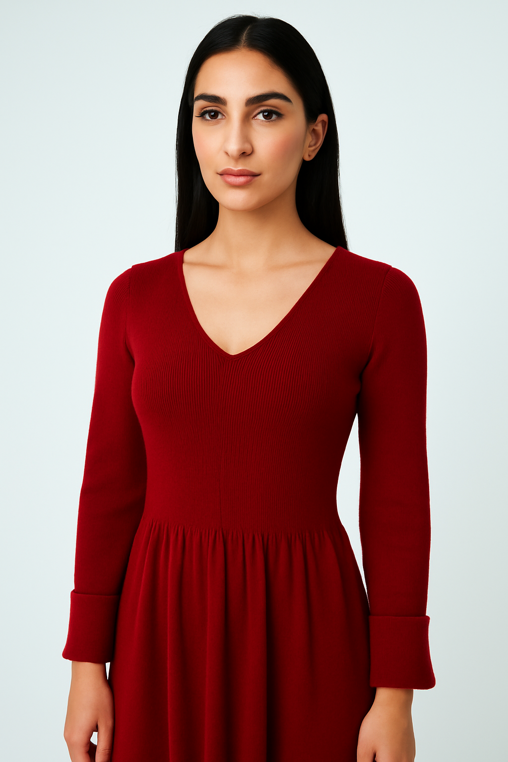 فستان أنيق بتصميم بسيط وراقي، يتميز بياقة على شكل V وأكمام طويلة مع خصر مجمّع بشكل ناعم. يأتي بقماش شتوي ناعم يشبه الكاشمير ليمنحك الدفء والراحة والمظهر الأنثوي الكلاسيكي — مناسب للإطلالات اليومية الأنيقة والمناسبات الشتوية.