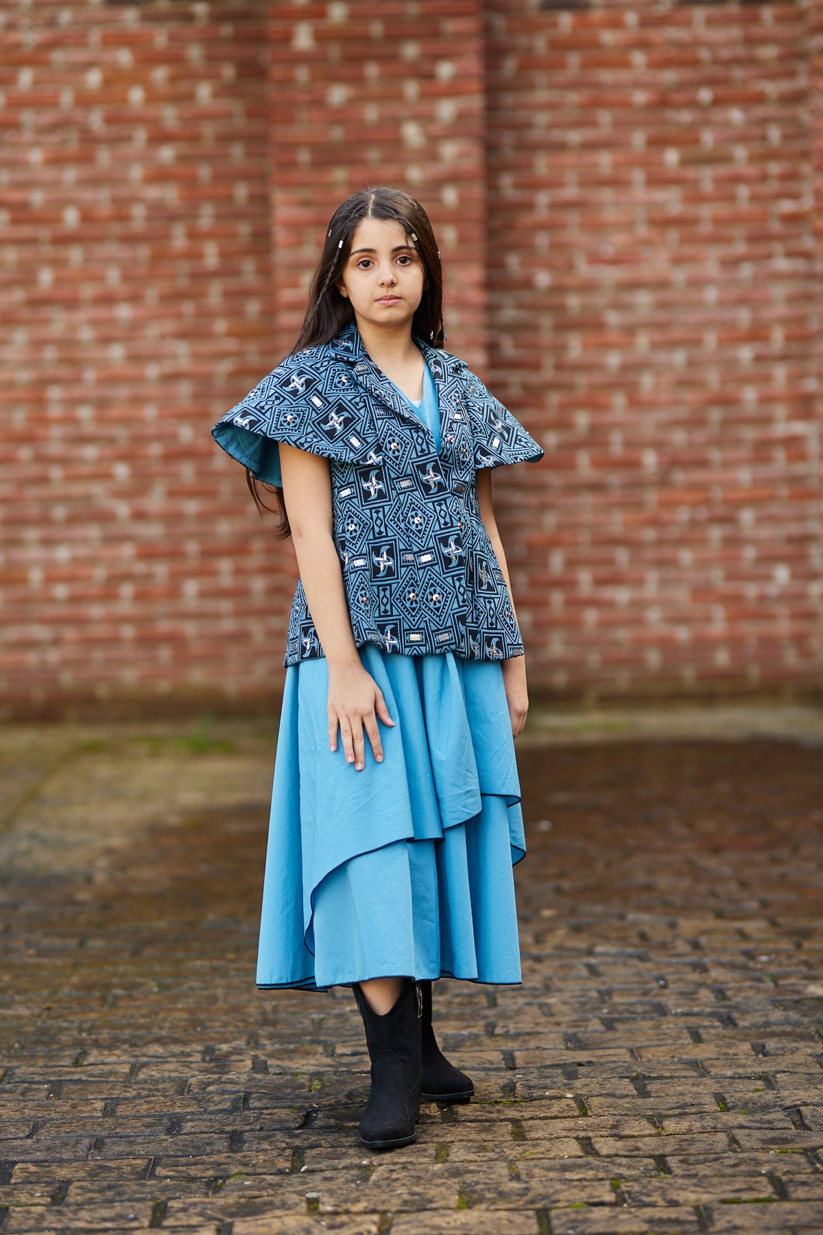 ✔️ التصميم يشمل: سترة قصيرة بأكمام واسعة مع تطريزات هندسية متقنة + فستان متوسط الطول بطبقات متدرجة يمنح مظهرًا مرحًا وأنيقًا.