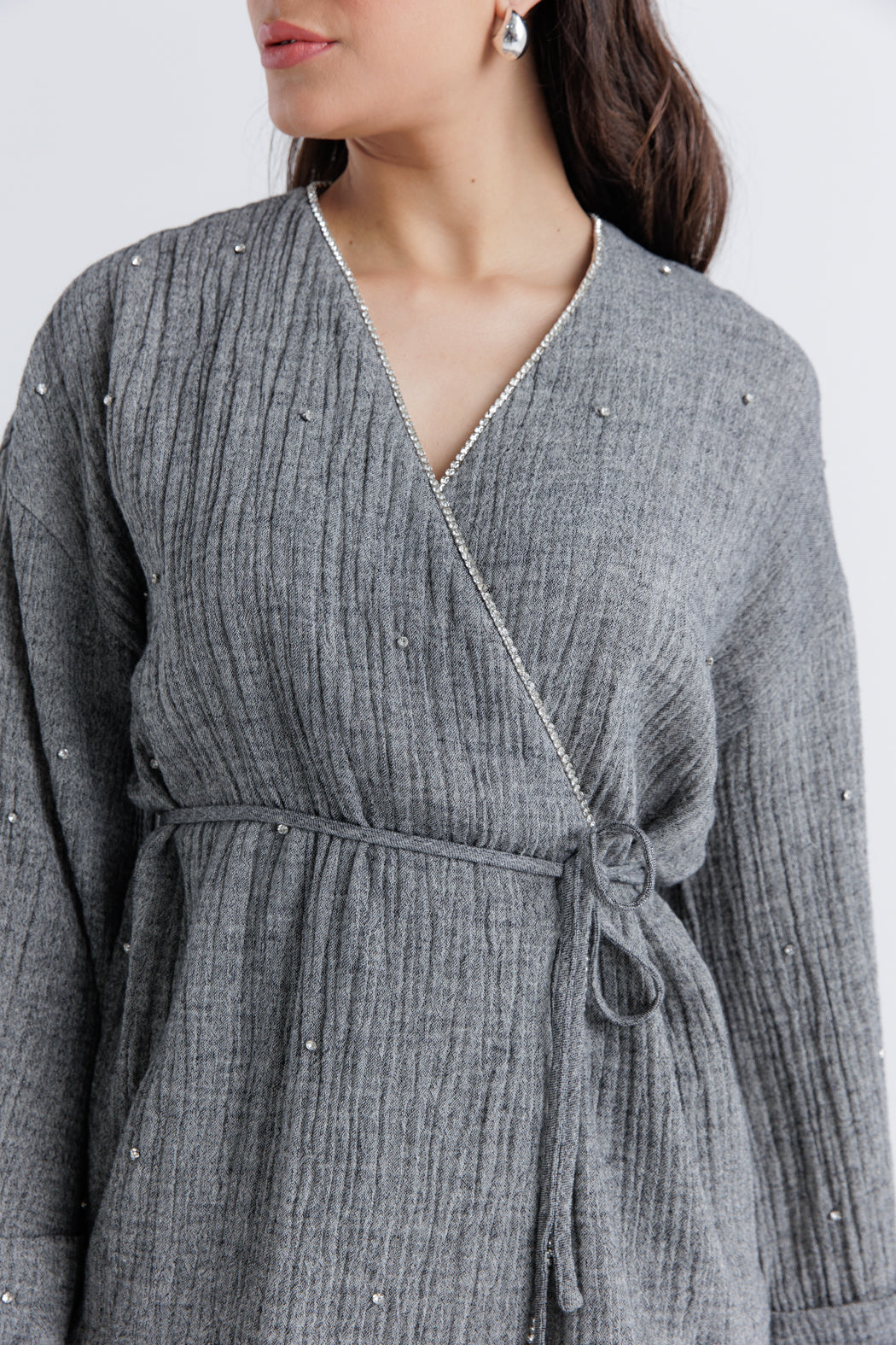 • تفاصيل التصميم: إغلاق ملفوف مع حزام خصر، أكمام طويلة مع حواف مطوية، مزين بتطريزات أنيقة.