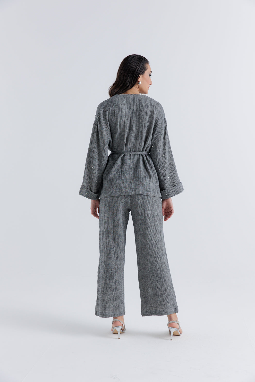 تألقي بإطلالة أنيقة ومميزة مع هذا الجاكيت الراقي، المصمم خصيصًا لاحتفالات رمضان والعيد. يتميز هذا الجاكيت بتصميمه المريح والعصري مع خامة بنقشة مجعدة ناعمة ومزينة بتفاصيل دقيقة لإضفاء لمسة من الفخامة. كما يوفر الحزام القابل للتعديل تحديدًا أنيقًا للخصر، بينما يضيف التطريز اللامع على خط العنق لمسة جذابة من التألق.