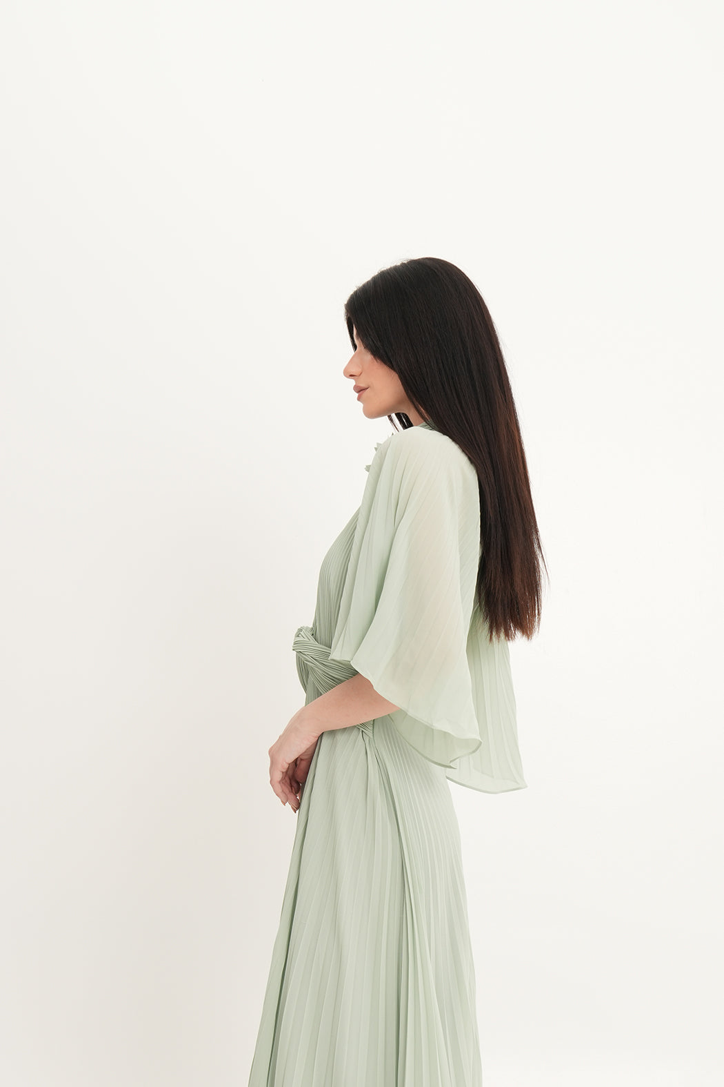 • Design: Full-length pleated dress with cape sleeves