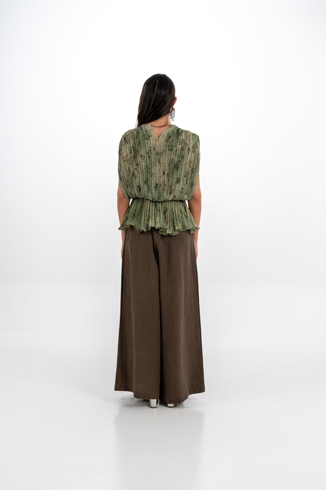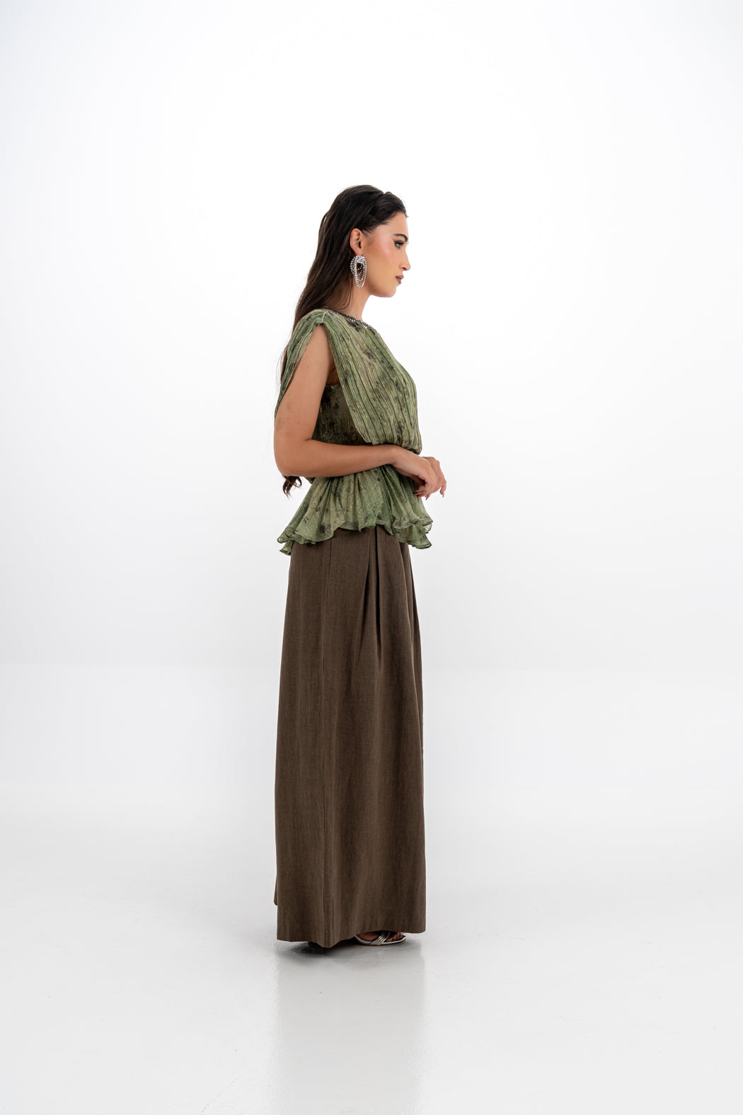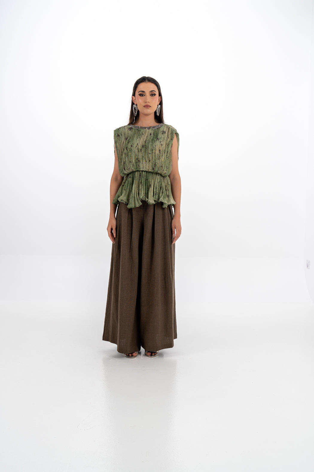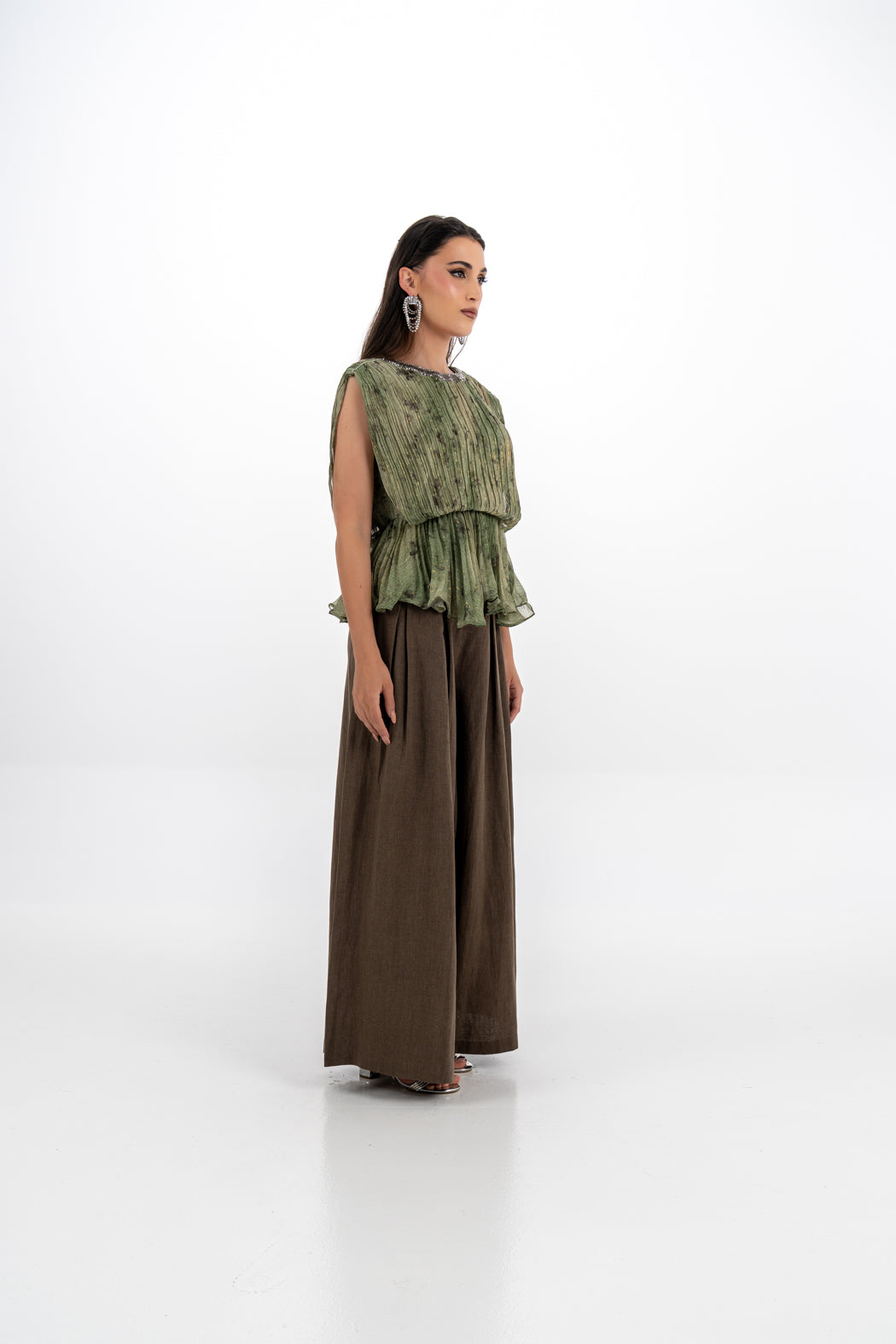 أنيق وعصري بلمسة ناعمة، يُضفي هذا التوب بدون أكمام بتفاصيل الكسرات لمسة من الرقي والأنوثة إلى إطلالتك. مصنوع من قماش خفيف الوزن ومجعد بلمسات ذهبية ناعمة، ويتميز بقصة بيبلوم جذابة تُبرز منطقة الخصر. الياقة مزينة بتفاصيل لامعة تضيف لمسة فاخرة، ما يجعله خيارًا مثاليًا للانتقال من الإطلالات النهارية إلى المسائية بسهولة.