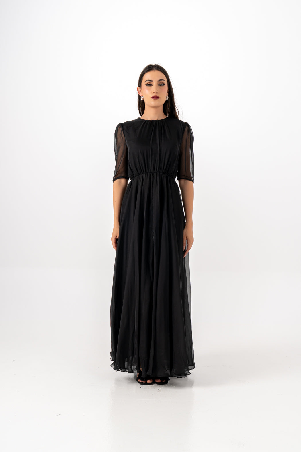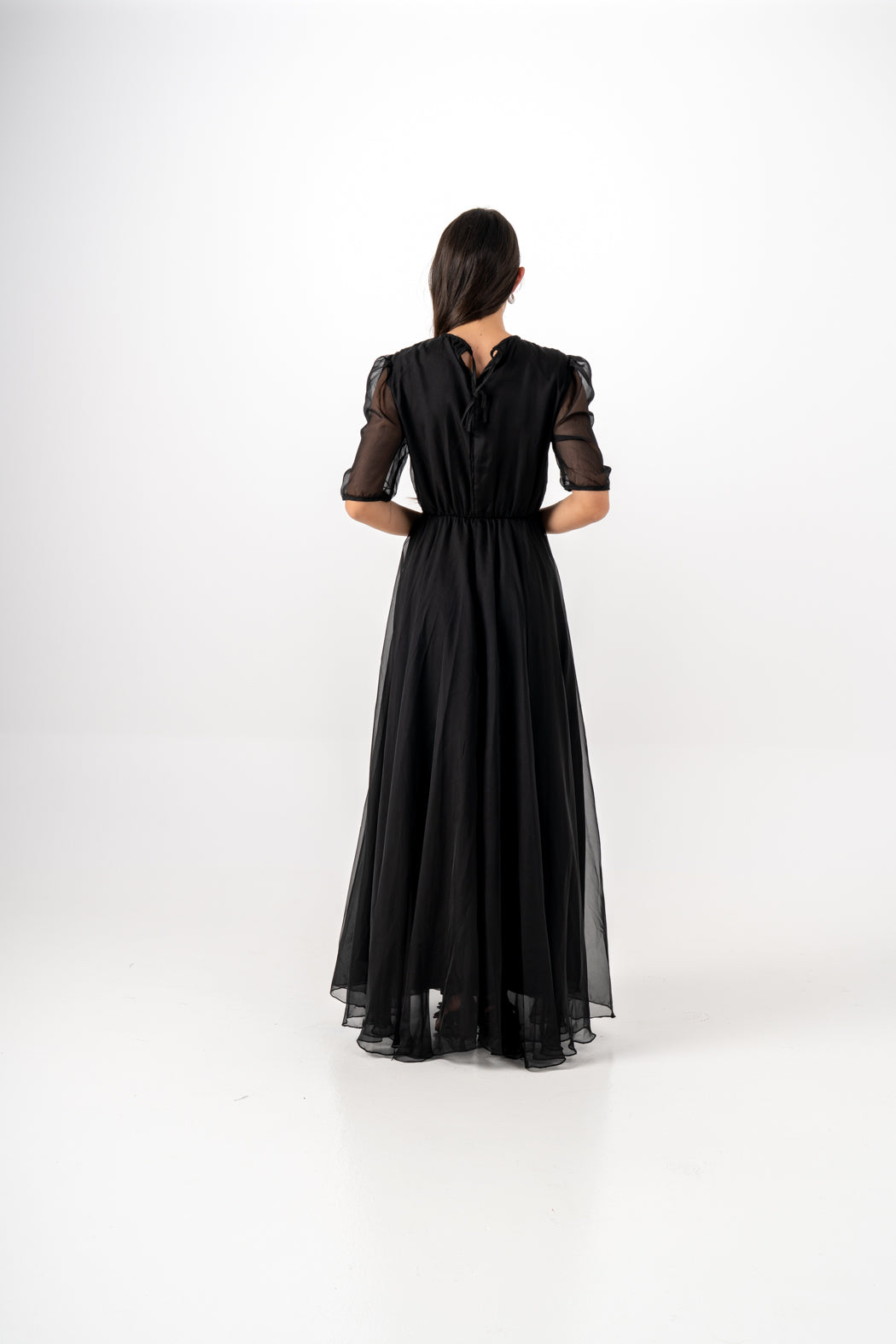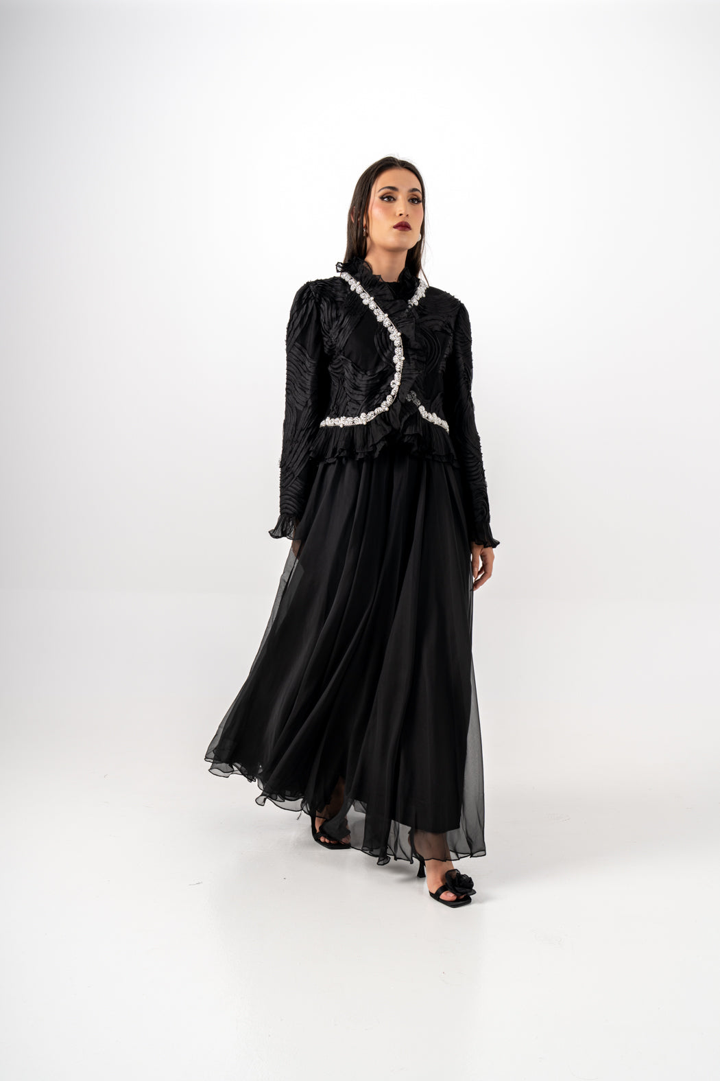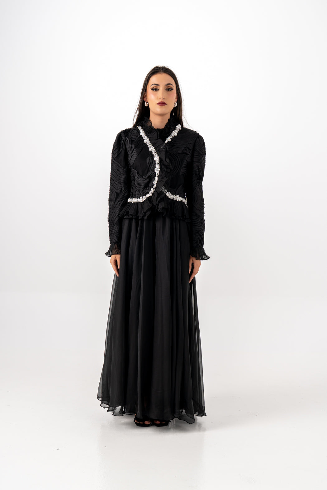 طقم أنيق مكوّن من قطعتين يجمع بين الفخامة والحرفية الرفيعة. يتميز بفستان ماكسي ناعم باللون الأسود أو العاجي، ذو قصة انسيابية وأكمام شفافة قصيرة، مرفق بجاكيت فخم قابل للإزالة مزين بتطريزات فاخرة ونقوش بارزة وتفاصيل كريستالية لامعة.