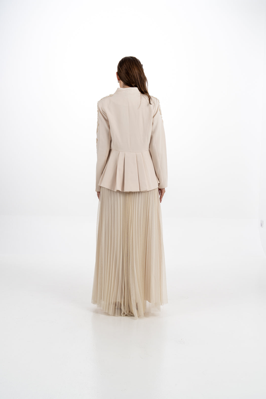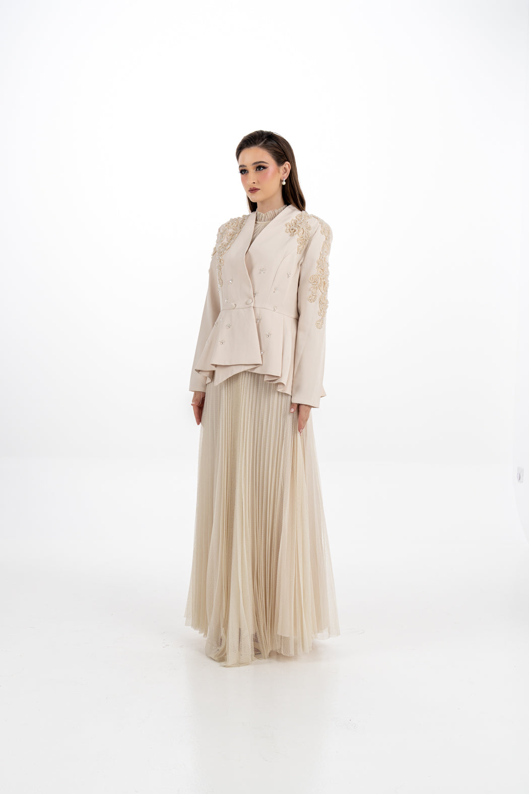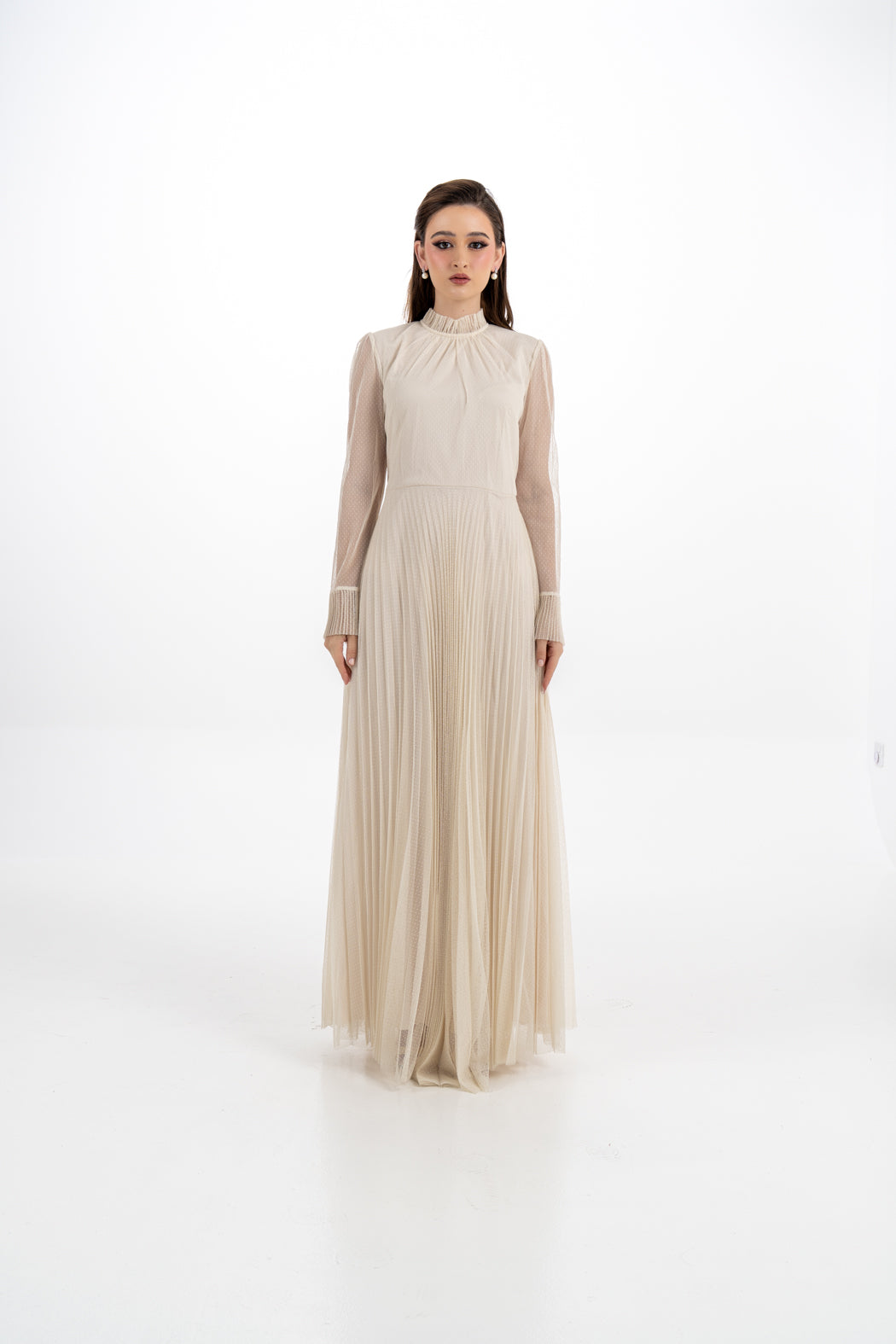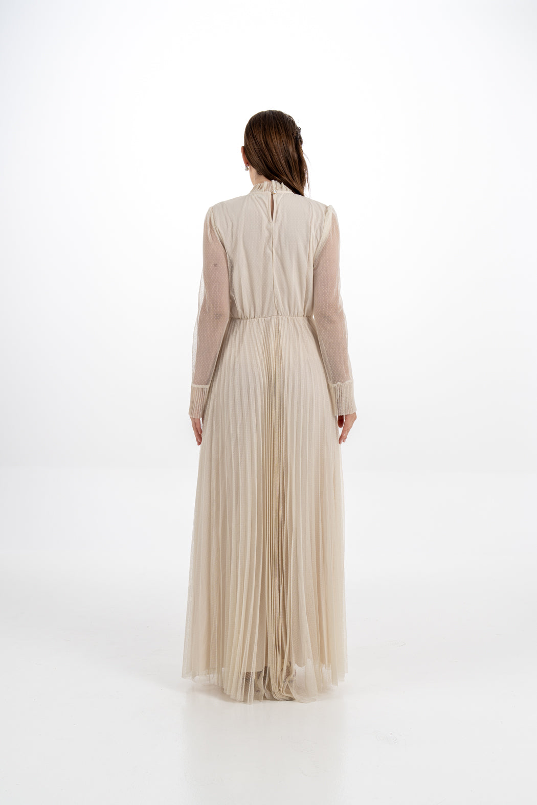 تصميم أنيق مكوّن من قطعتين، يضم فستان ماكسي ناعم بكسرات انسيابية، مع جاكيت فاخر مطرّز يمكن إزالته حسب الرغبة. يتميز الفستان بياقة عالية مجمّعة، وأكمام طويلة شفافة بنقشة ناعمة منقطة، وتنورة واسعة بكسرات بطول 150 سم.