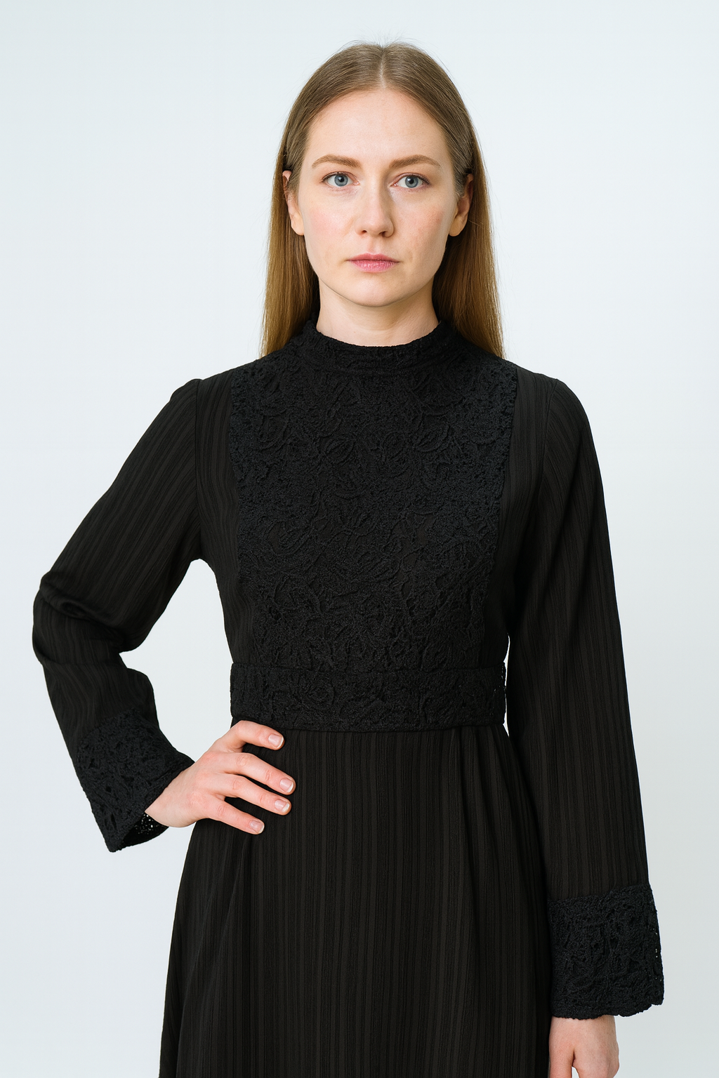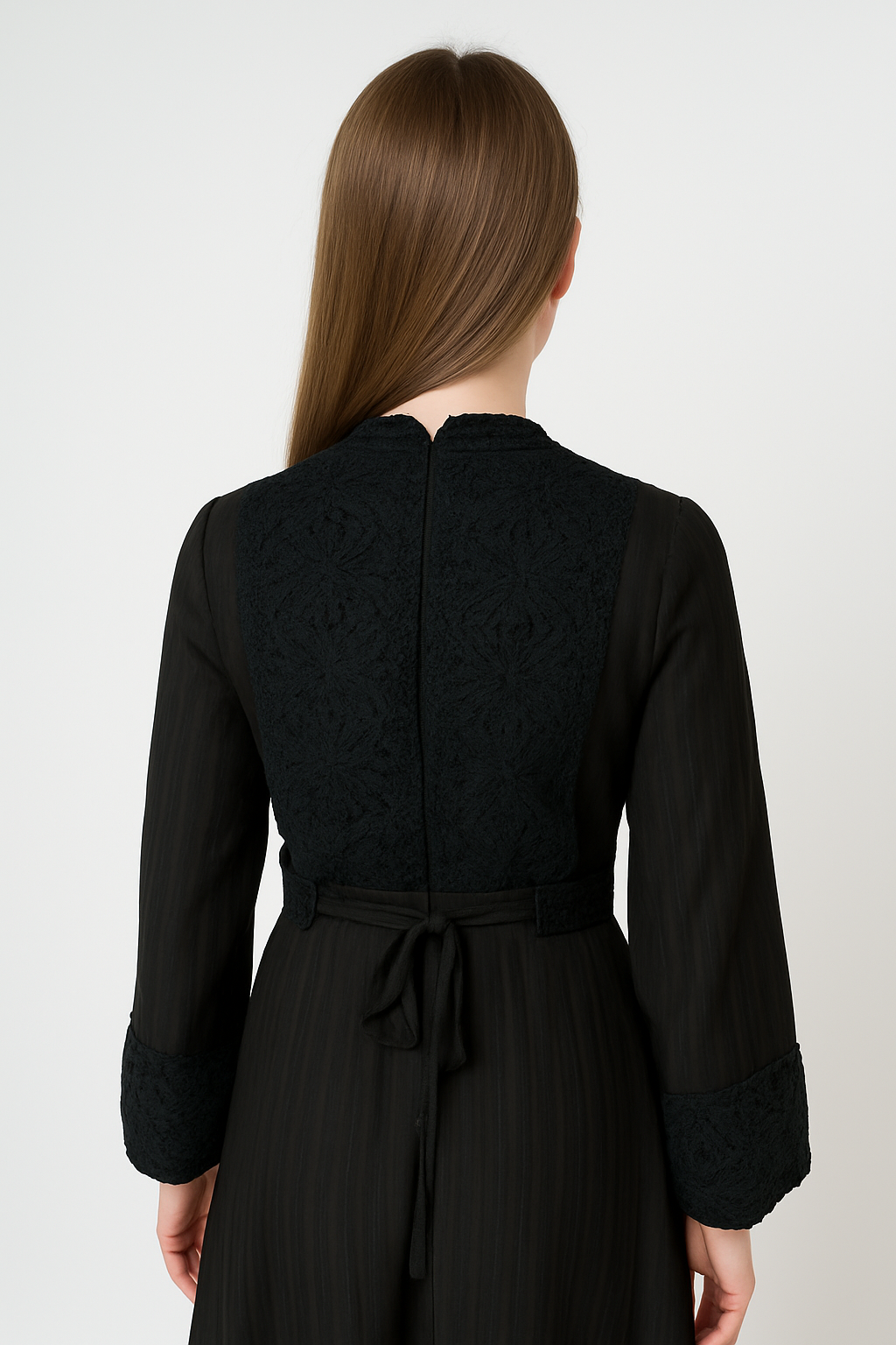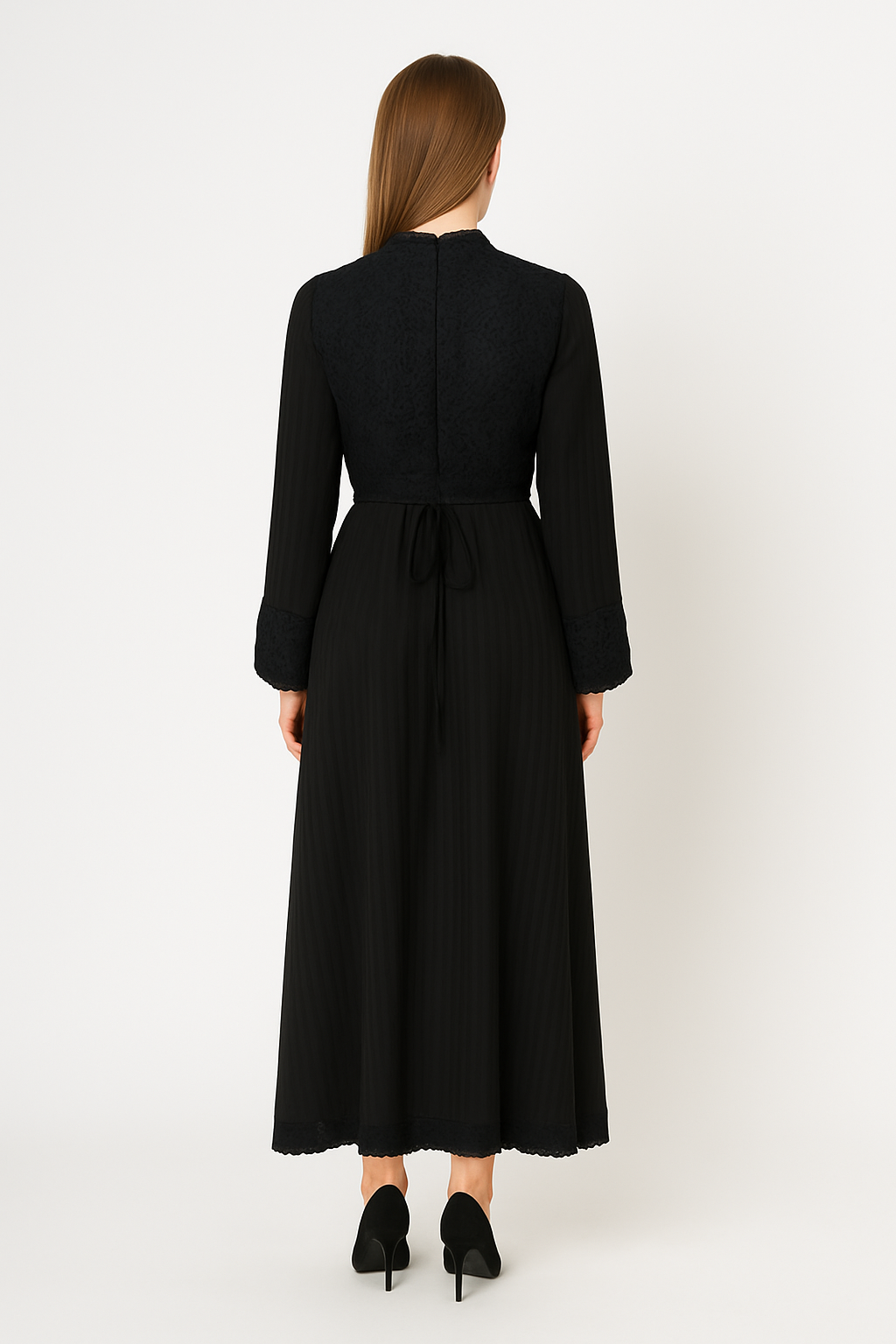 يجمع هذا الفستان الماكسي بين الأناقة الكلاسيكية والجاذبية الأنثوية، حيث يزدان بتفاصيل دانتيل متقنة على منطقة الصدر والأكمام والحافة السفلية لتمنحك لمسة راقية وفريدة. تضفي الأكمام الطويلة والقصّة الواسعة الانسيابية مظهرًا أنيقًا محتشمًا، بينما يساعد رباط الخصر الخلفي على إبراز القوام بشكل أنثوي وجذاب. يُعد خيارًا مثاليًا للمناسبات الخاصة أو السهرات الأنيقة، حيث يجمع بين الراحة والفخامة.