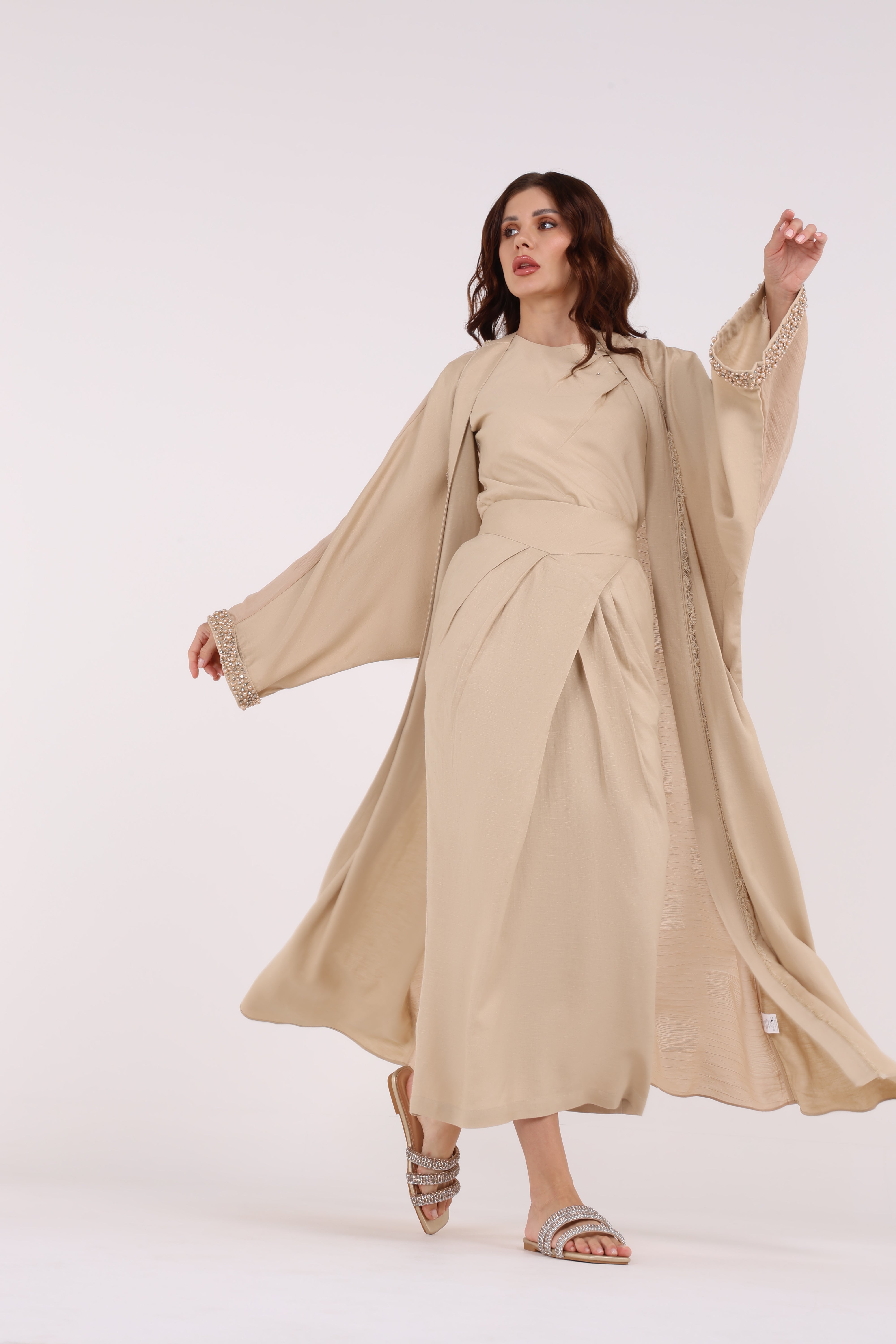 تتميز هذه العباءة الأنيقة بتفاصيل خياطة فضفاضة معقدة تضيف ملمسًا وعمقًا إلى شكلها الظلي المتدفق. مصنوعة من...