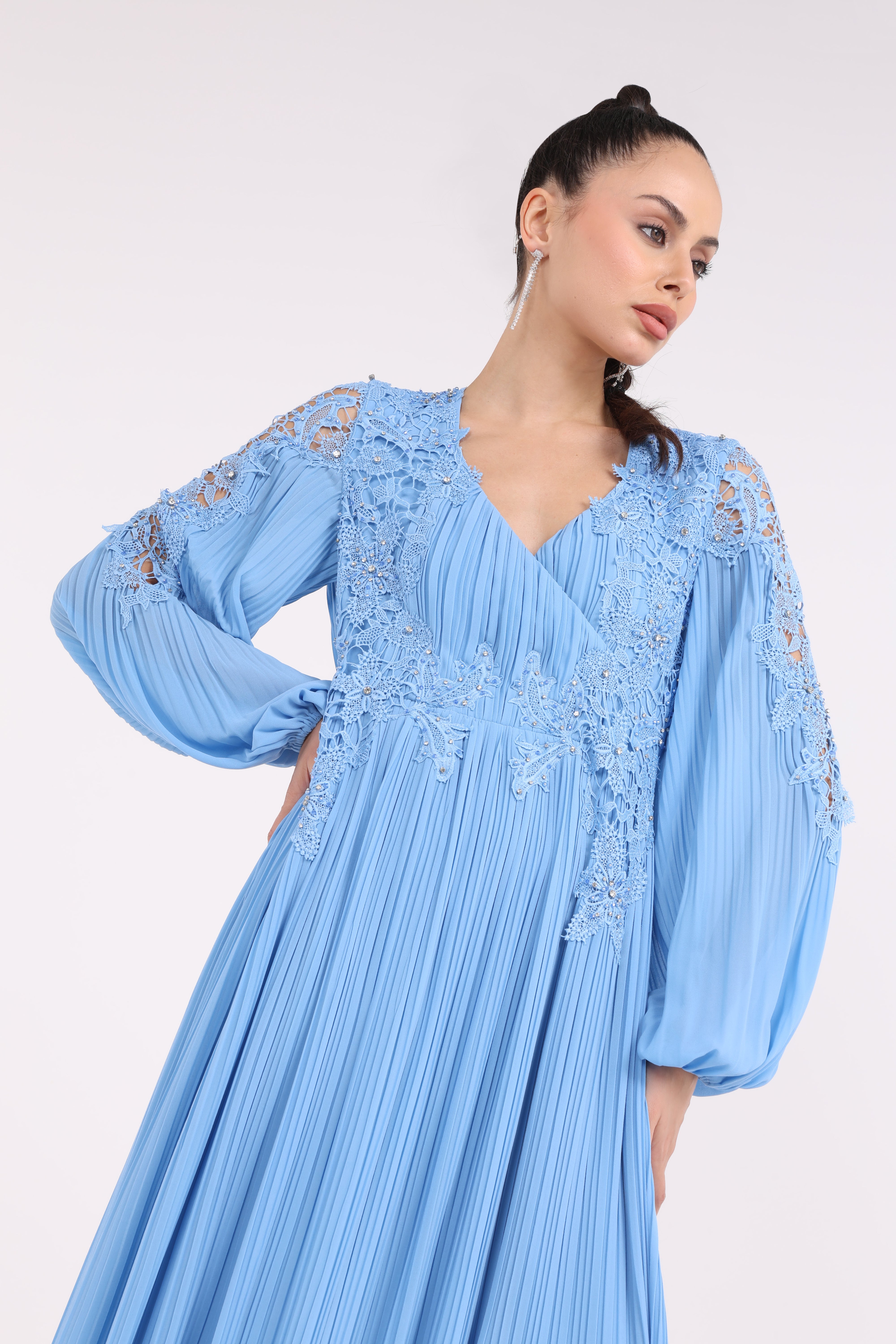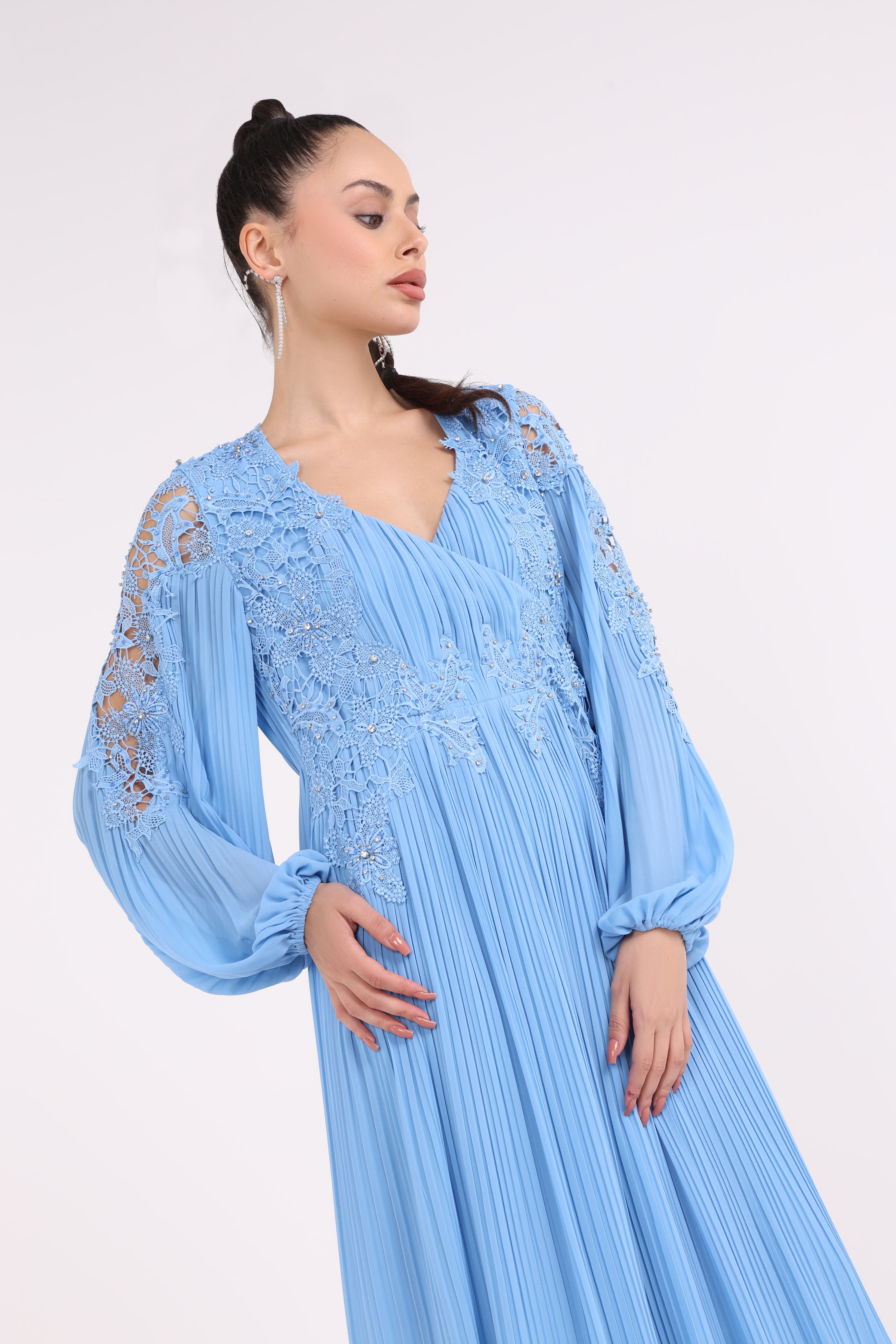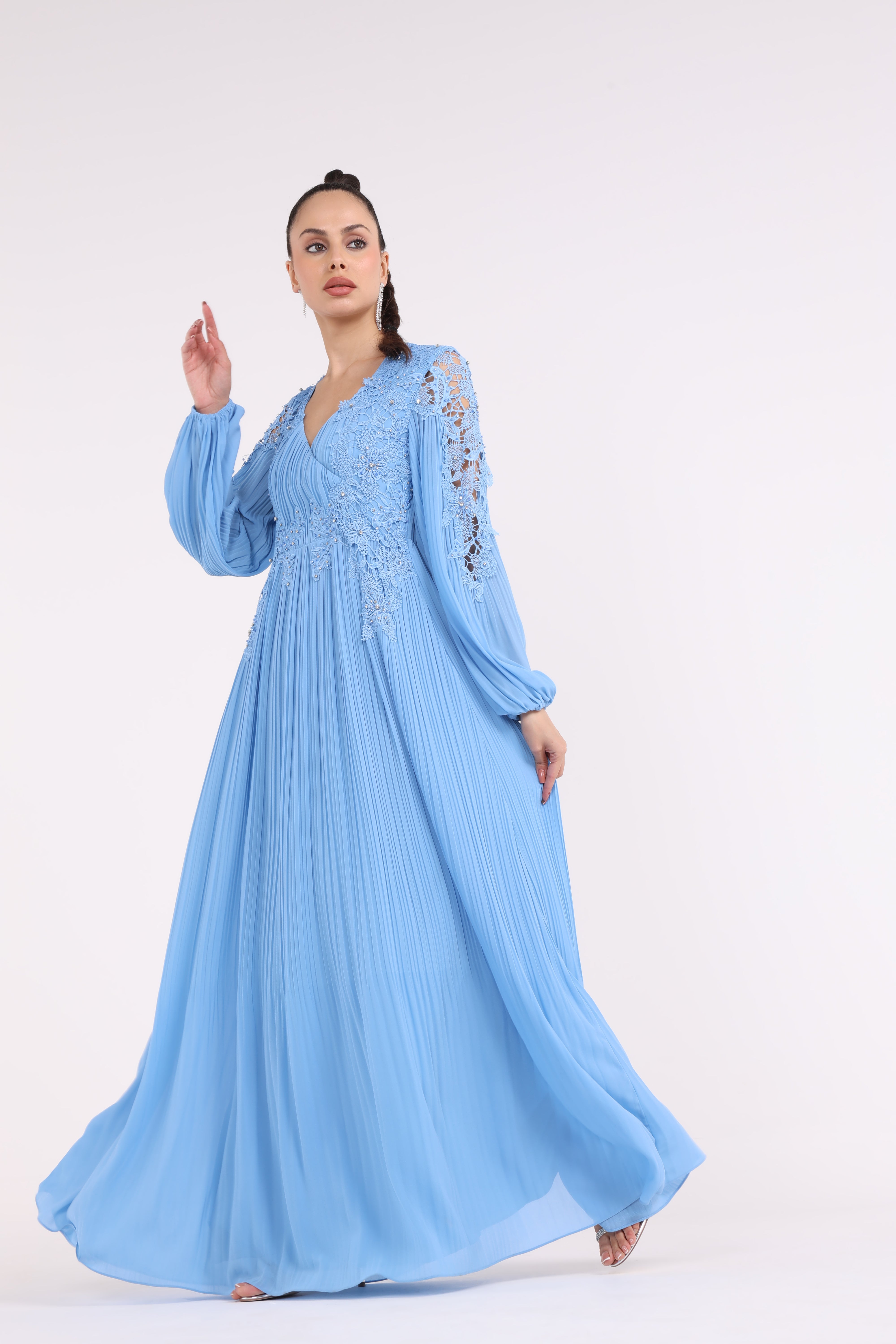 أظهري تألقك بهذا الفستان الأزرق السماوي الرائع، المصمم للمرأة العصرية التي تحب الأناقة مع لمسة من الأناقة. تضيف تفاصيل الدانتيل المعقدة على الكتفين والصدرية إحساسًا بالفخامة، بينما تنساب التنورة المكشكشة بشكل جميل لإطلالة جذابة. مع أكمامه الطويلة المنتفخة وفتحة عنق على شكل حرف V، ينضح هذا الفستان بالرشاقة والسحر. سواء كنت تحضرين مناسبة خاصة أو تريدين فقط الشعور بالتألق، فمن المؤكد أن هذا الفستان سيلفت الأنظار.