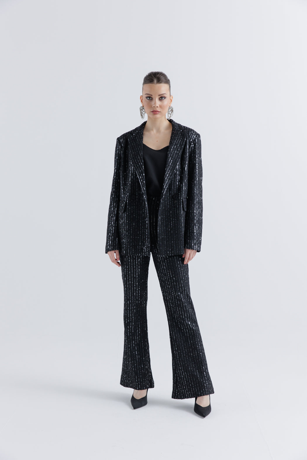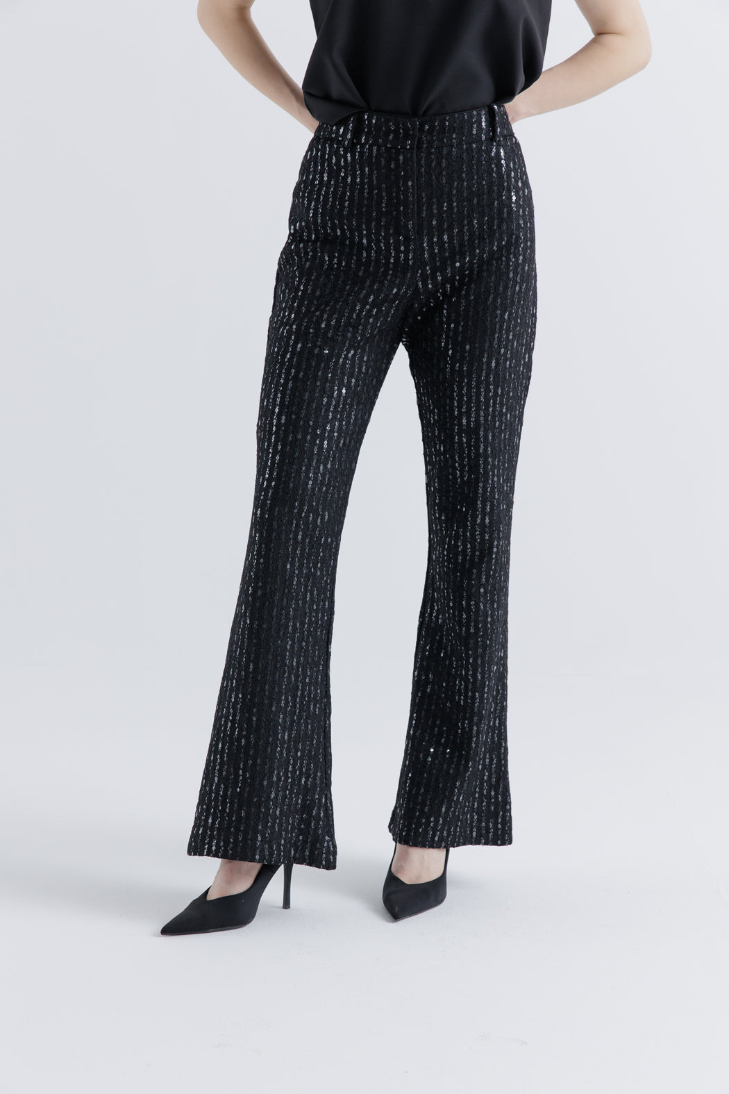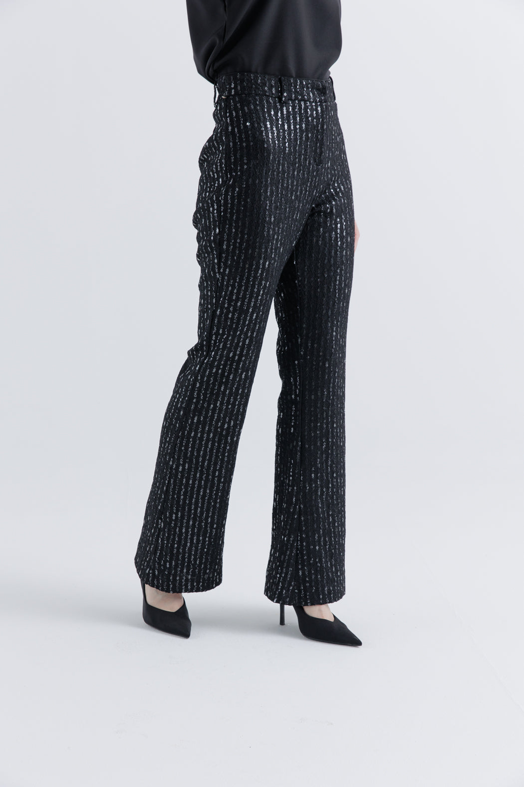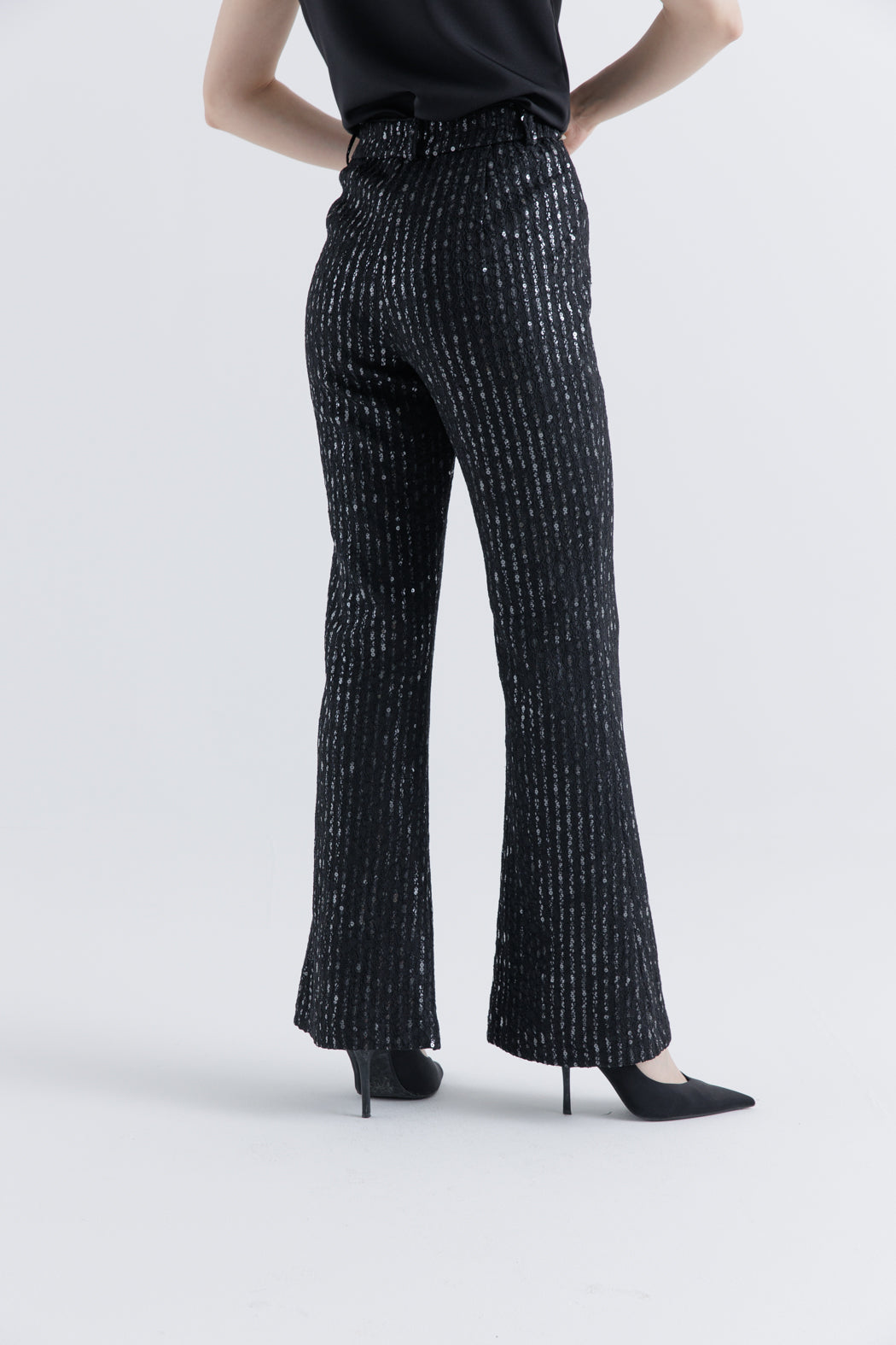 اصنعي إطلالة جذابة مع هذا البنطلون الأسود اللامع الأنيق، المثالي للحفلات، المناسبات المسائية، والمناسبات الخاصة. يتميز بتصميم عصري وانسيابي يمنحك مظهراً أنيقاً مع قصّة ضيقة من الأعلى تتسع تدريجياً نحو الأسفل لإطلالة راقية وجذابة.