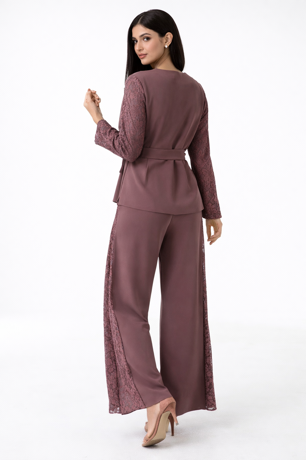 مصنوع من كريب فيلور لوكس الفاخر بملمس ناعم وانسيابية راقية، مع تفاصيل دانتيل وخرز دقيقة تضفي لمسة فاخرة ومتقنة.