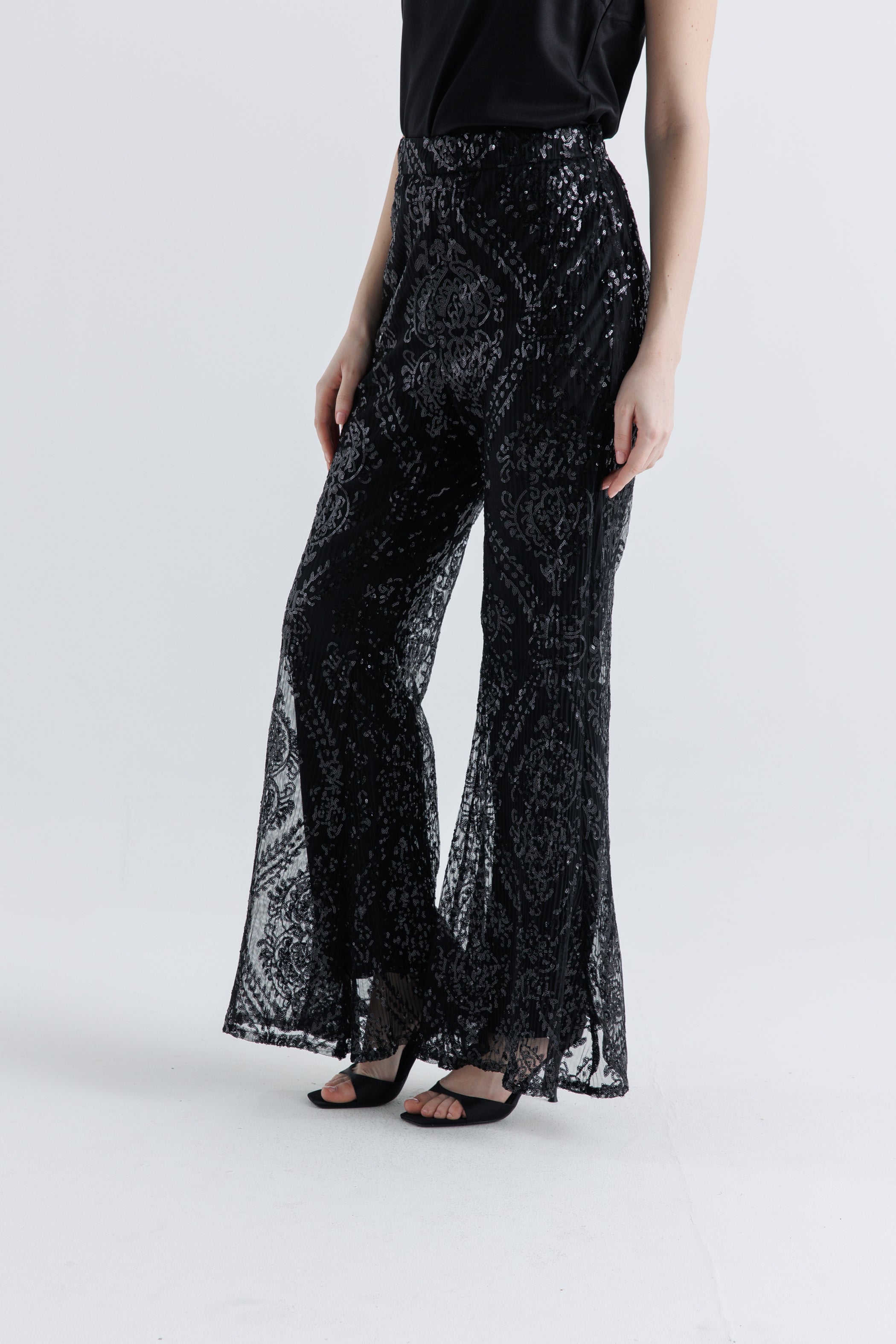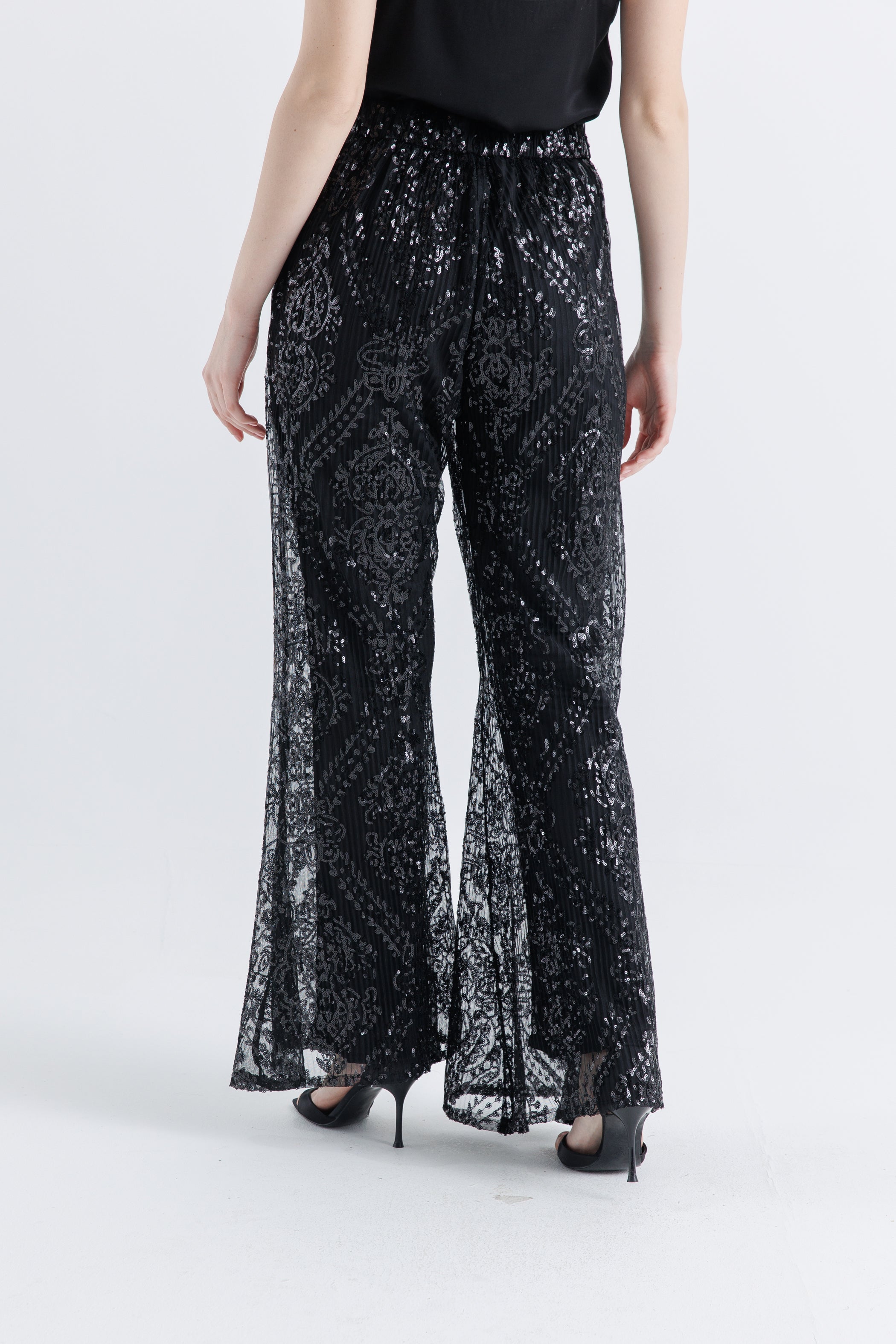 ارتقي بإطلالتك المسائية مع هذا البنطال الواسع المتألق، المزين بالكامل بنقوش ترتر متقنة تضيف لمسة لامعة جذابة مع كل حركة. مصنوع من قماش شبكي خفيف ومبطن بالكامل بالساتان الناعم لتوفير الراحة مع مظهر فخم. يتميز بحزام مطاطي من الخلف لملاءمة مرنة، بينما تضيف القصة الواسعة حركة انسيابية أنيقة. نسّقيه مع القميص المطابق (كود: 2502003) لإطلالة متكاملة مفعمة بالتألق.