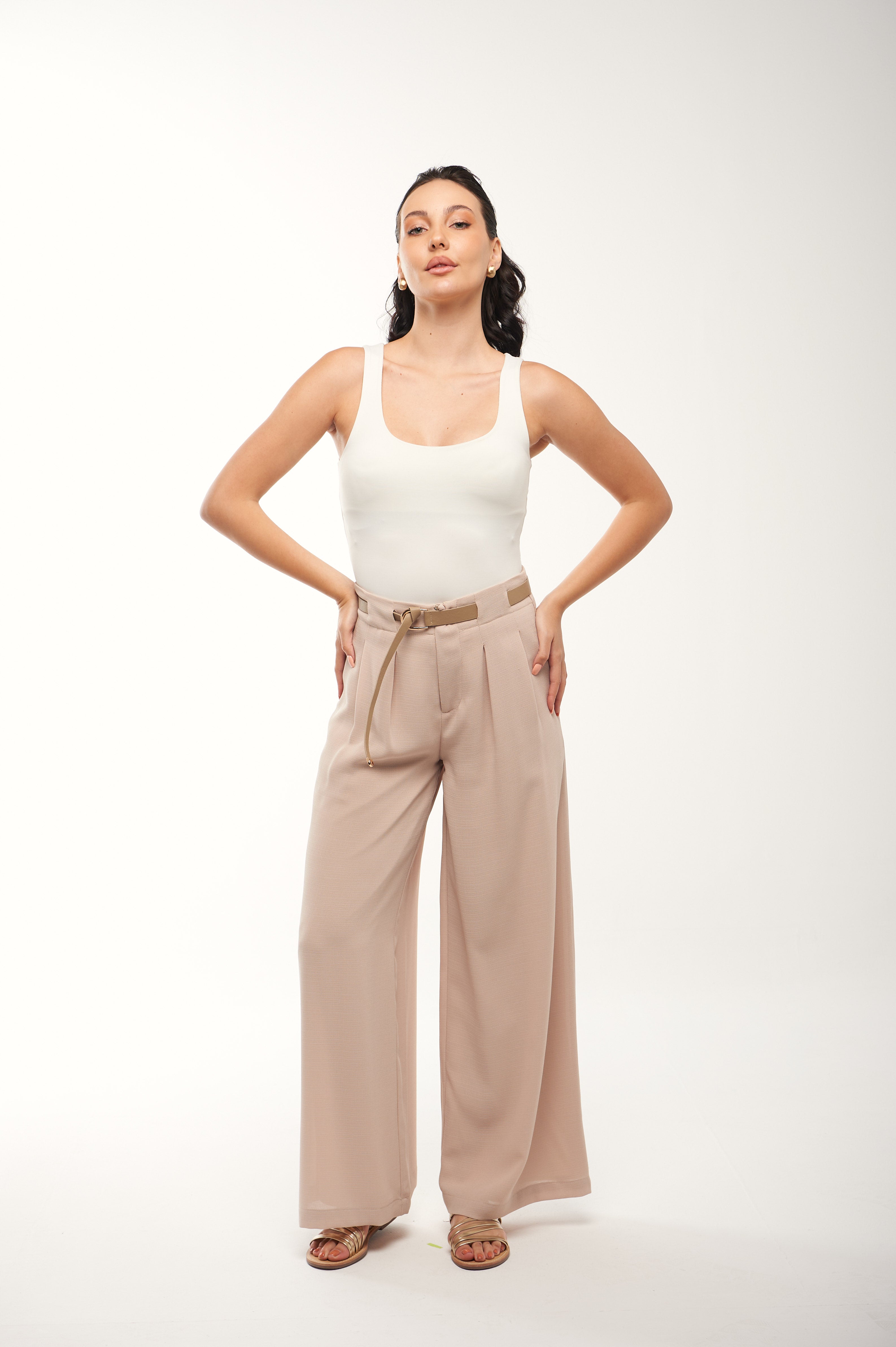 التصميم: بنطال واسع بقصة رسمية مزود بحزام