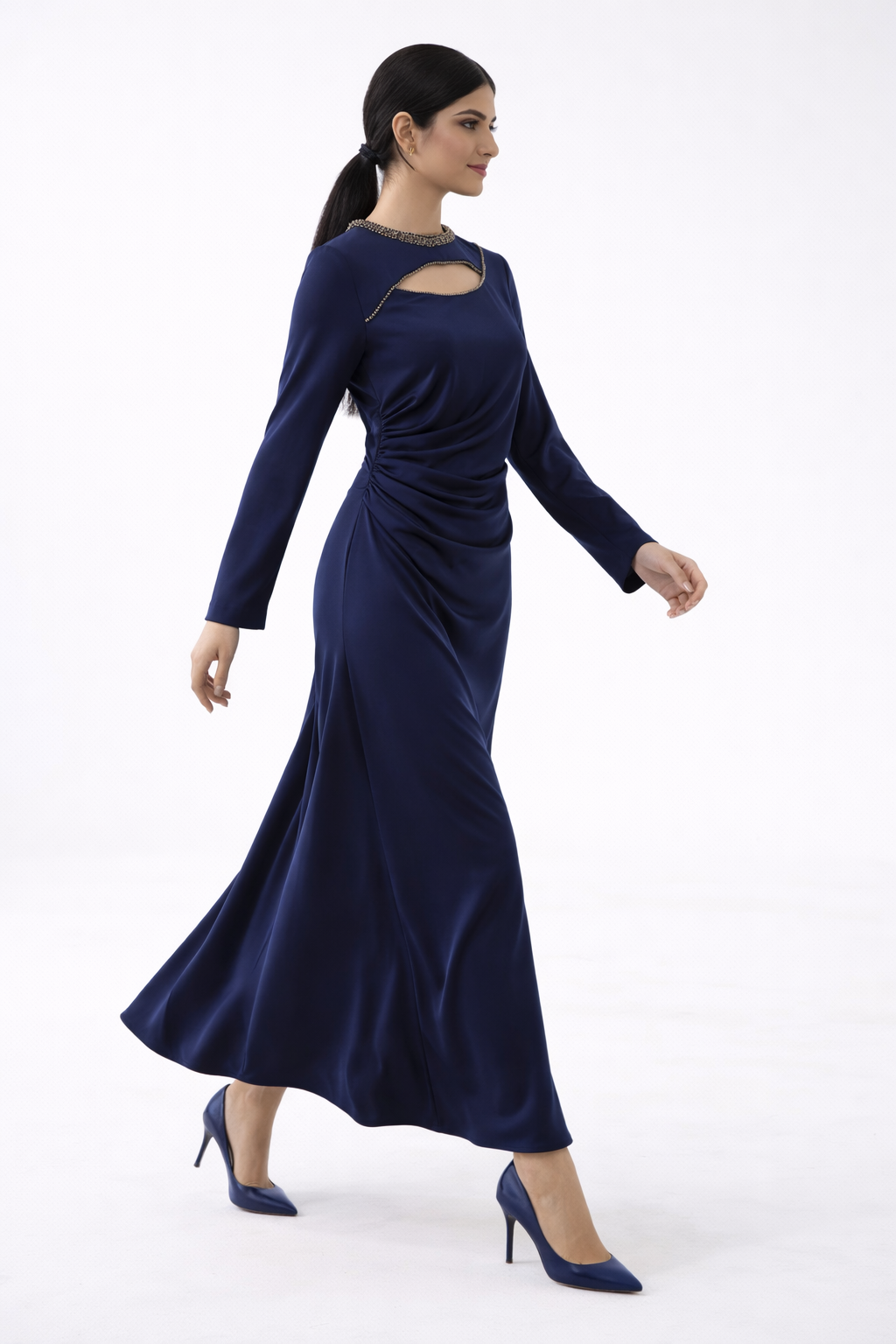 يأتي فستان أمارا المزخرف بتفاصيل خرزية ليجسّد الأناقة العصرية بروح راقية تناسب إطلالات رمضان والعيد. يتميّز بتصميم فتحة غير متماثلة عند خط الرقبة، محاطة بتفاصيل خرزية وتطريزات دقيقة تضيف لمسة فاخرة ناعمة دون مبالغة. كما يبرز التصميم بانسدال أنيق مع طيّات ناعمة عند الخصر تمنح القوام توازناً جذاباً مع الحفاظ على الاحتشام.