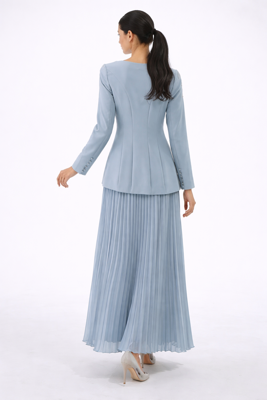نسقيه مع حذاء بكعب أنيق أو صندل رفيع، مع إكسسوارات معدنية أو لؤلؤية ناعمة، وحقيبة كلتش فاخرة لإطلالة مثالية في رمضان أو العيد. يمكن إضافة شال خفيف أو قطعة خارجية أنيقة لإكمال الإطلالة في الأمسيات.