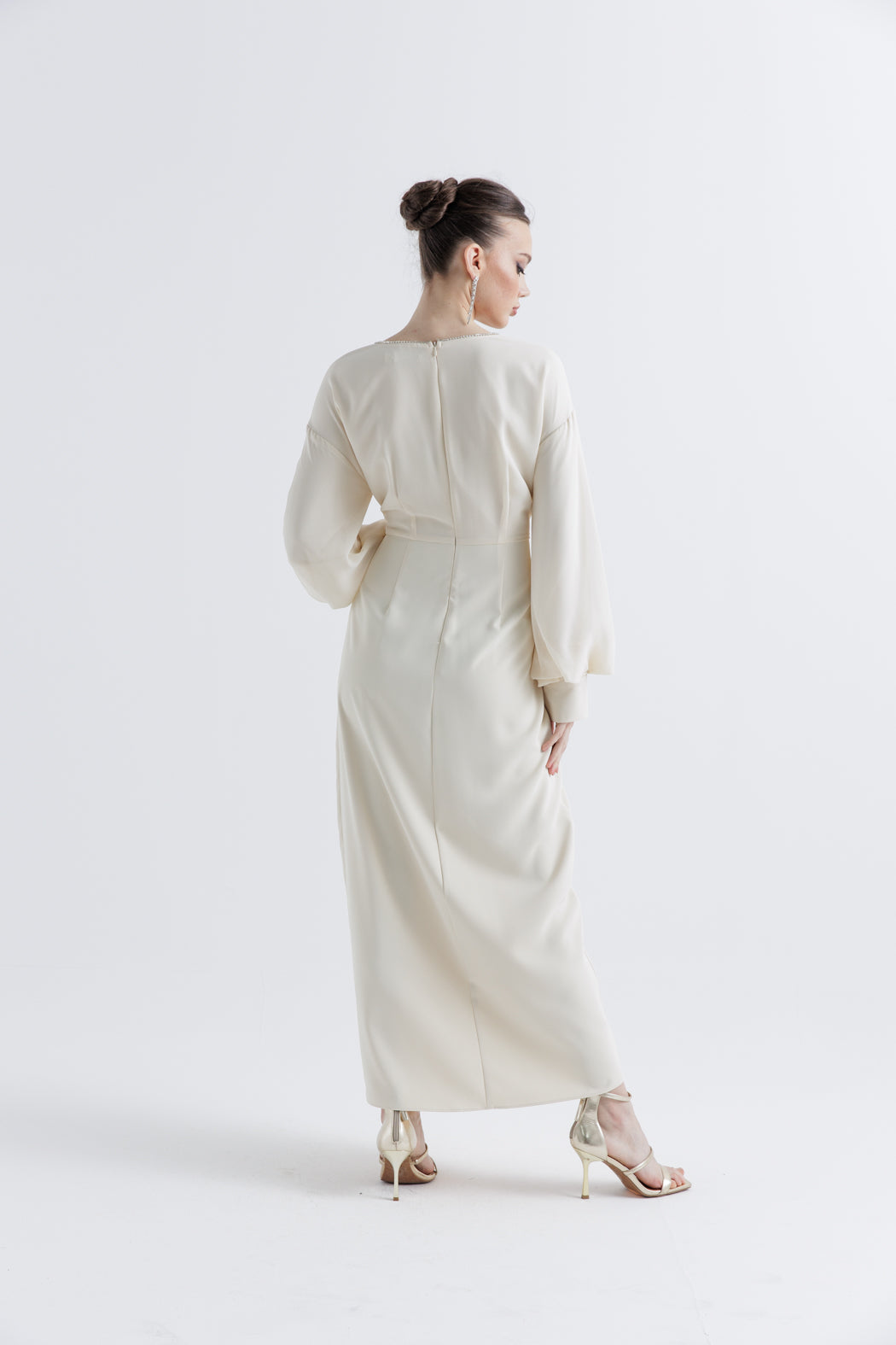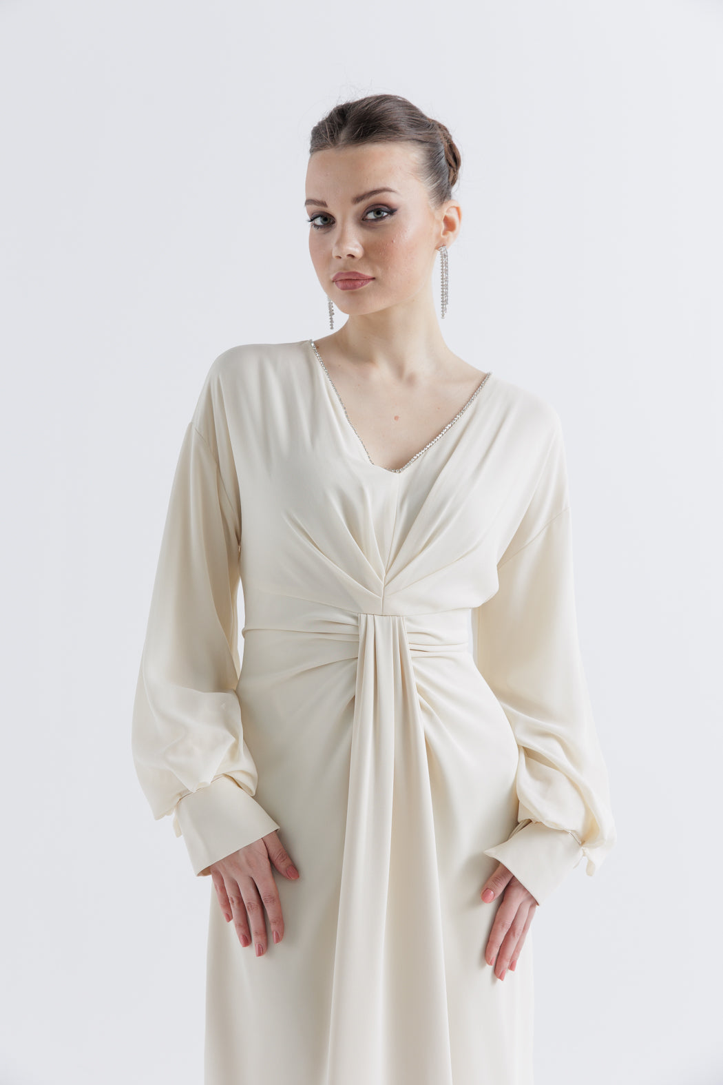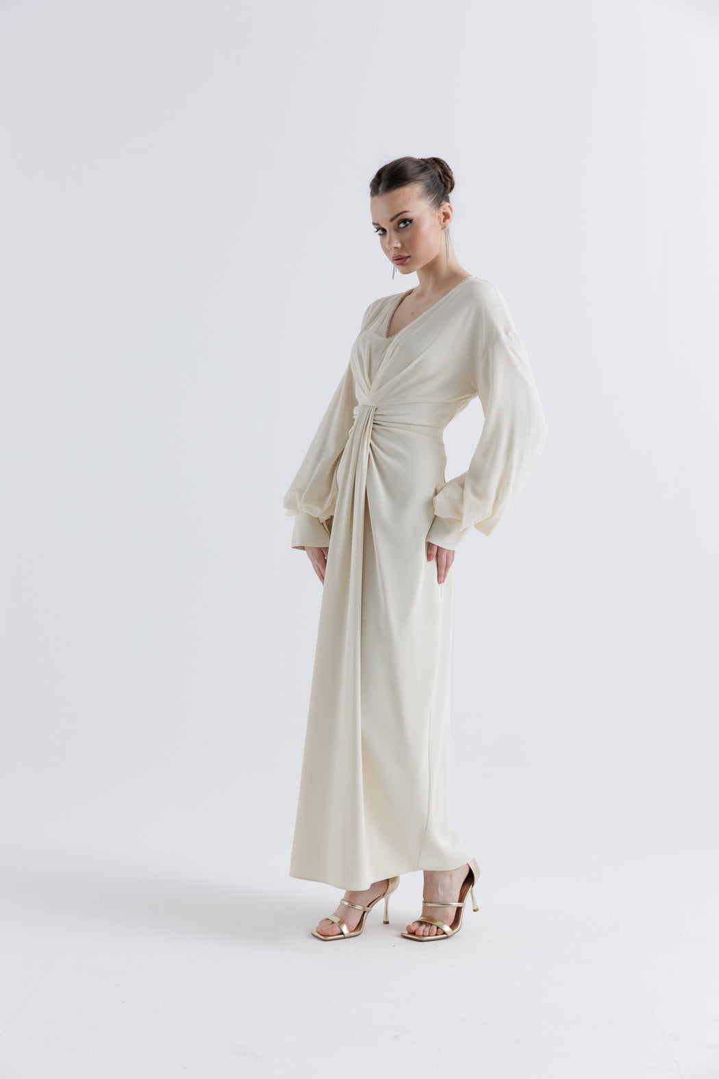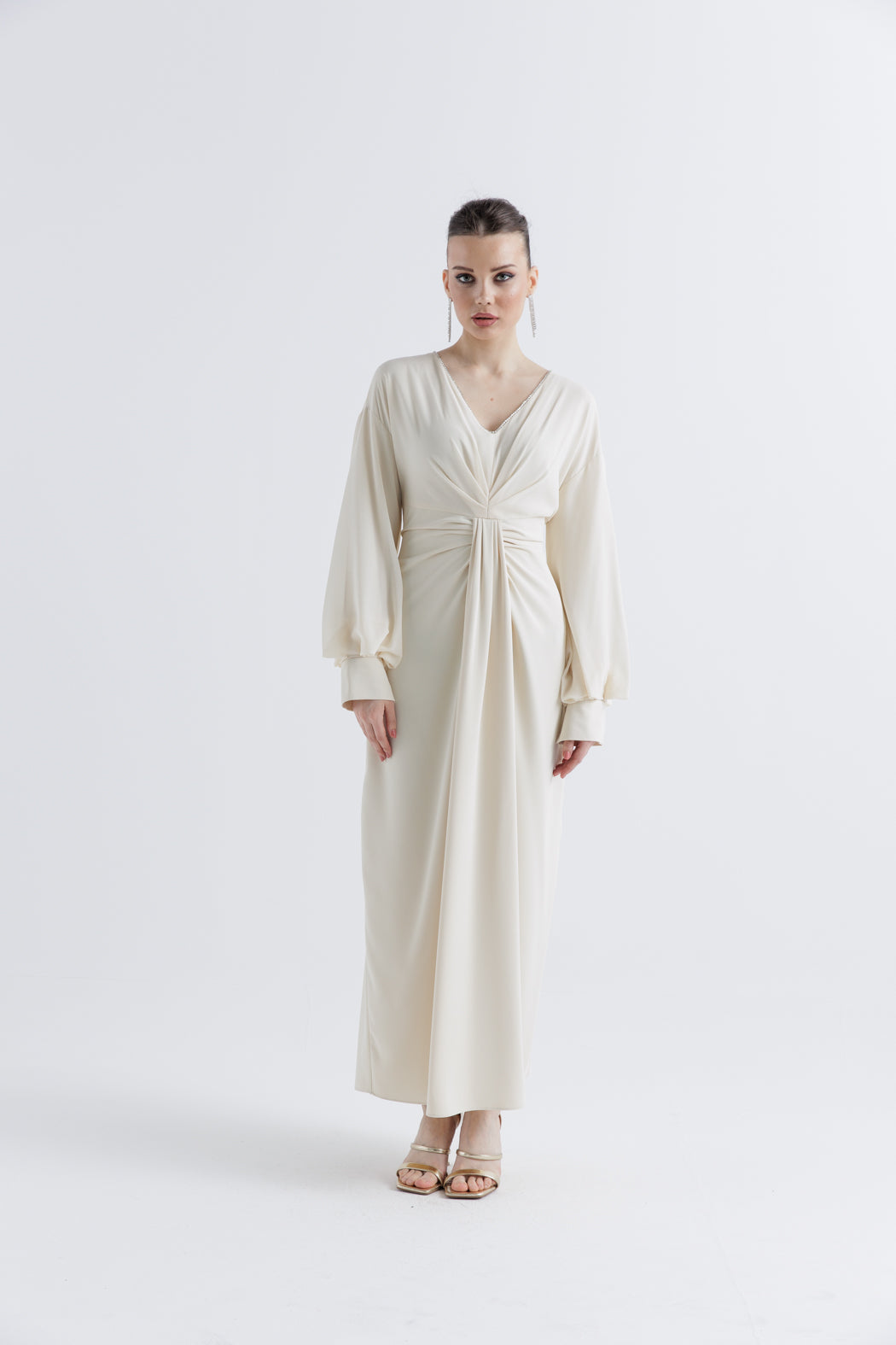تألقي بإطلالة راقية مع هذا الفستان الفخم بتصميم الدرابيه، المثالي لاحتفالات العيد والمناسبات الفاخرة. مصنوع من قماش كريب فاخر، يضفي هذا الفستان لمسة من الأناقة بفضل انسيابيته الناعمة وقصته الهيكلية المميزة.
