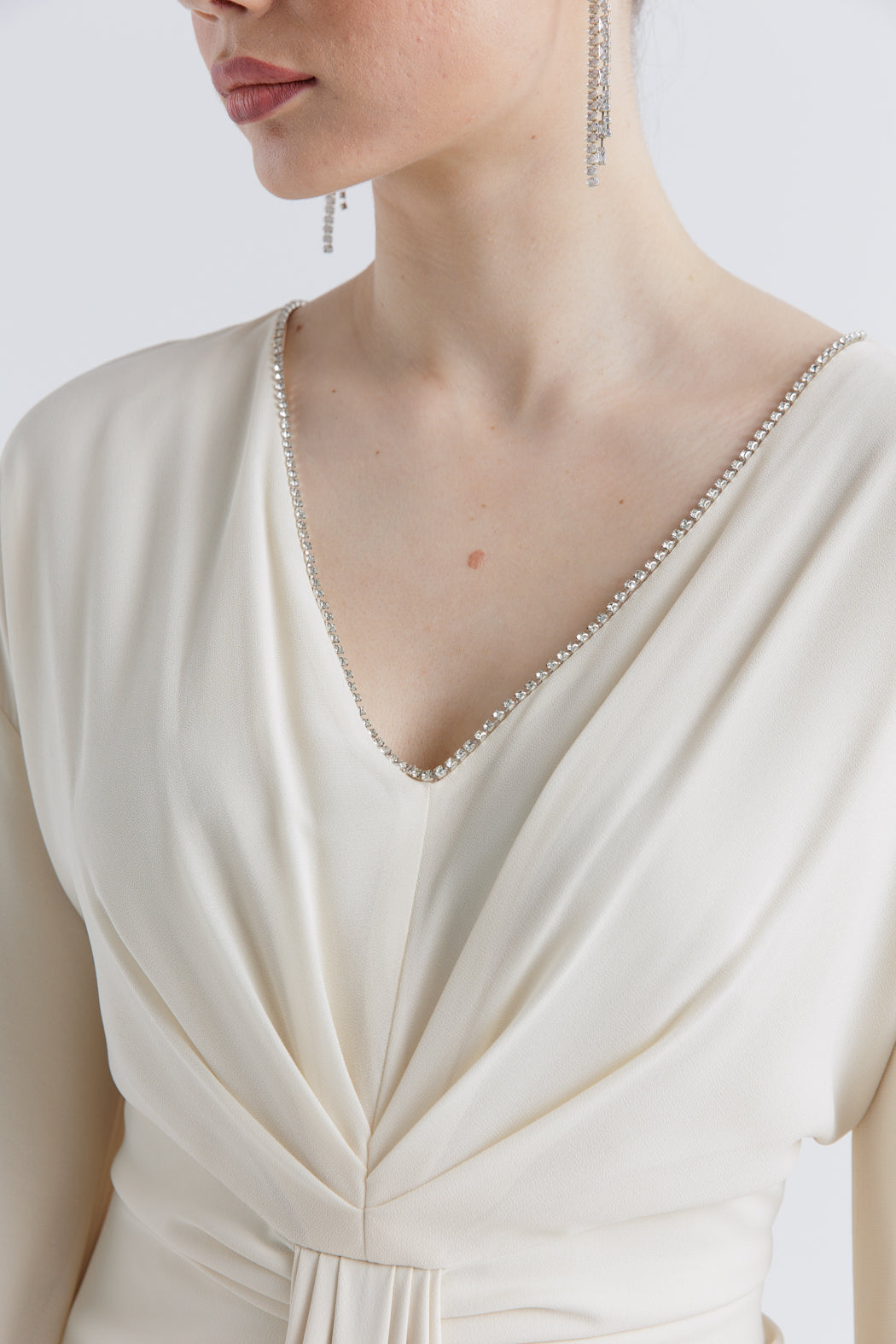 • ياقة على شكل V مزينة بالكريستال، تضيف لمسة فاخرة وبريقاً جذاباً.