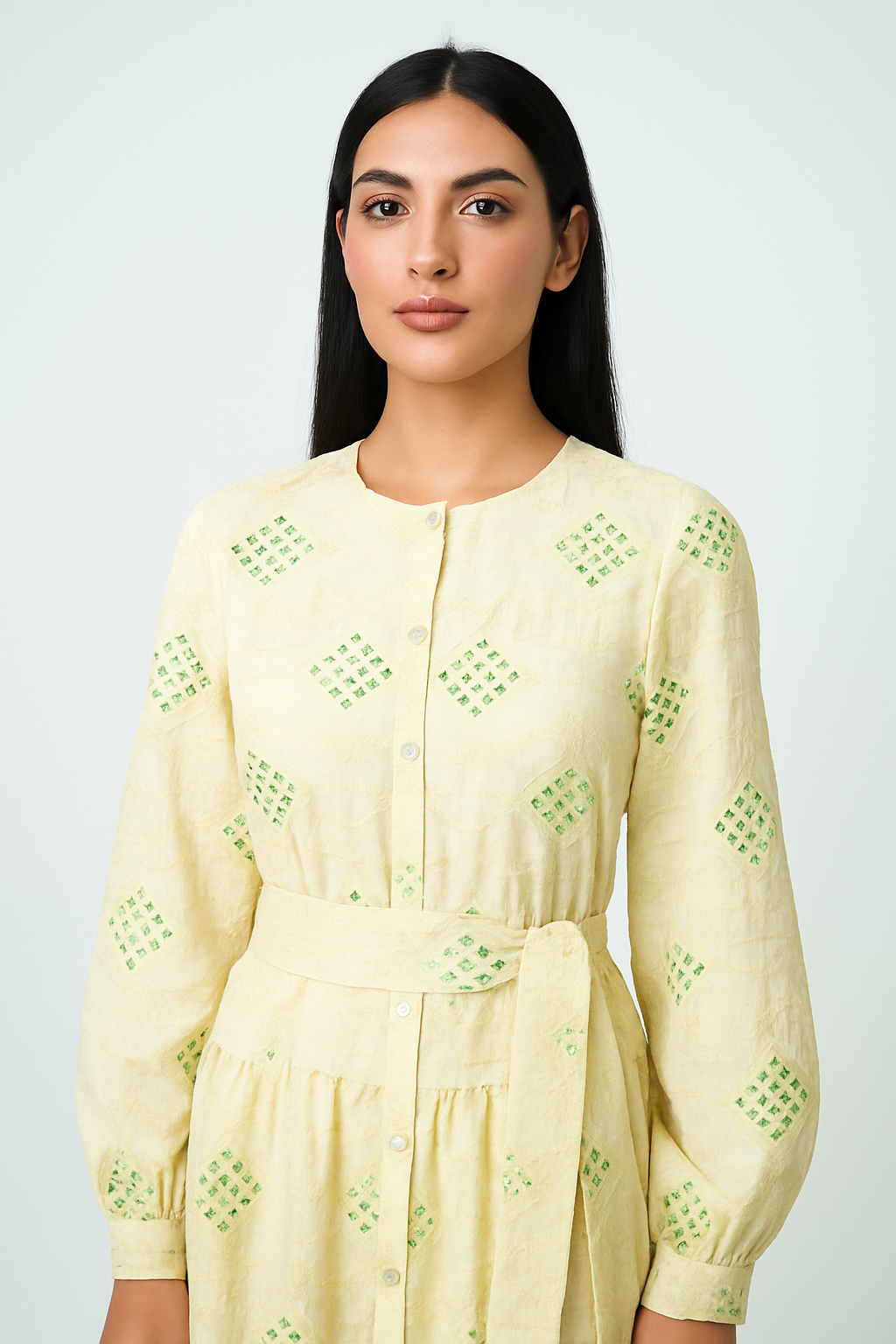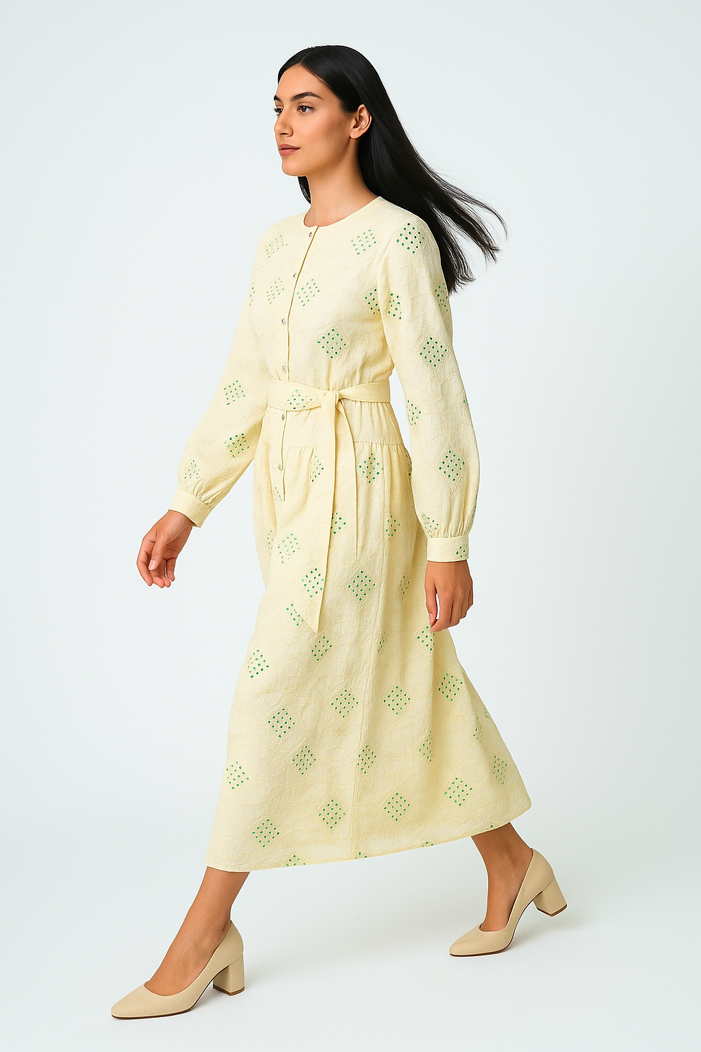 يمنحك هذا الفستان الماكسي المطرز بالترتر لمسة من الأناقة والفخامة، ليكون خيارًا مثاليًا لـ السهرة، المناسبات الرسمية، تجمعات رمضان، أو احتفالات العيد. يتميز بـ ياقة مستديرة، أزرار أمامية، وأكمام طويلة مع تطريز فاخر مزين بلمسات ترتر لامعة تضيف لمسة راقية. كما أن الحزام القابل للإزالة عند الخصر يمنحك قوامًا أكثر جمالًا، فيما يضفي الطول الماكسي 145 سم إطلالة محتشمة بلمسة عصرية.