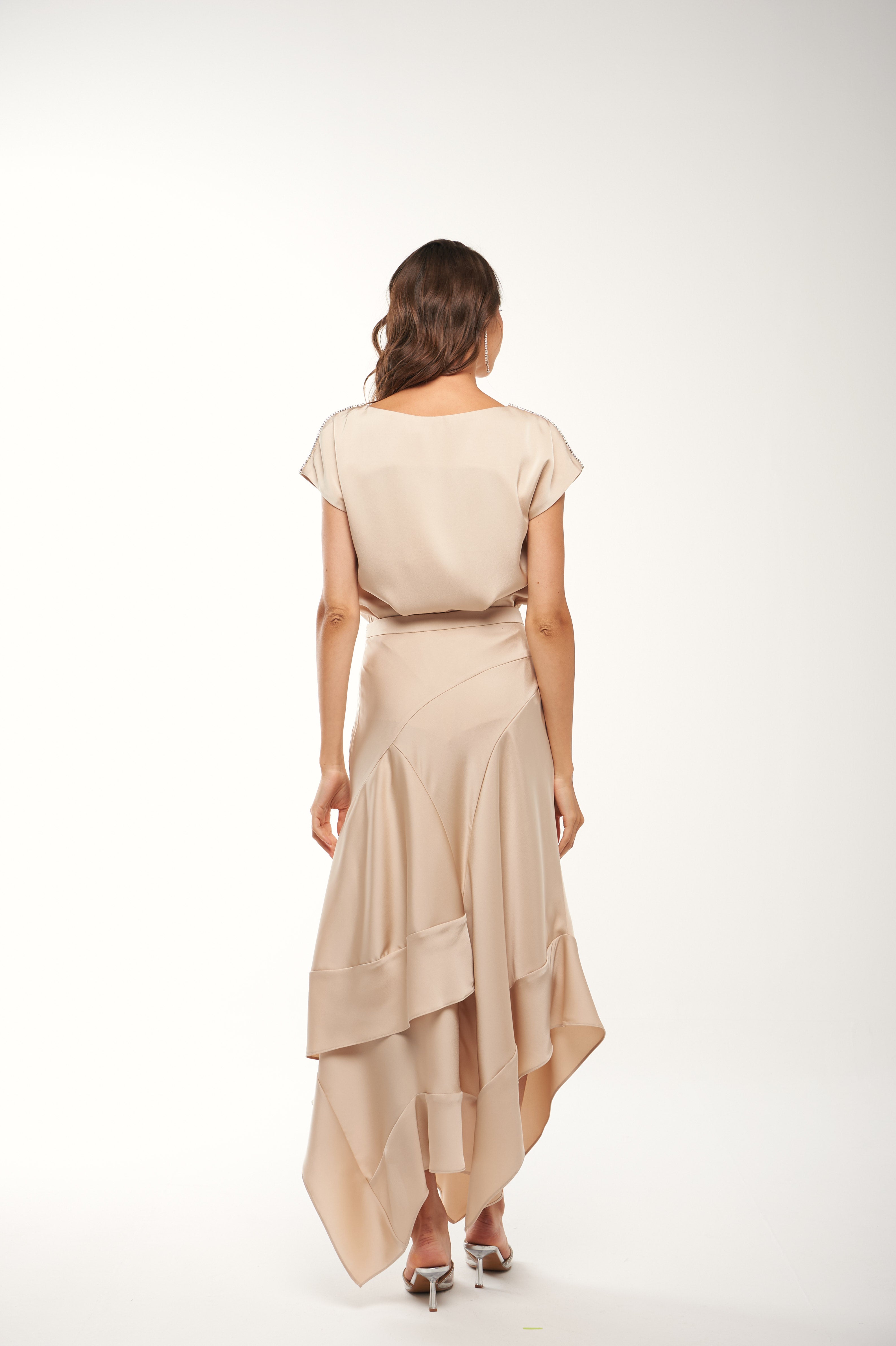 تجسد هذه التنورة الأنيقة بتصميمها غير المتماثل وأنسجتها الانسيابية مظهرًا أنثويًا عصريًا. تضيف طبقات الكشكش المنسدلة لمسة درامية ناعمة، بينما يعزز القصّ المقسم من حركة القماش بأناقة. خيار مثالي للإطلالات المسائية أو المناسبات النهارية الراقية.