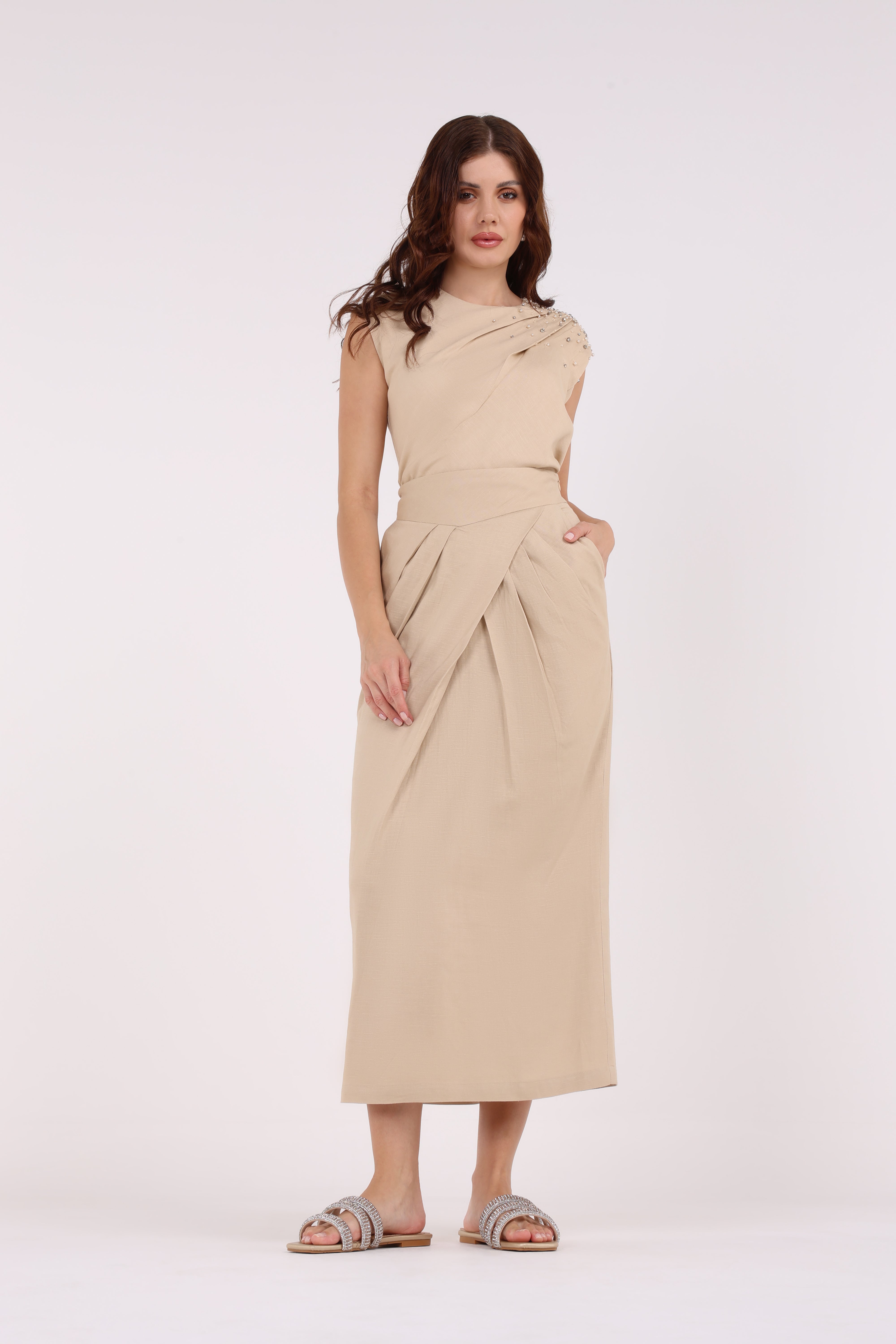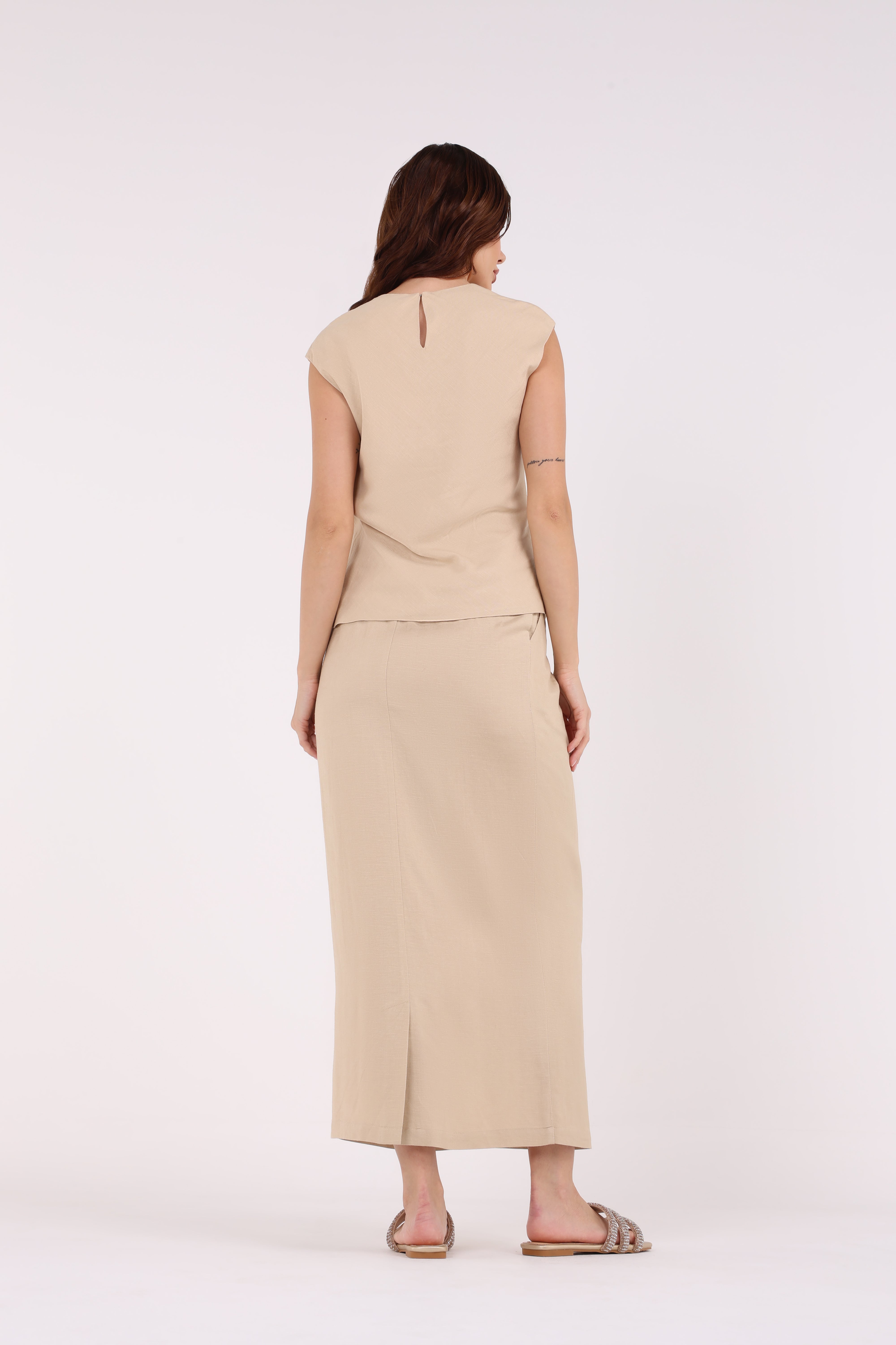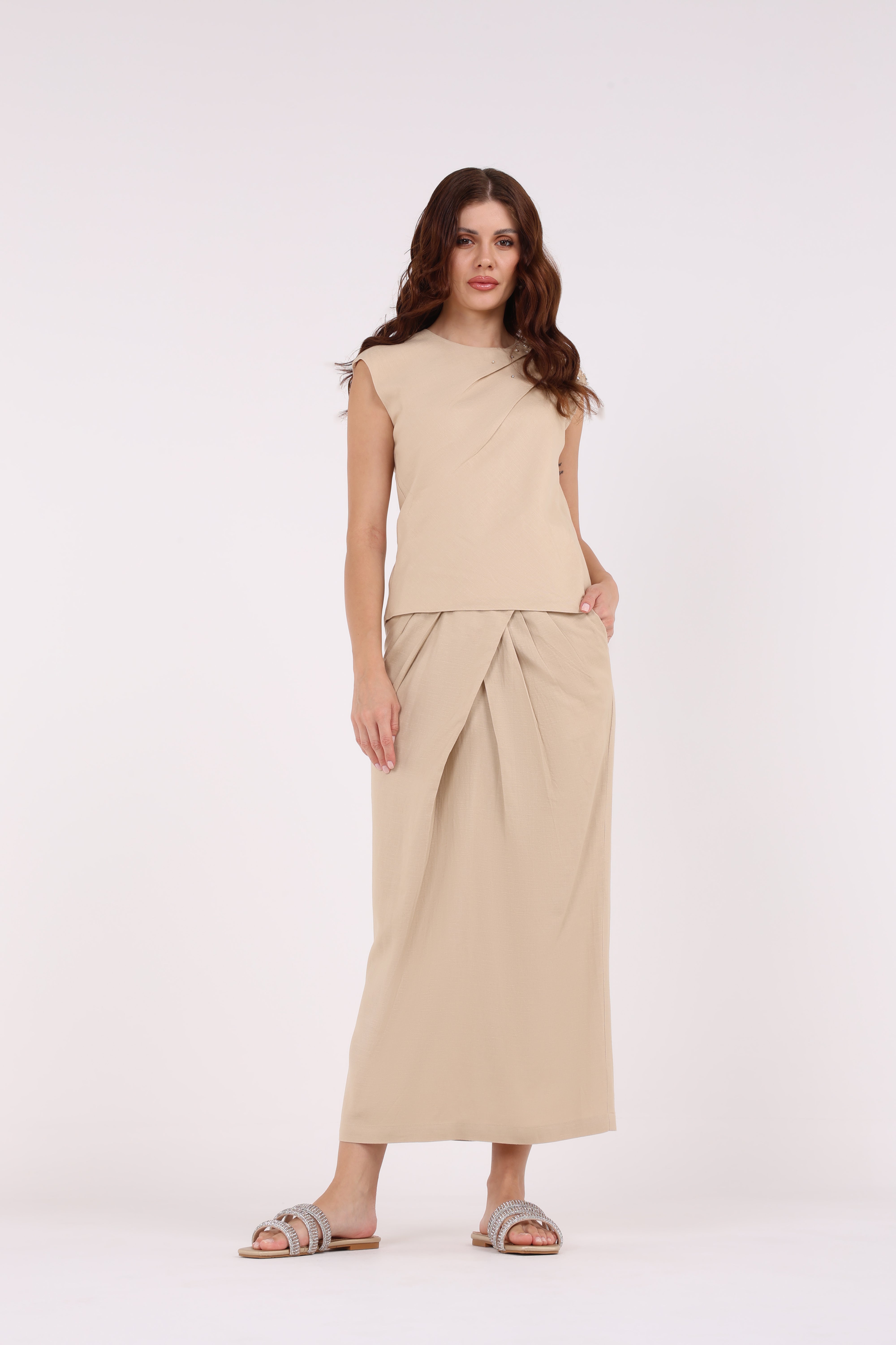 تتميز هذه التنورة الطويلة الأنيقة بتصميم خصر مطوي فريد من نوعه يضيف ملمسًا وجاذبية بصرية للصورة الظلية الكلاسيكية. مصنوعة من قماش عالي الجودة وفضفاض، توفر الراحة والملاءمة الجذابة. يشد حزام الخصر المطوي بلطف عند الخصر، مما يبرز الشكل ويسمح بسهولة الحركة. بفضل لونها السادة، يمكن تنسيق هذه التنورة متعددة الاستخدامات بسهولة مع مجموعة متنوعة من القمم، من التيشيرتات غير الرسمية إلى البلوزات الأنيقة. مثالية للنزهات غير الرسمية والمناسبات الرسمية، تعد التنورة الطويلة ذات الخصر المطوي إضافة خالدة لأي خزانة ملابس، مما يرفع من أناقتك دون عناء.