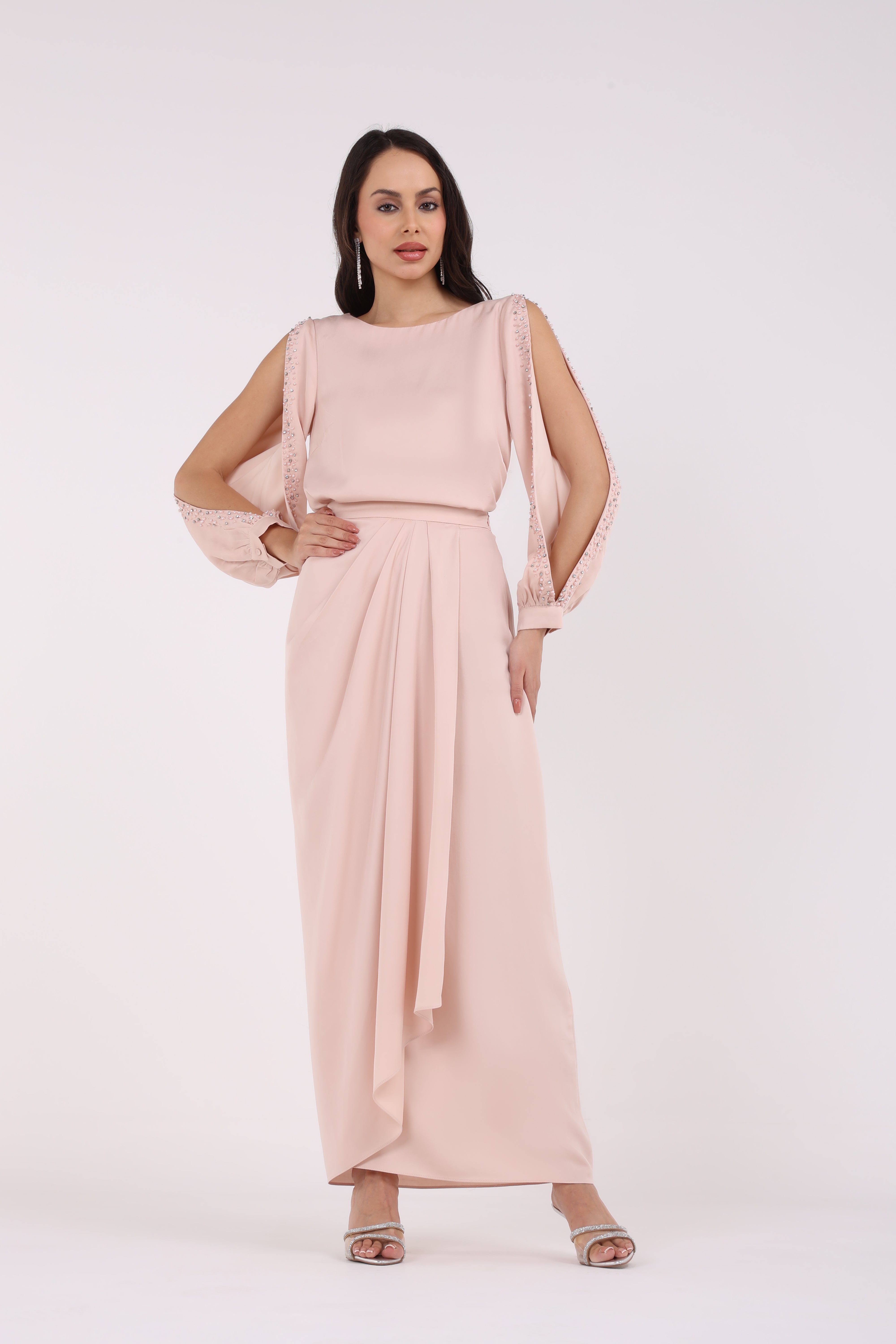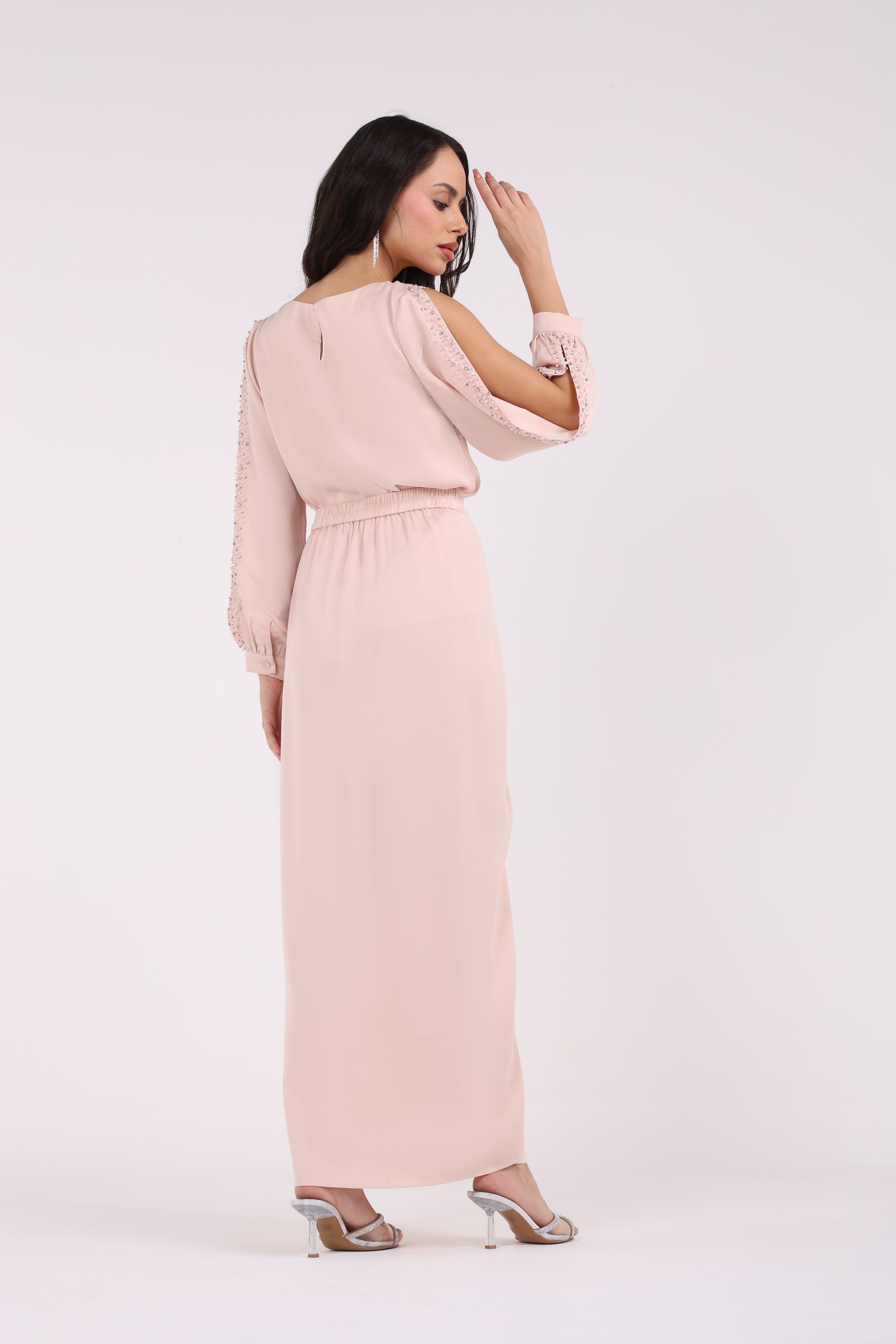 يوفر التصميم غير المتماثل لمسة معاصرة، مما يجعل هذا الزي مثاليًا للمناسبات الرسمية أو الأحداث الخاصة حيث تريد التميز برقي خالد.