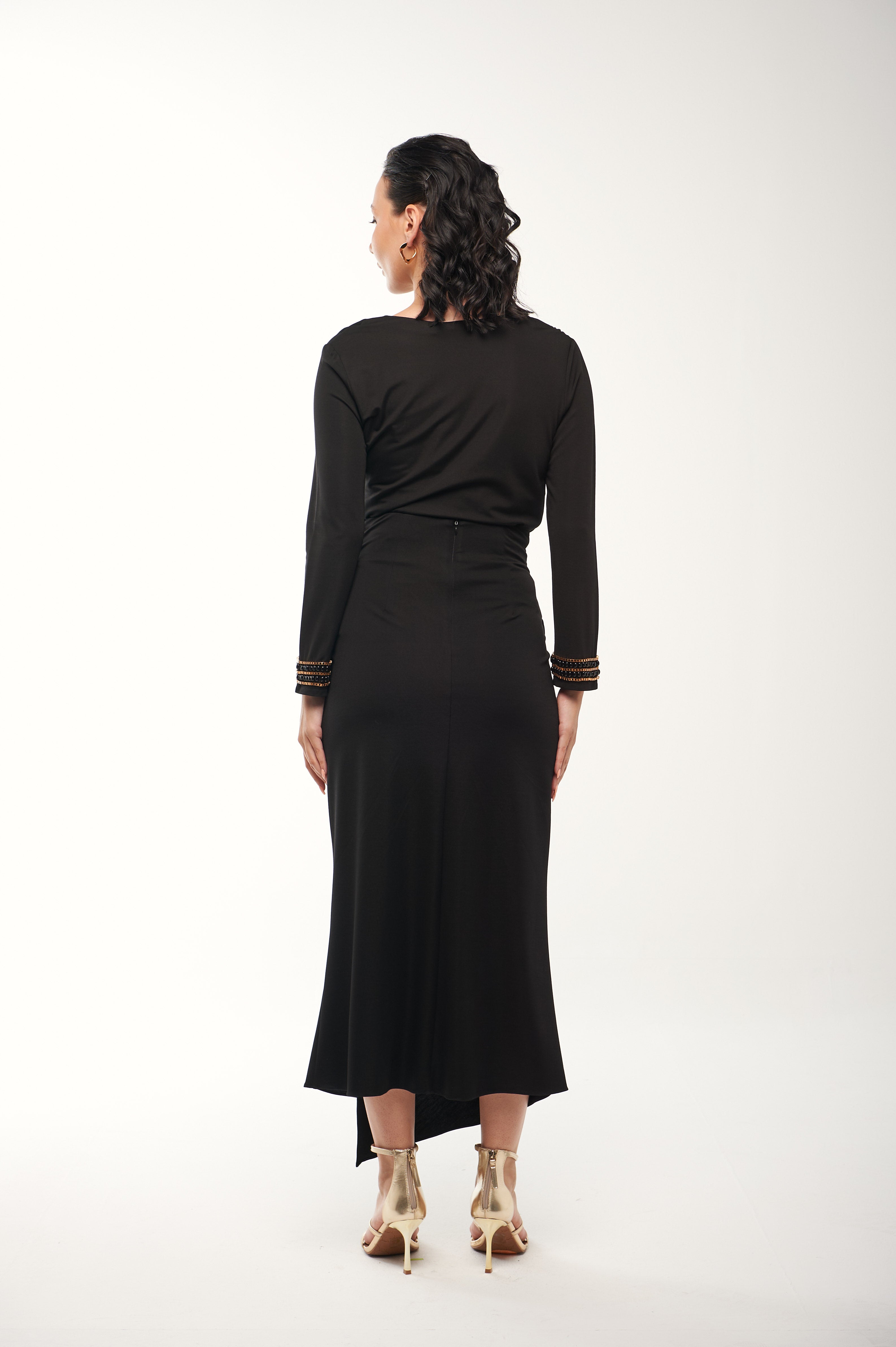 إطلالة أنثوية راقية مع هذه التنورة المتوسطة الطول المصممة بقصة درابية أنيقة وربطة عند الخصر تُبرز القوام بأسلوب ناعم وجذاب. الحافة غير المتماثلة والانسيابية تضيفان لمسة من الرقي والحركة، مما يجعلها مثالية للمناسبات الخاصة أو السهرات أو التجمعات الرمضانية.