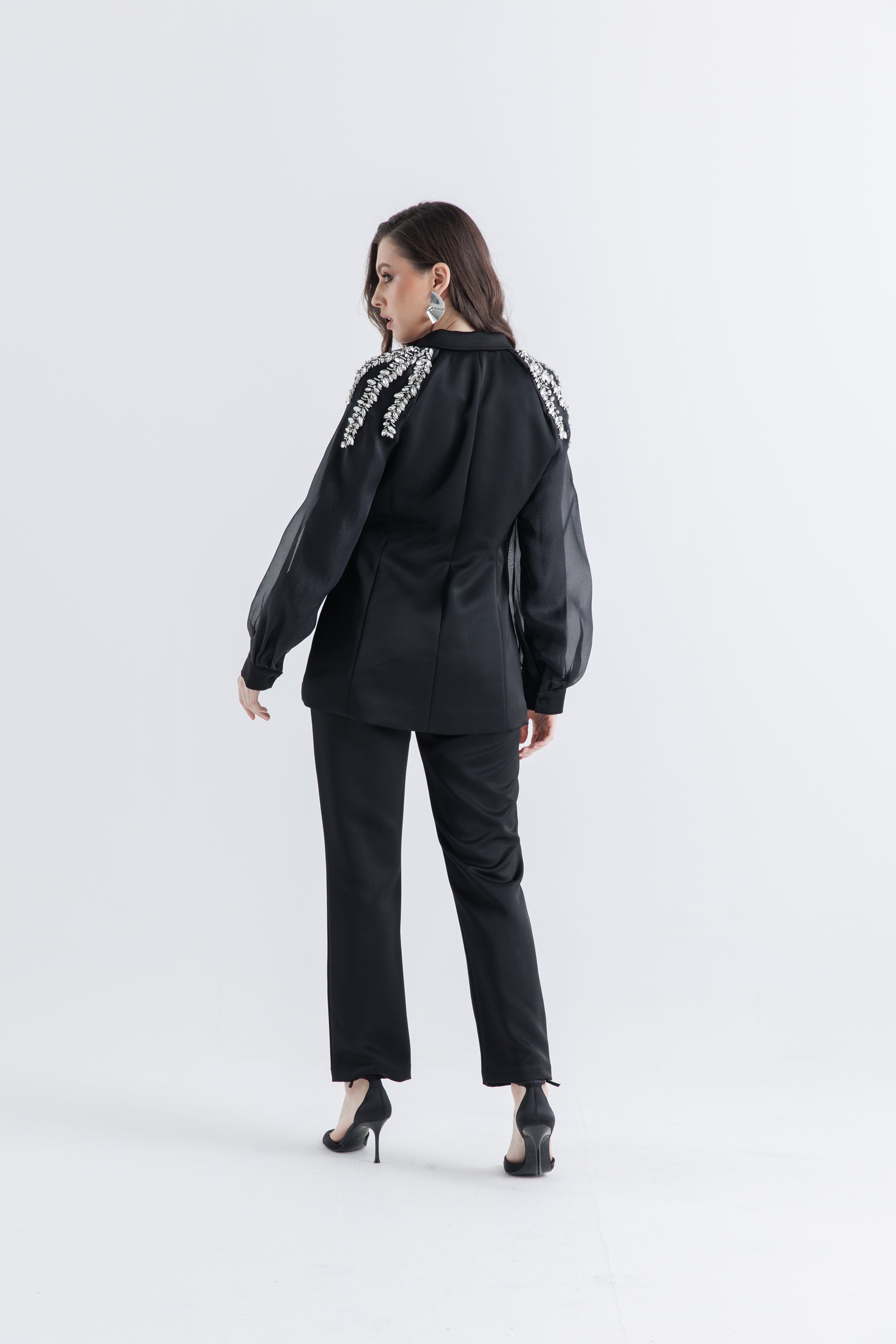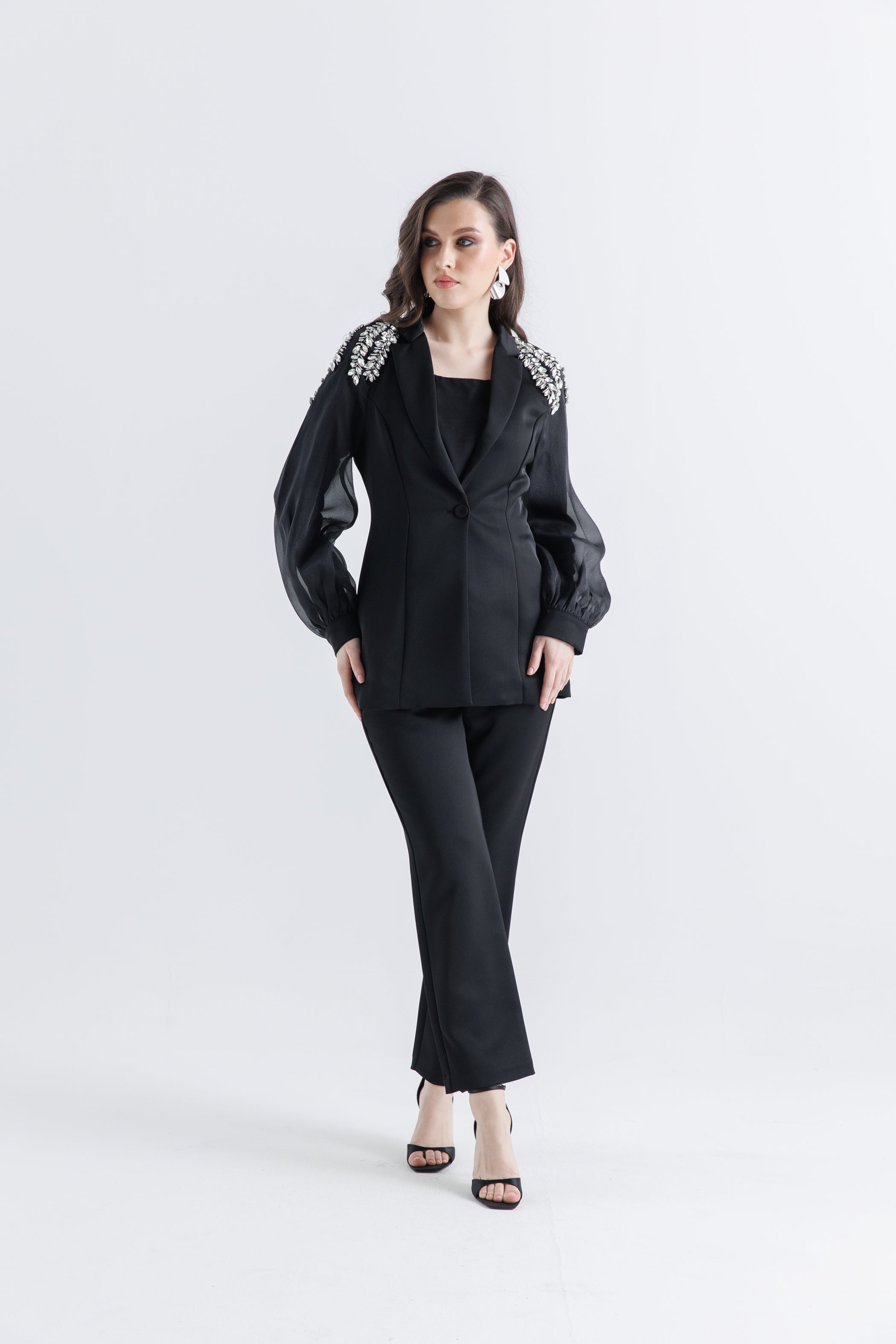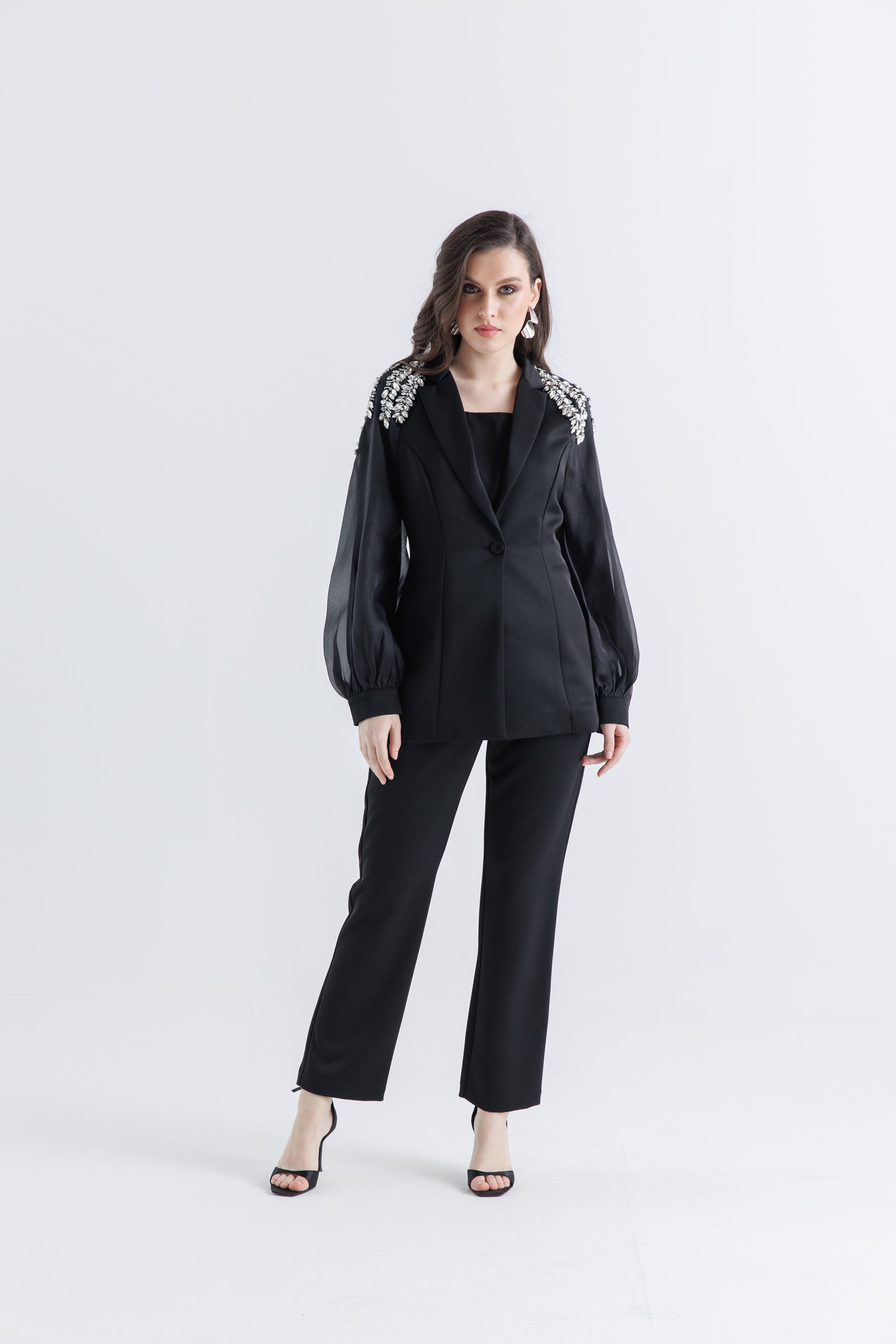 ارتقي بإطلالتك مع هذا البليزر المصمم بتفصيل أنيق وهيكل انسيابي يعكس الذوق الراقي للمرأة العصرية. يتميز بأكمام من قماش الأورجانزا الشفاف تضيف لمسة من الحجم والتباين، بينما تزين الأكتاف تفاصيل كريستالية فاخرة تمنحك لمسة من التألق والرقي. التصميم الأنيق بياقة كلاسيكية وزر إغلاق أمامي واحد يعزز الطابع الرسمي الجذاب، مما يجعله خياراً مثالياً للمناسبات الرسمية والإطلالات المسائية المميزة. يمكن تنسيقه مع البنطلون كود 2504059 لإطلالة متكاملة.