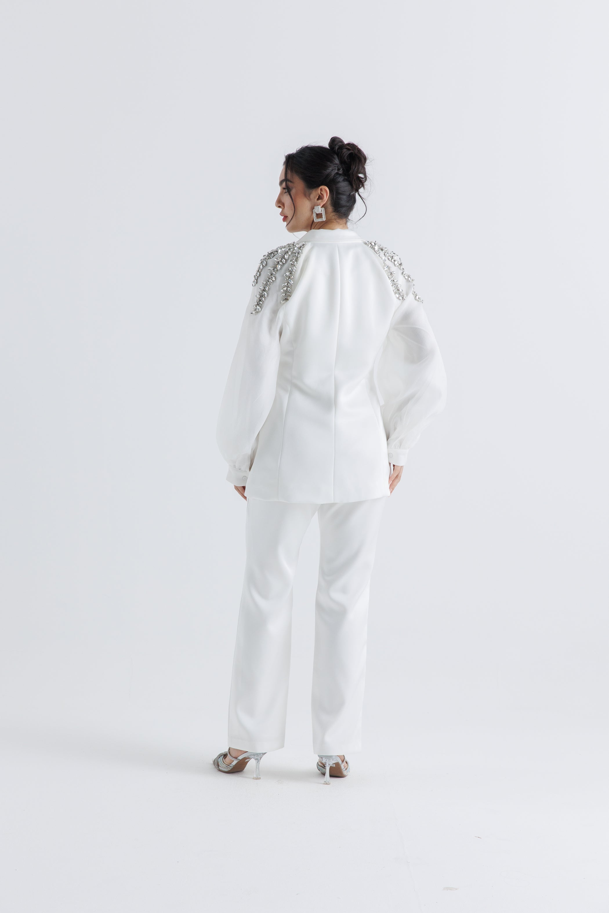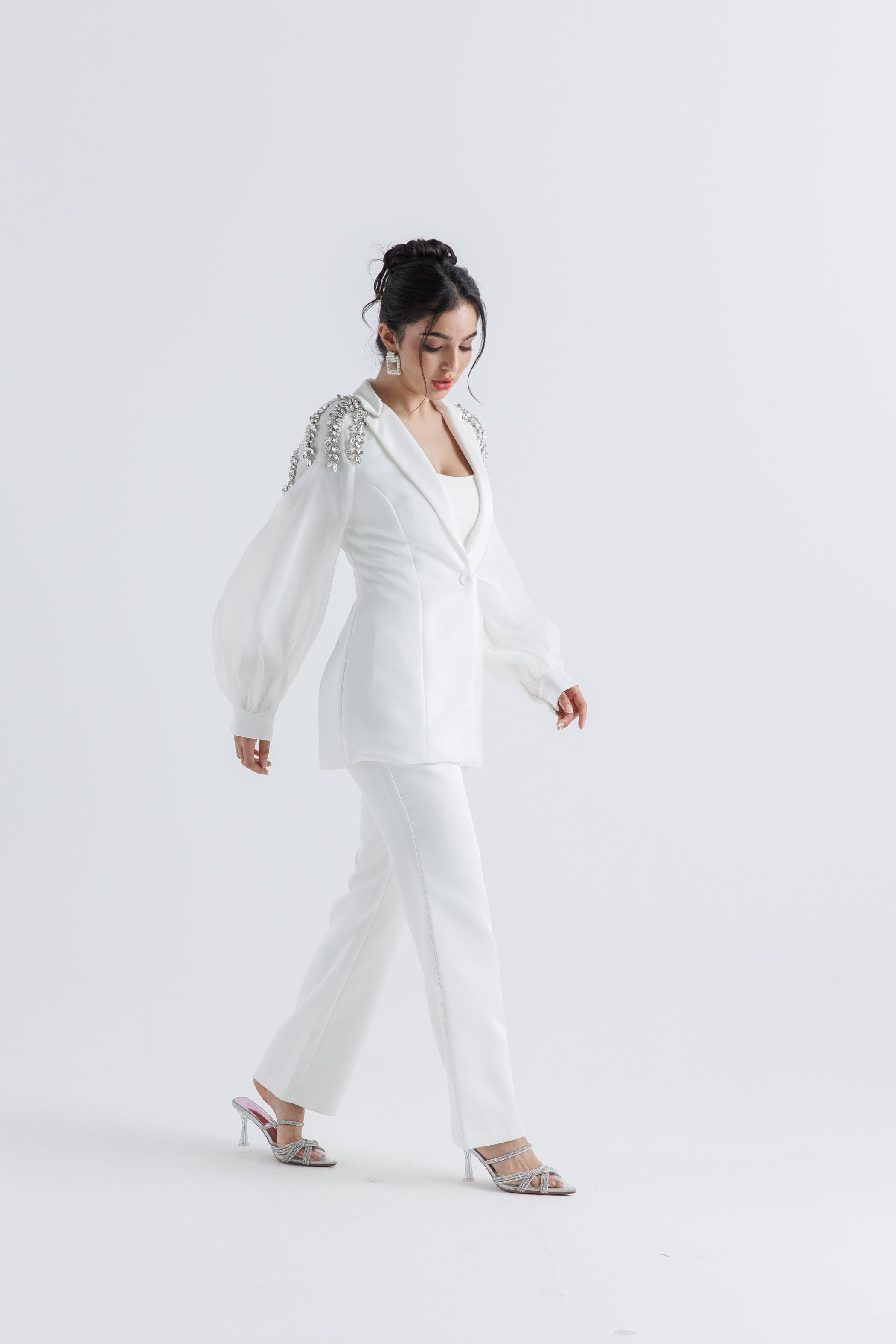 ارتقي بإطلالتك مع هذا البليزر المصمم بتفصيل أنيق وهيكل انسيابي يعكس الذوق الراقي للمرأة العصرية. يتميز بأكمام من قماش الأورجانزا الشفاف تضيف لمسة من الحجم والتباين، بينما تزين الأكتاف تفاصيل كريستالية فاخرة تمنحك لمسة من التألق والرقي. التصميم الأنيق بياقة كلاسيكية وزر إغلاق أمامي واحد يعزز الطابع الرسمي الجذاب، مما يجعله خياراً مثالياً للمناسبات الرسمية والإطلالات المسائية المميزة. يمكن تنسيقه مع البنطلون كود 2504059 لإطلالة متكاملة.