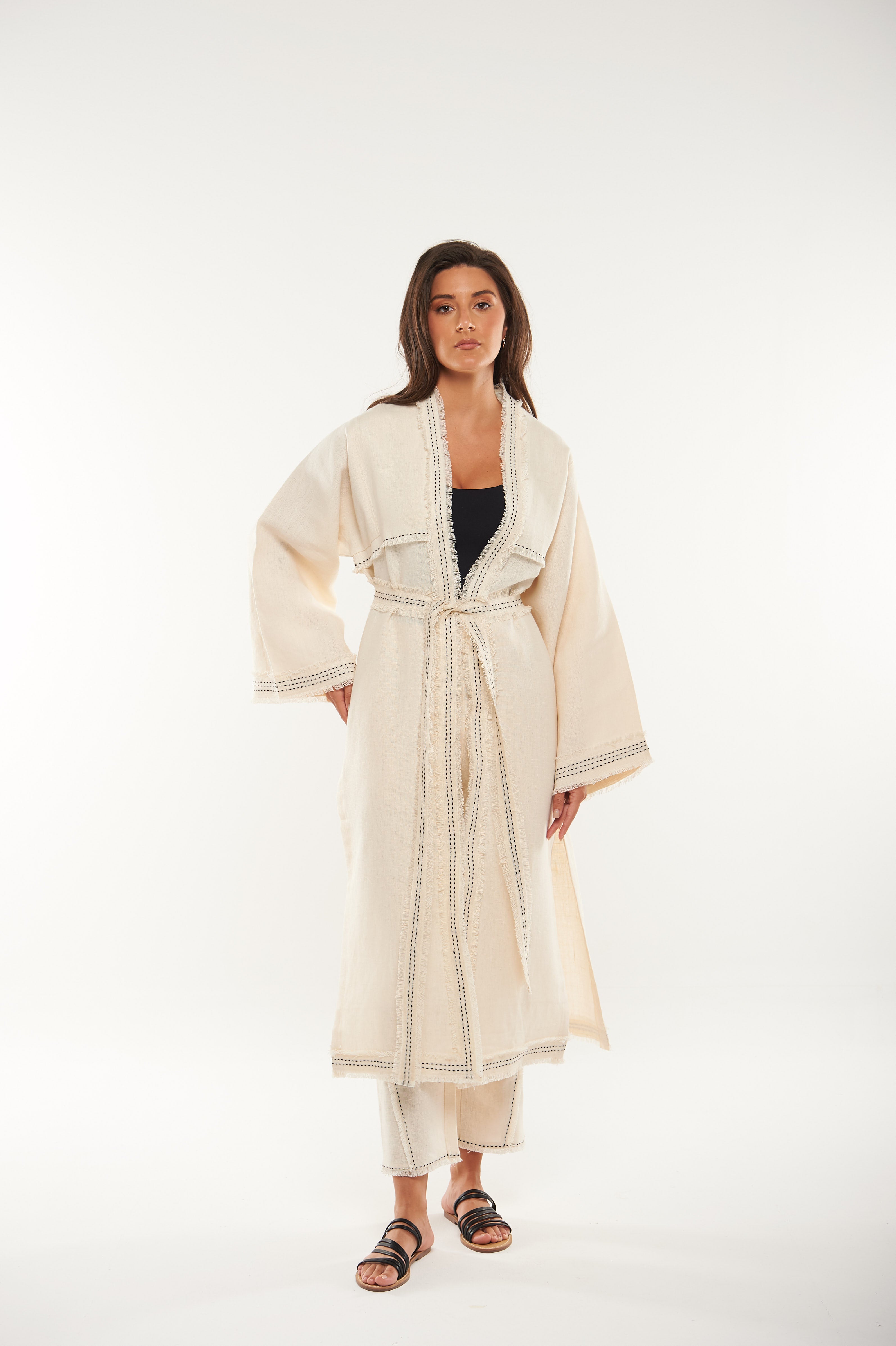 تفاصيل التصميم: واجهة مفتوحة مع خياطة تزيينية متباينة، حزام قماشي قابل للإزالة، أكمام واسعة، حواف بتشطيب نظيف