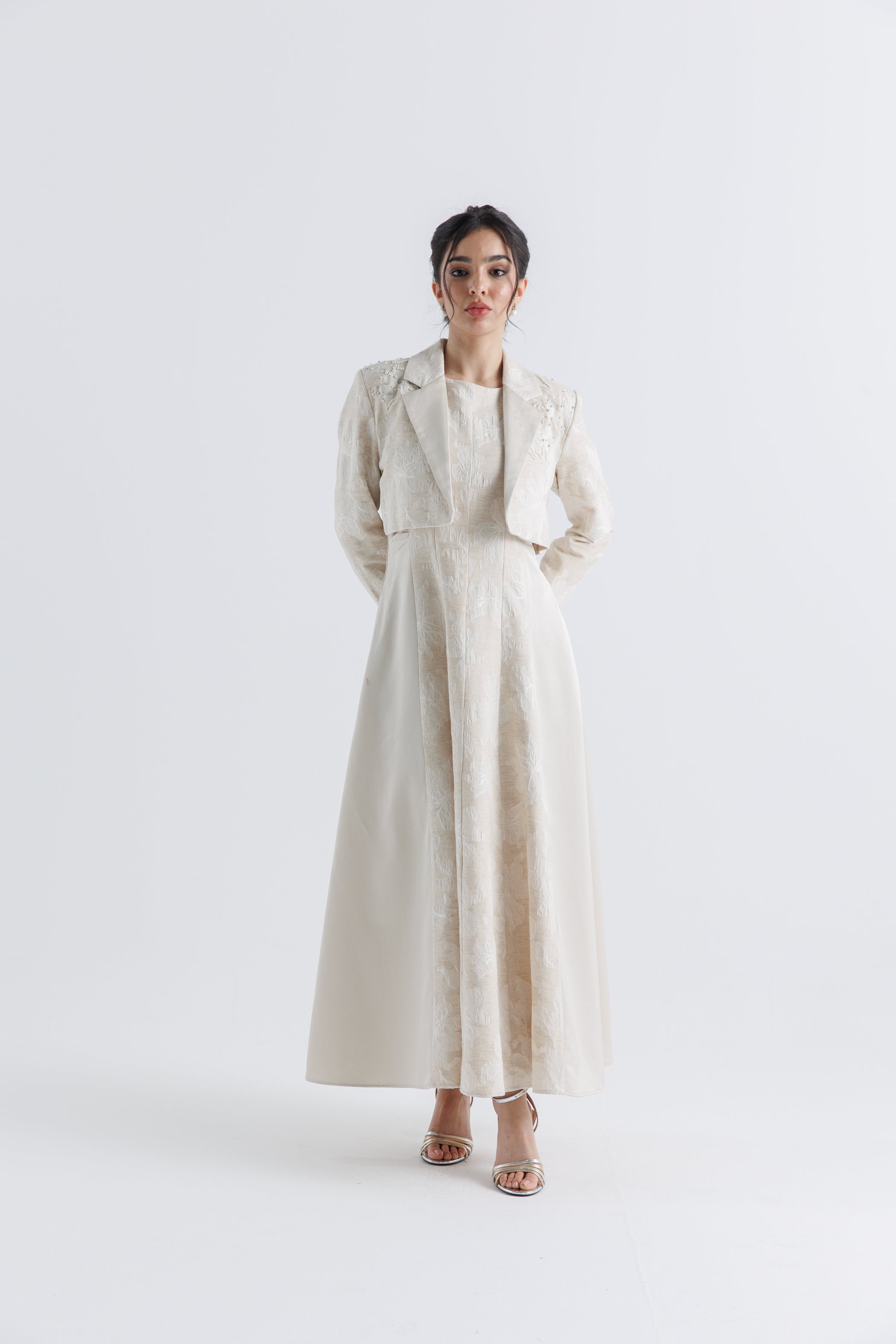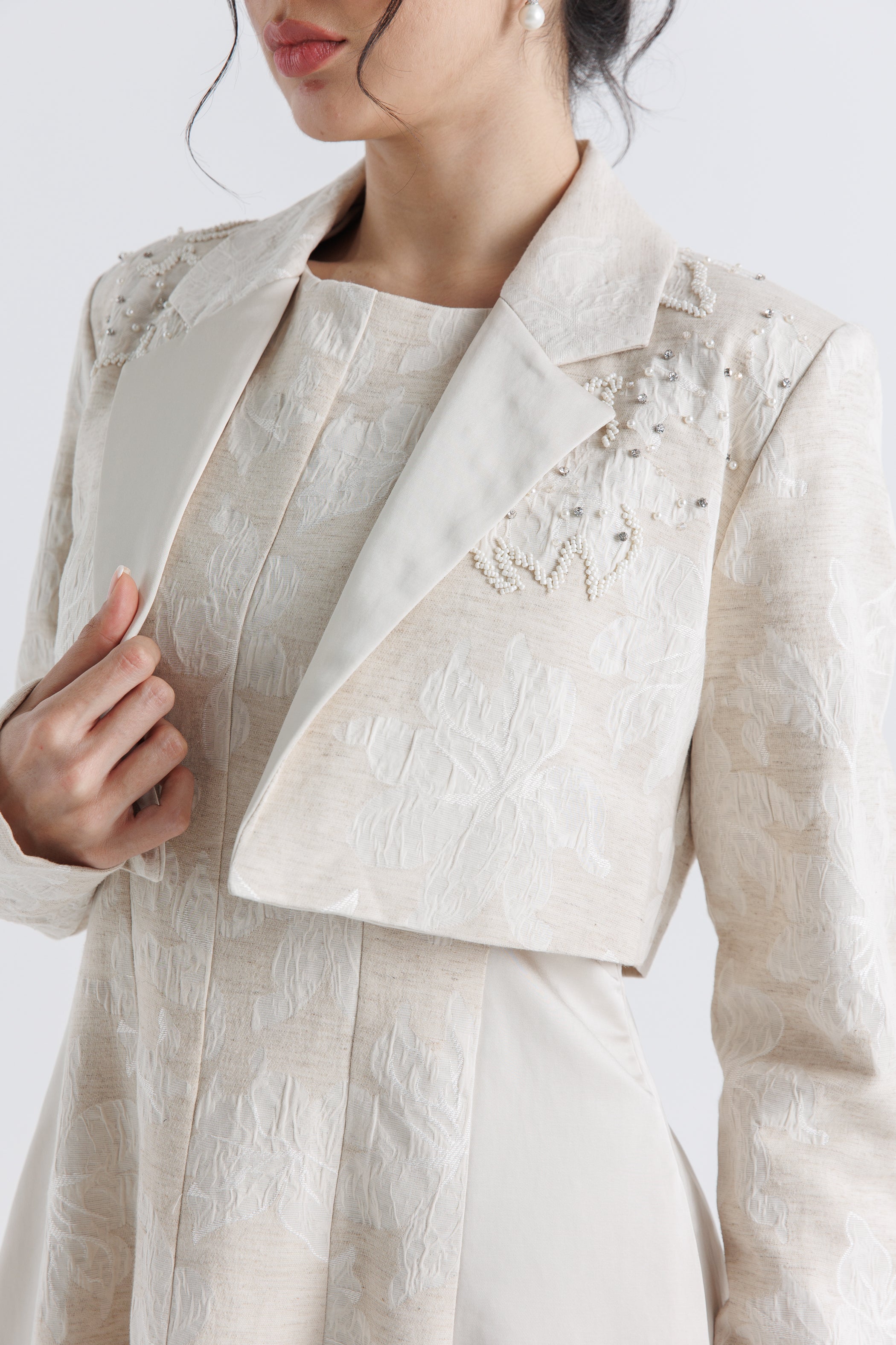أضيفي لمسة من الفخامة إلى إطلالتك مع هذا الجاكيت القصير الأنيق، المصمم من قماش جاكار فاخر بنقشة زهرية بارزة. يتميز الجاكيت بتطريز ناعم بلون متناسق مع لمسات يدوية من اللؤلؤ والكريستال على الكتفين، مما يمنحه طابعاً راقياً. يأتي بقصّة محددة مع ياقة كلاسيكية وتصميم مفتوح يضفي مظهراً عصرياً أنيقاً. يمكن تنسيقه بكل سلاسة مع الفستان المطابق (رقم 2543005) لإطلالة أنثوية متكاملة وراقية.