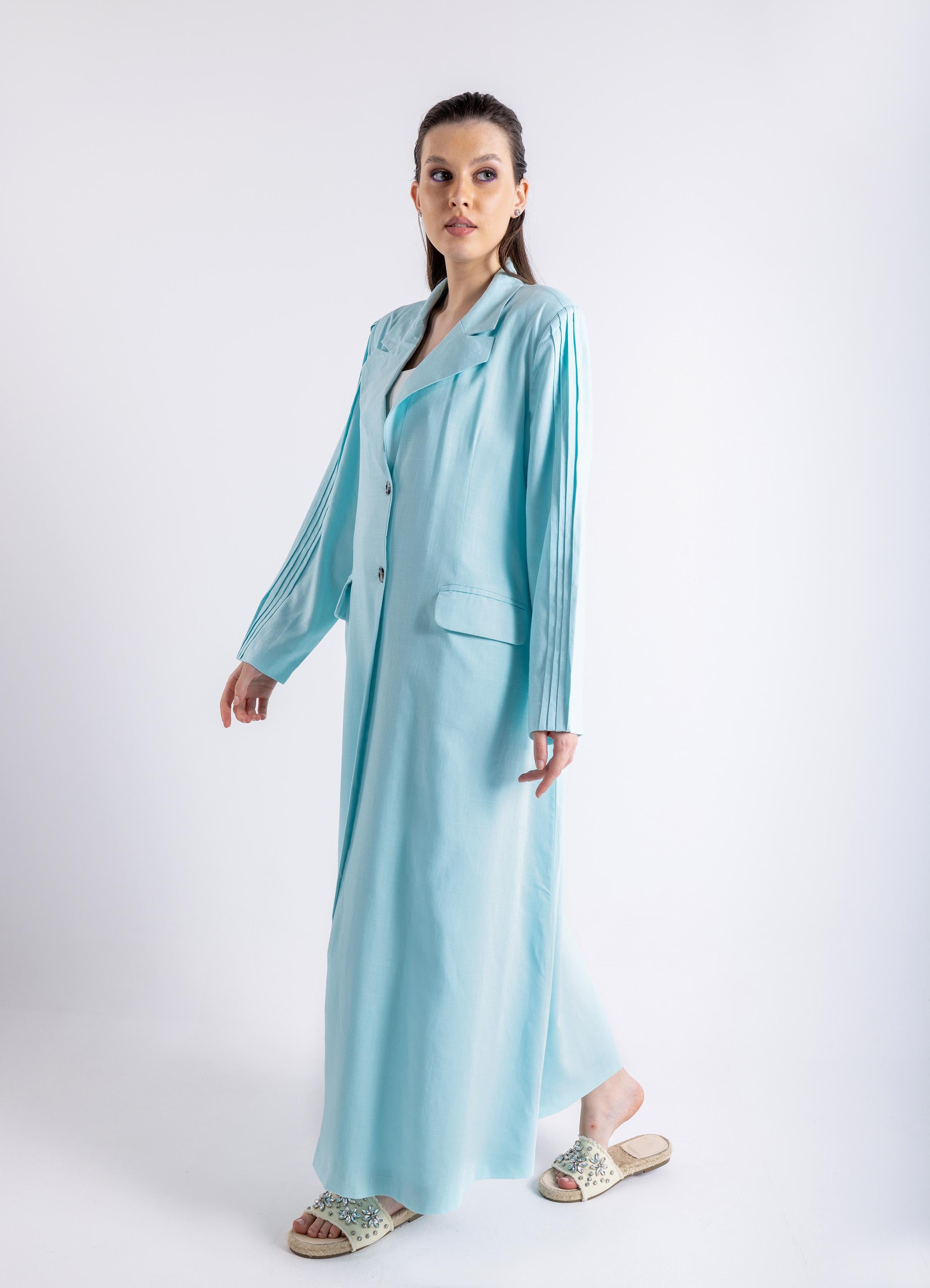 This light long coat features a relaxed, oversized fit with two front buttons for closure. The coat has deep pockets and large lapels, offering both a stylish and functional look. It is paired with a simple white top, jeans, and casual sneakers, making it perfect for a laid-back yet elegant street style.
