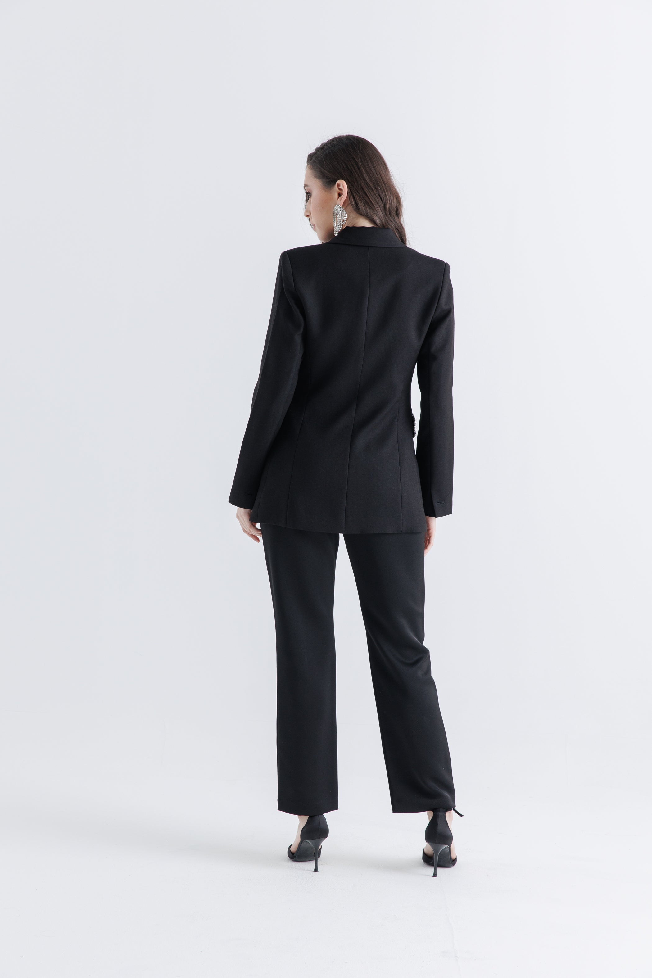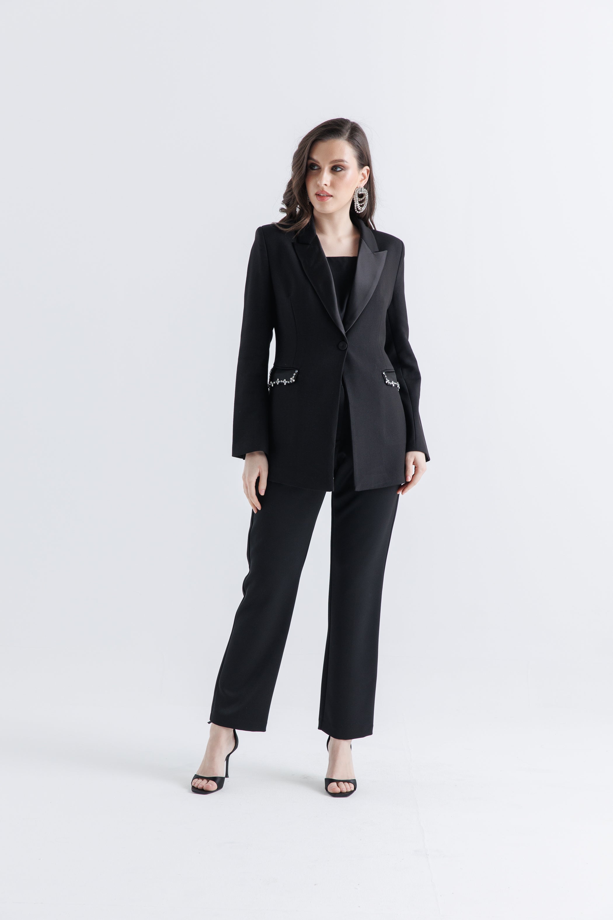 Description:Add a touch of modern elegance to your wardrobe with this structured long blazer featuring crystal-detailed flap...