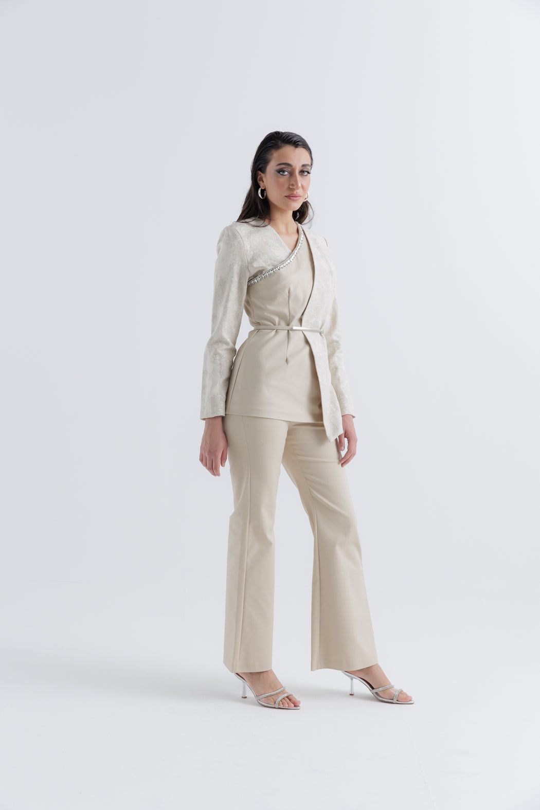 Make a statement with this embellished asymmetrical jacquard jacket, crafted for Ramadan and Eid celebrations. Featuring a structured silhouette with an elegant contrast panel, this design exudes modern sophistication. The asymmetrical neckline, adorned with sparkling embellishments, adds a touch of glamour, while the tailored fit enhances your figure. Finished with a sleek waist belt, this jacket offers both style and structure, making it a refined choice for special occasions.